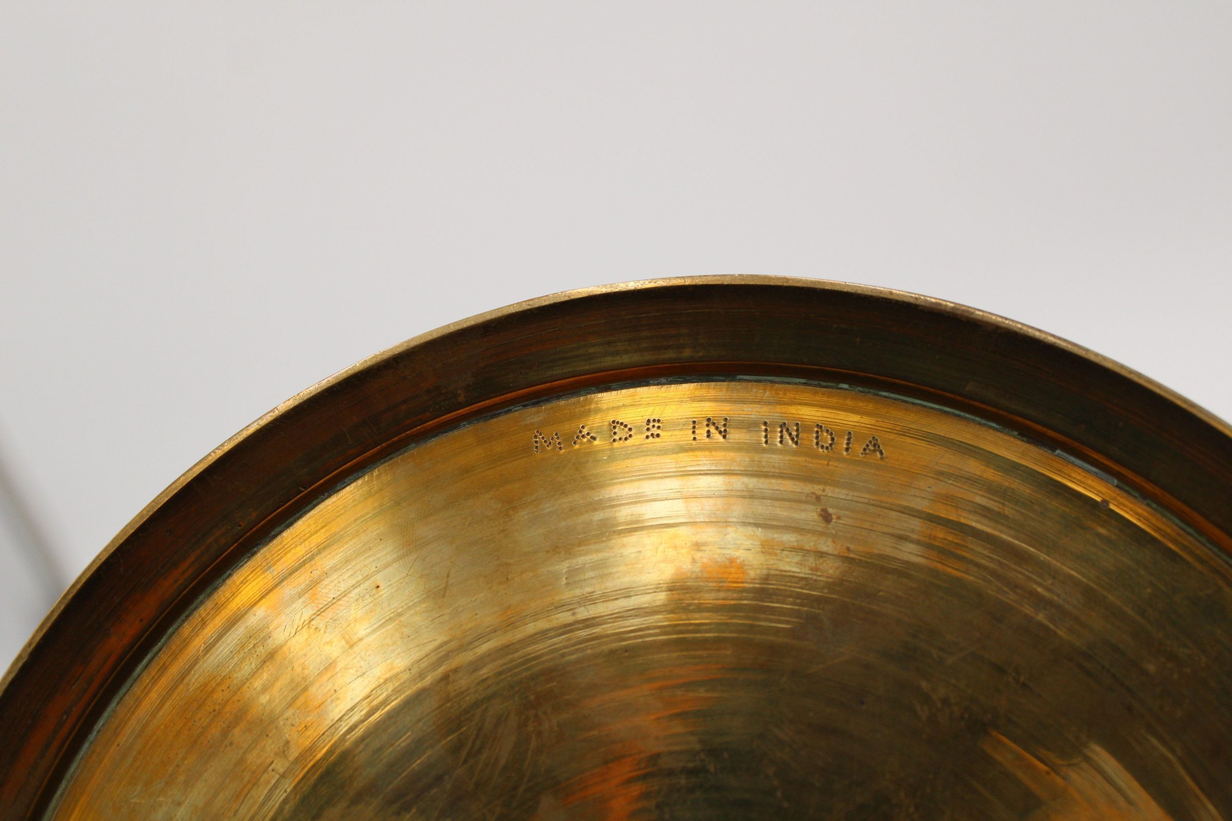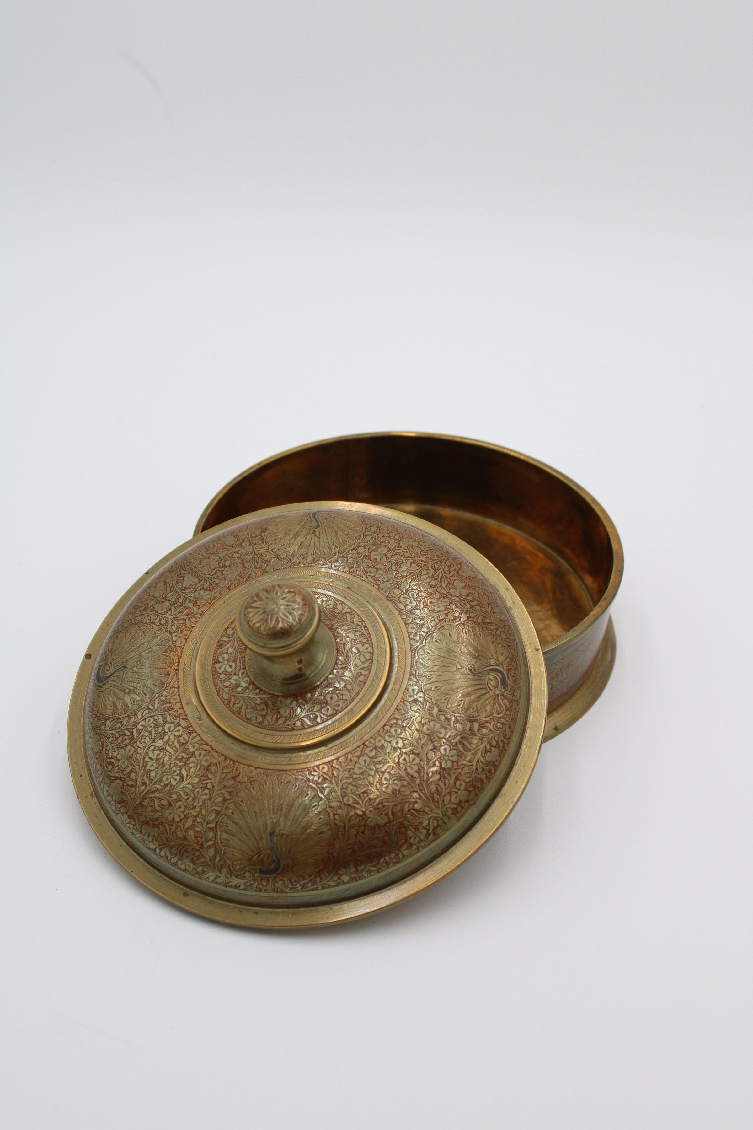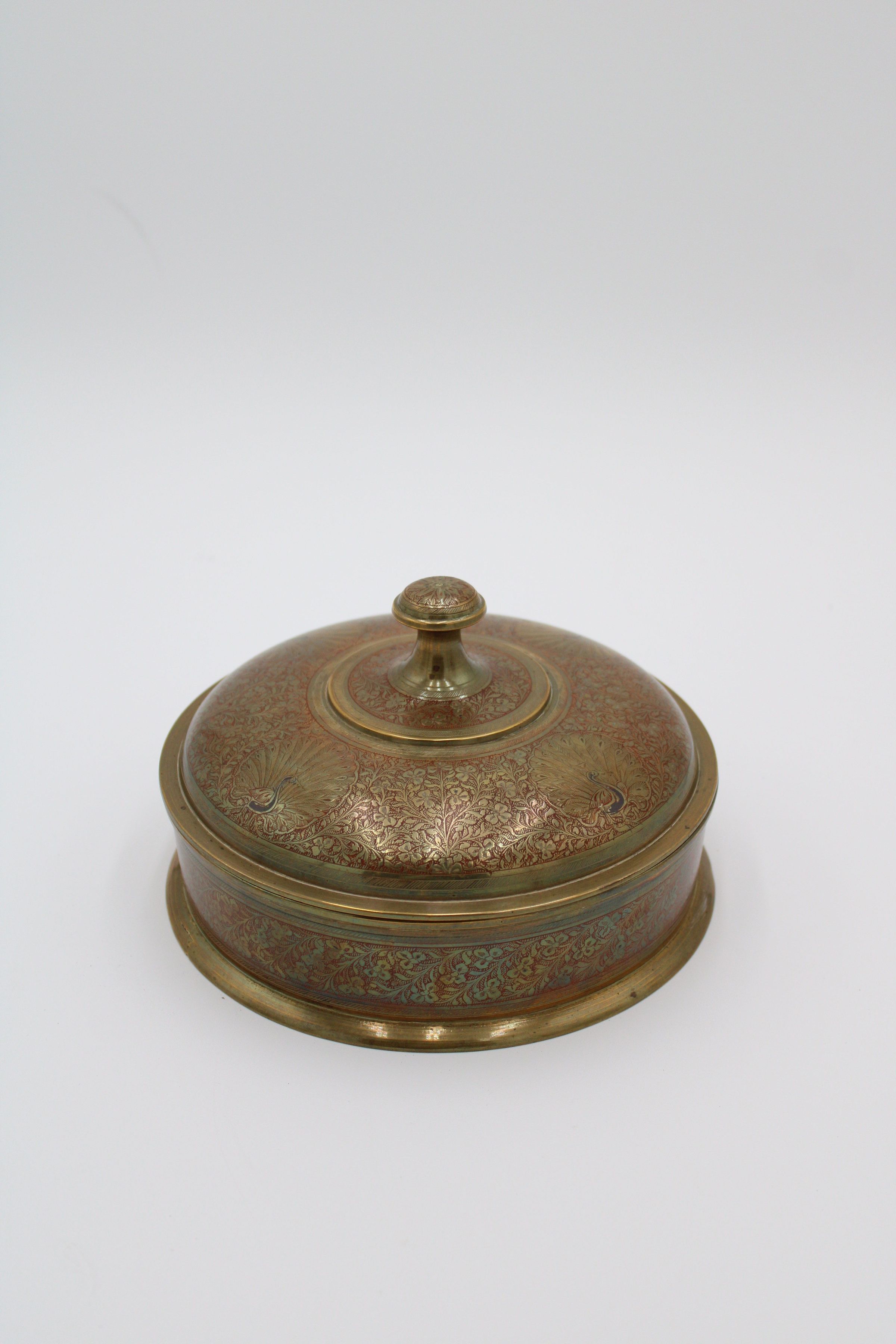 The image shows a large, shallow, brass-covered bowl adorned with an intricate red peacock motif, featuring a decorative lid.