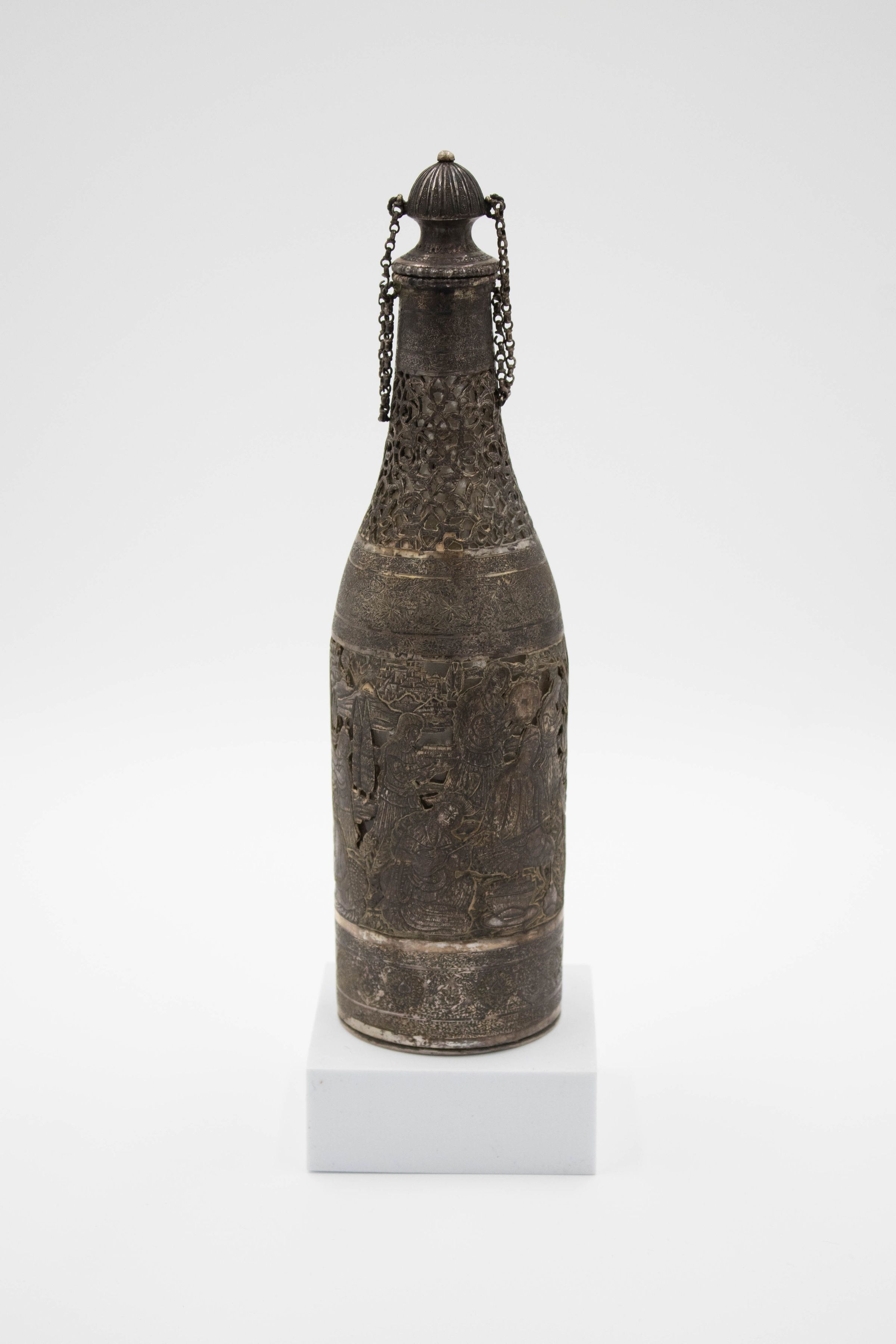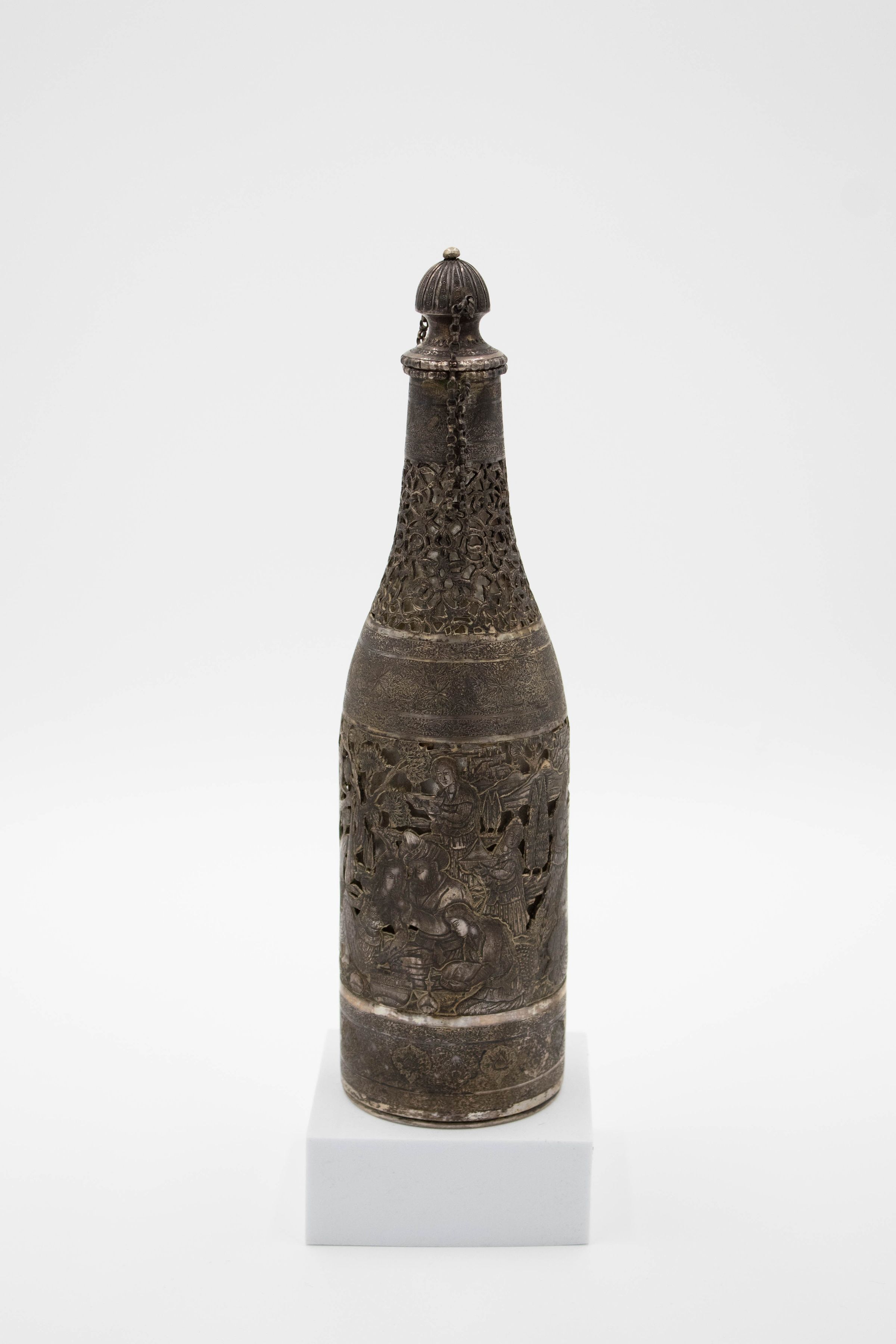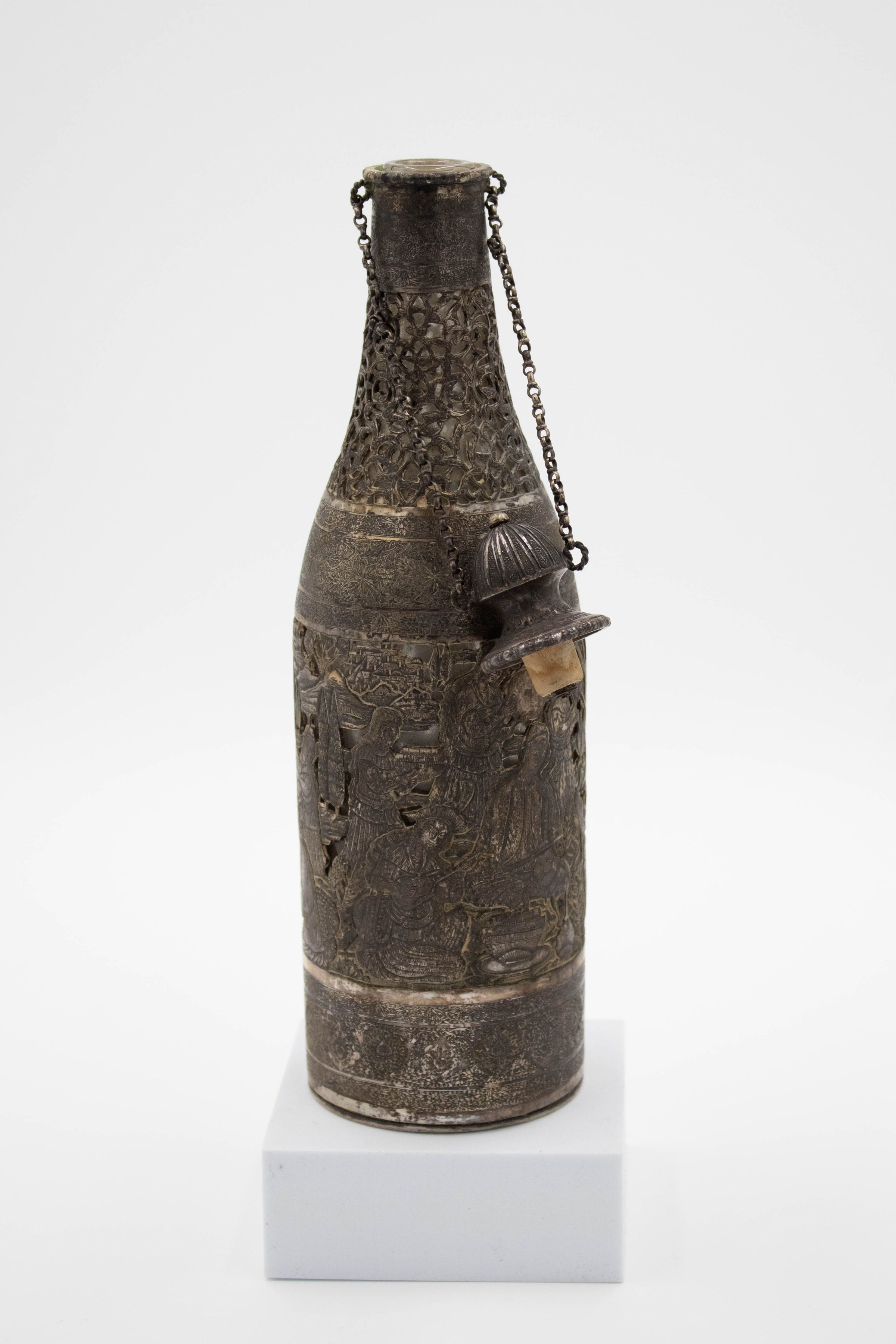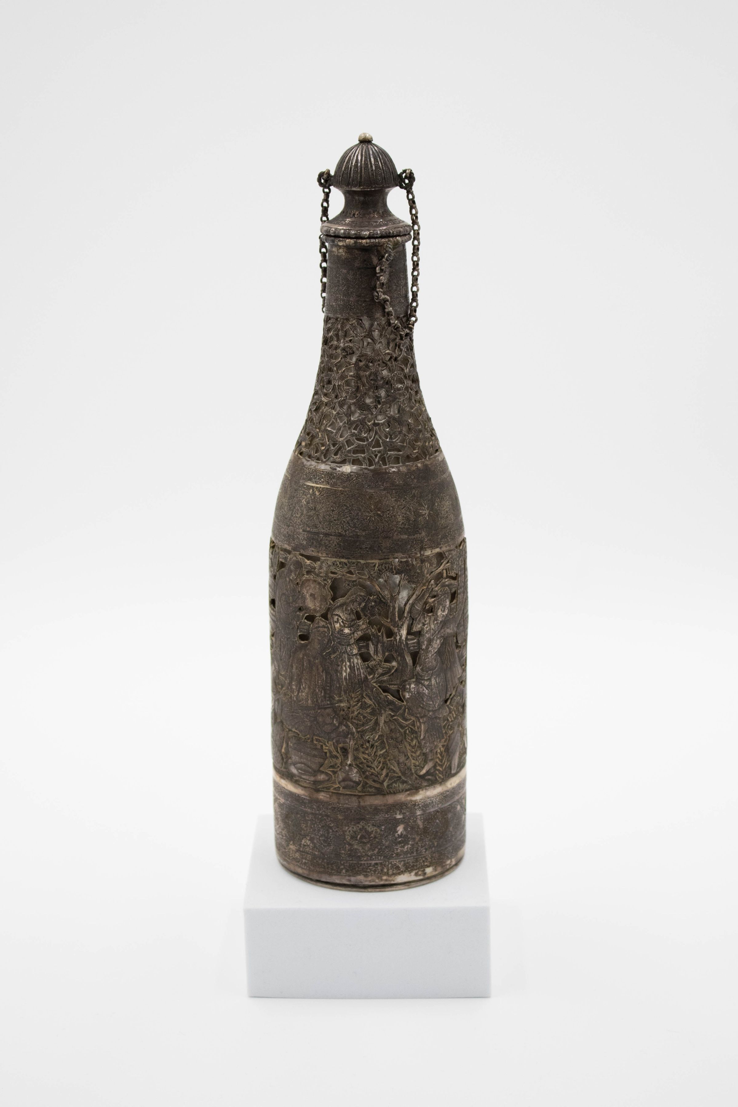 Silver bottle-shaped decanter with chain-attached lid depicting a Persian Banquet of Song and Dance.Context