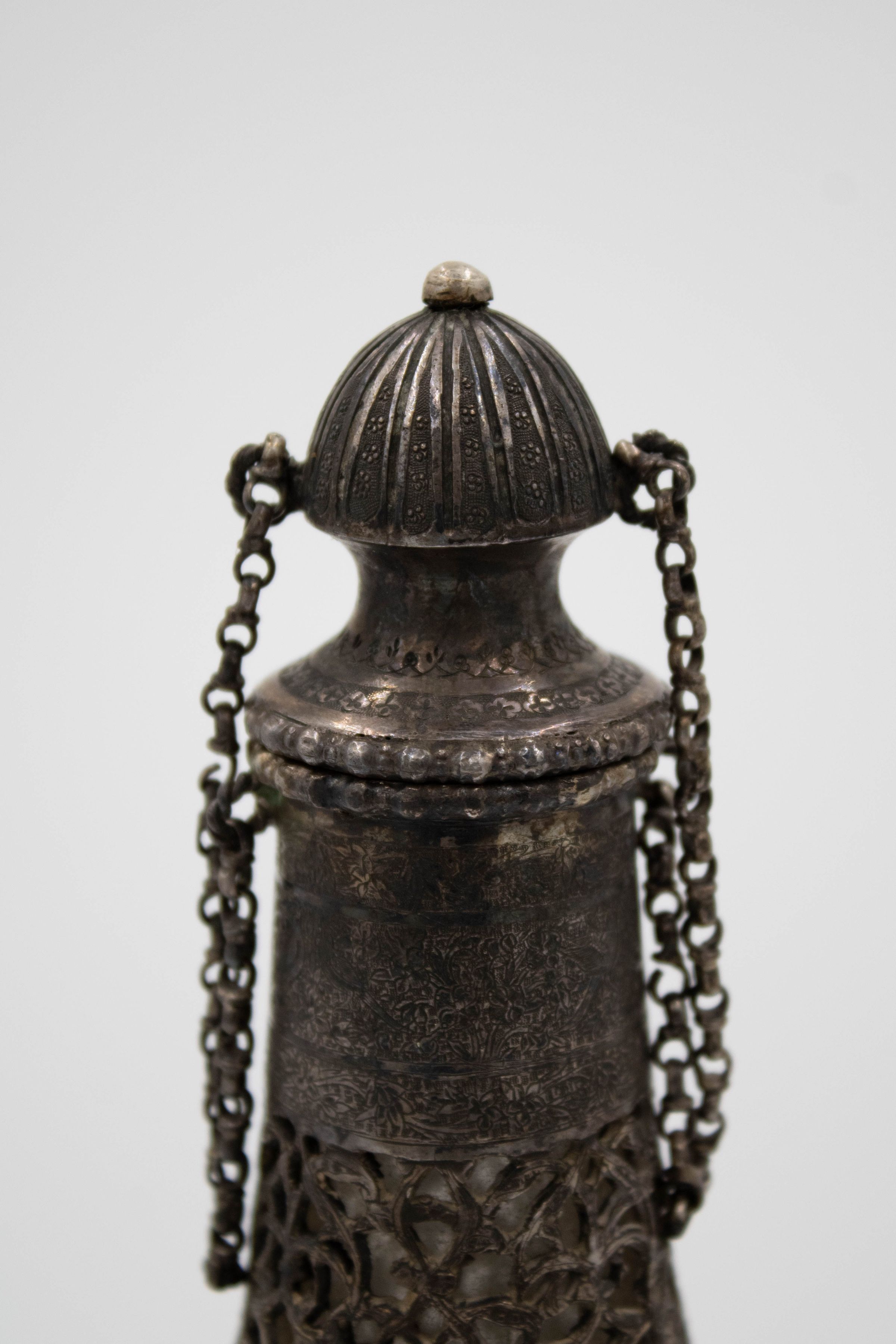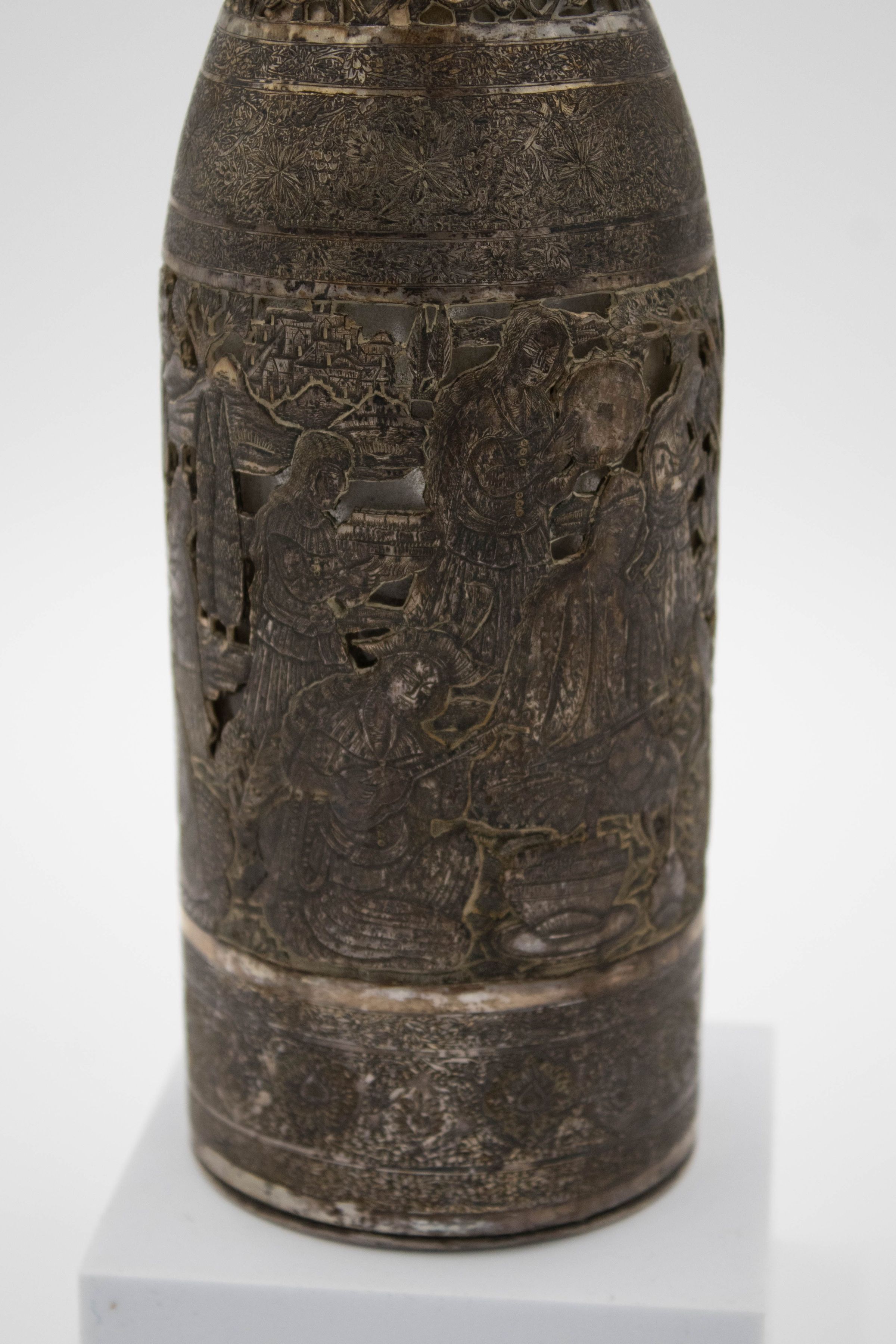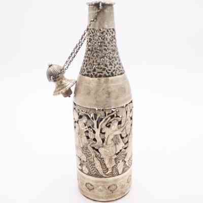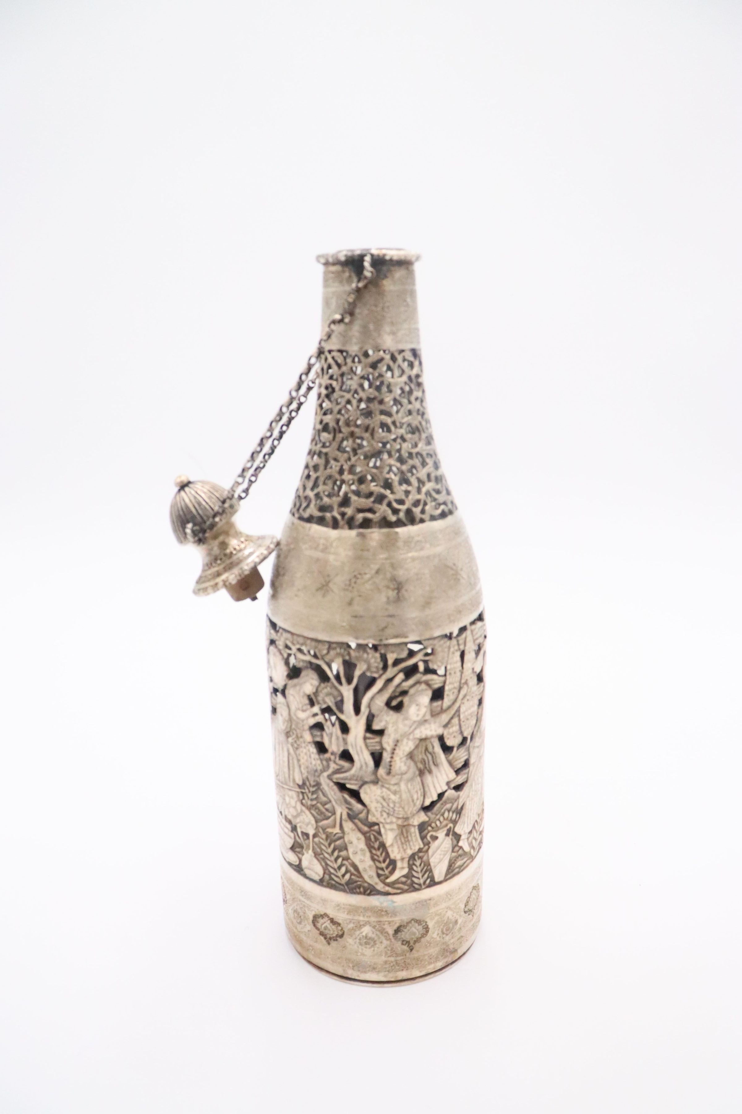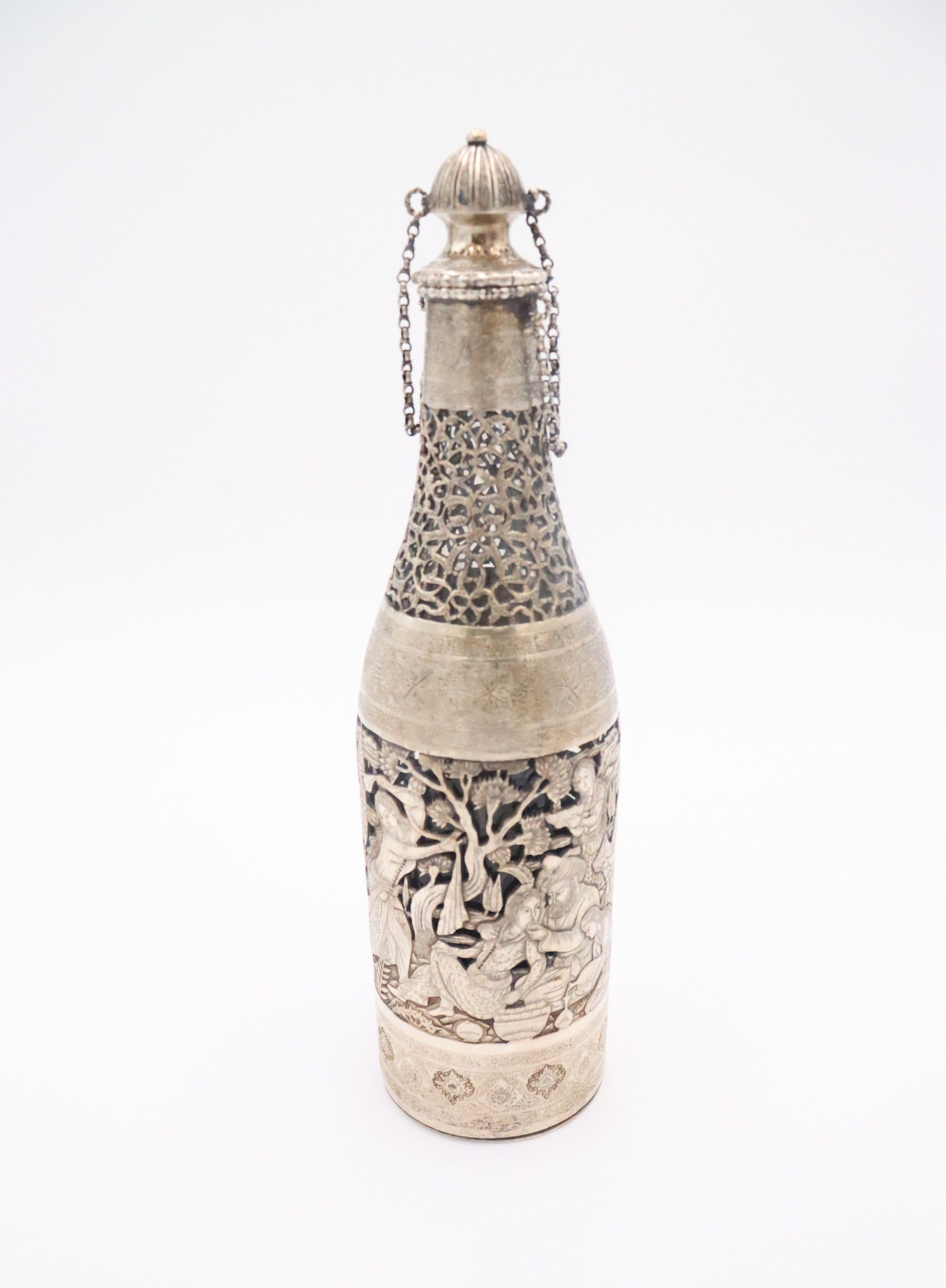 Silver bottle-shaped decanter with chain-attached lid depicting a Persian Banquet of Song and Dance.Context