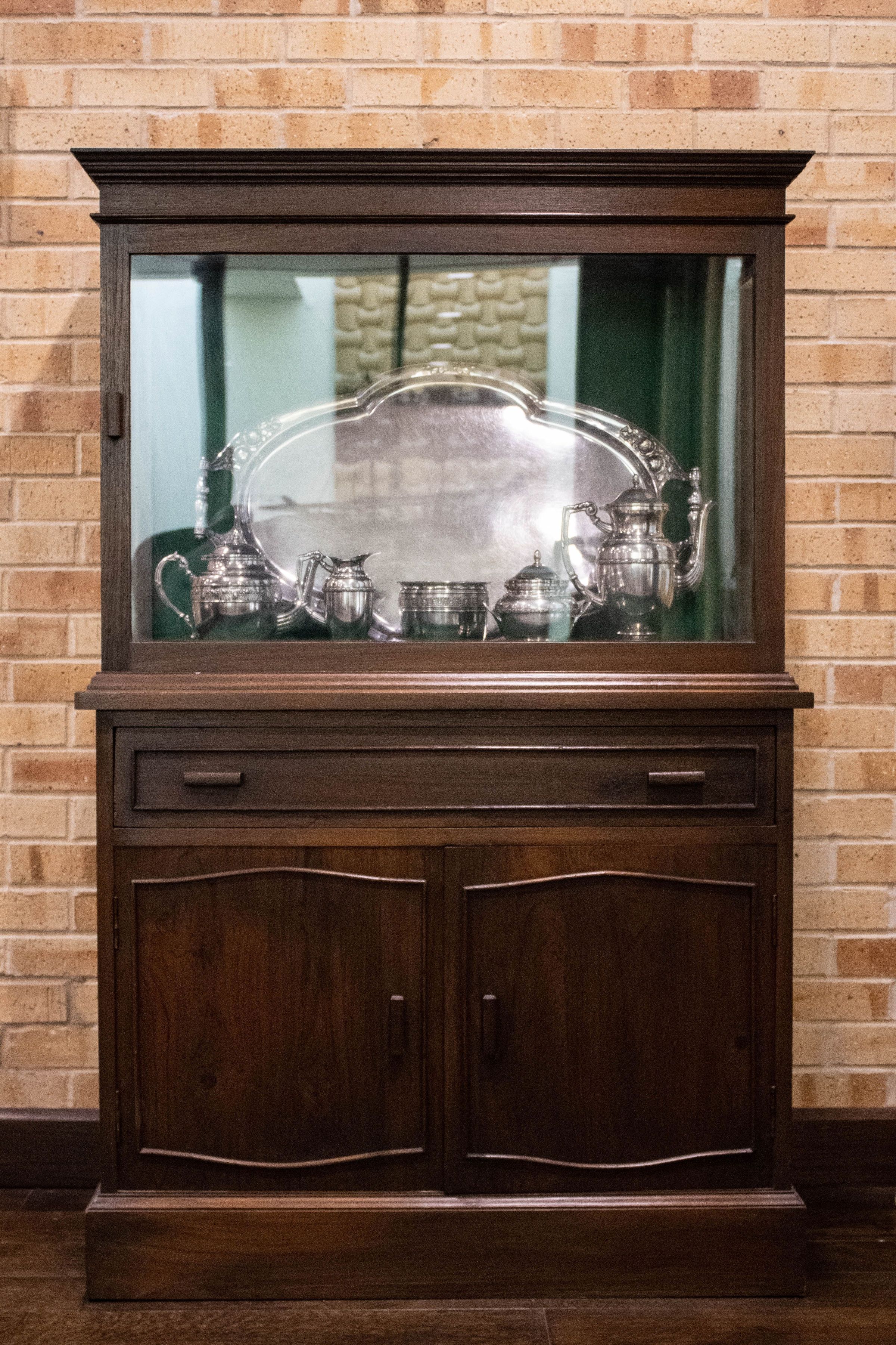 A large wooden case with a green felt back displays a silver serving set.