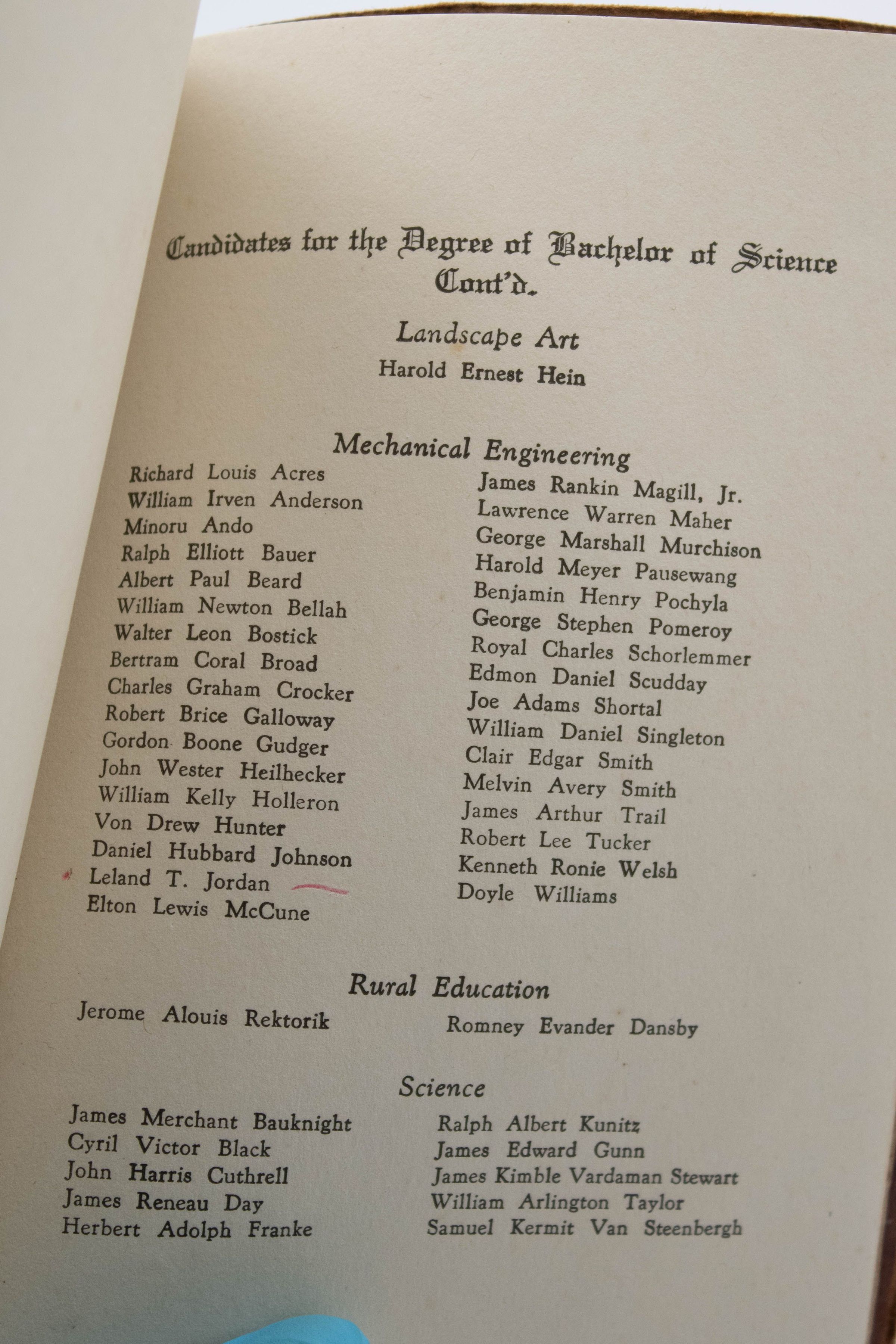 Leland Thomas Jordan graduated from A&M College of Texas, now Texas A&M University, in 1929. This commencement program is from the ceremony where he was awarded his Bachelor of Science in Mechanical Engineering.Ethnography