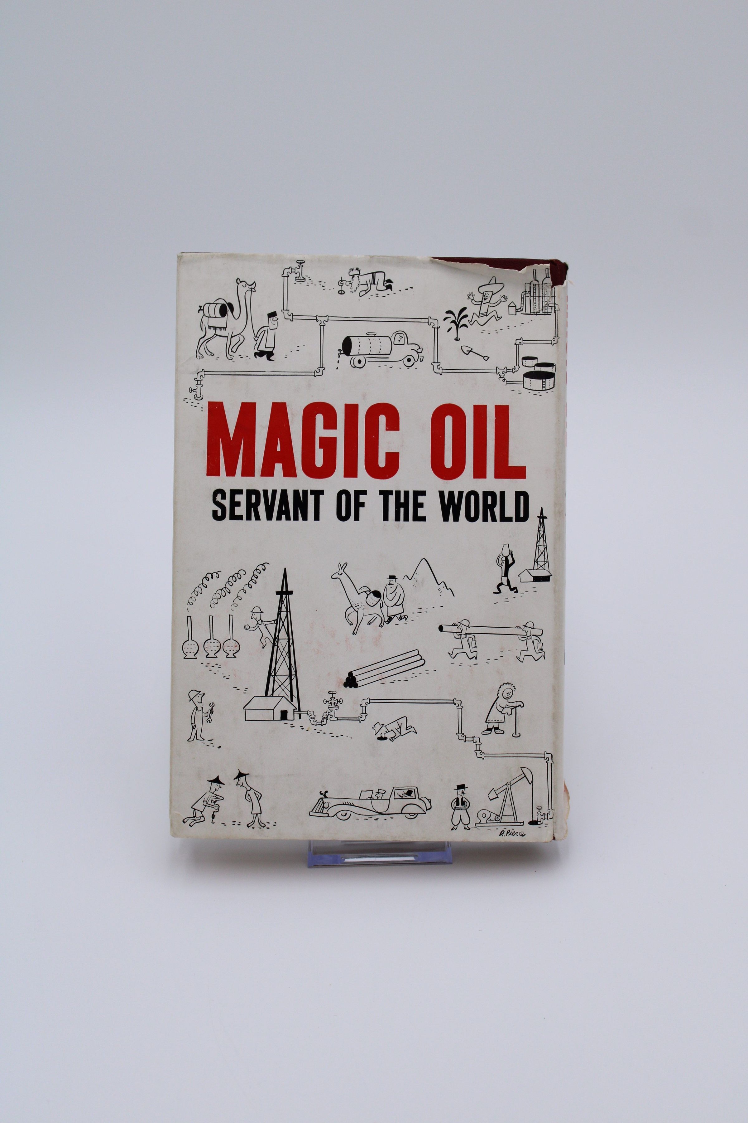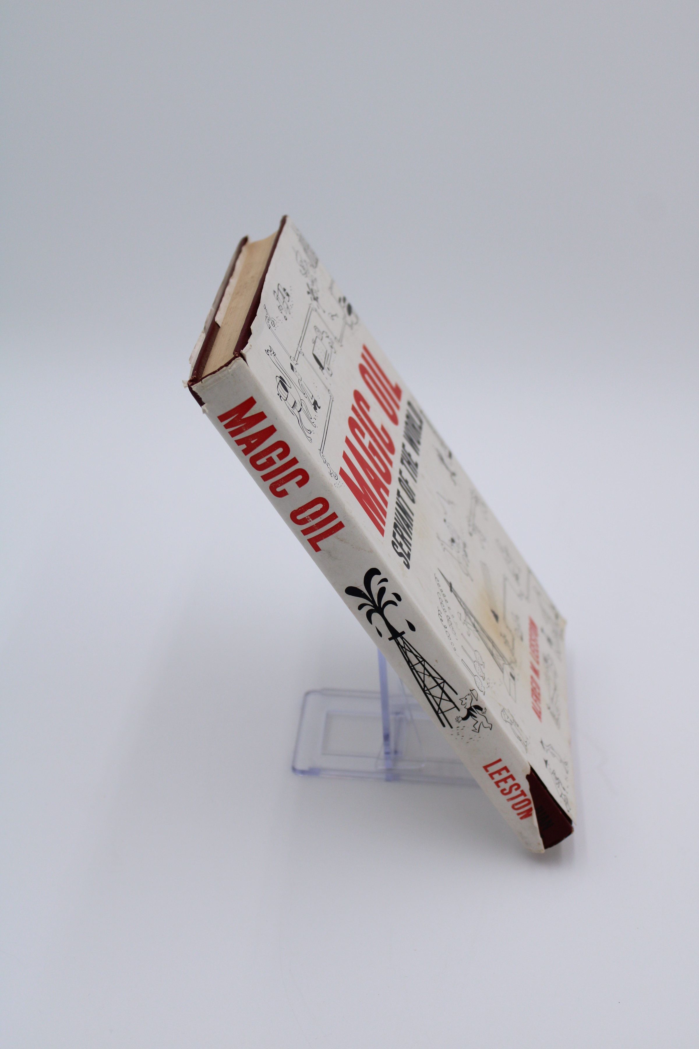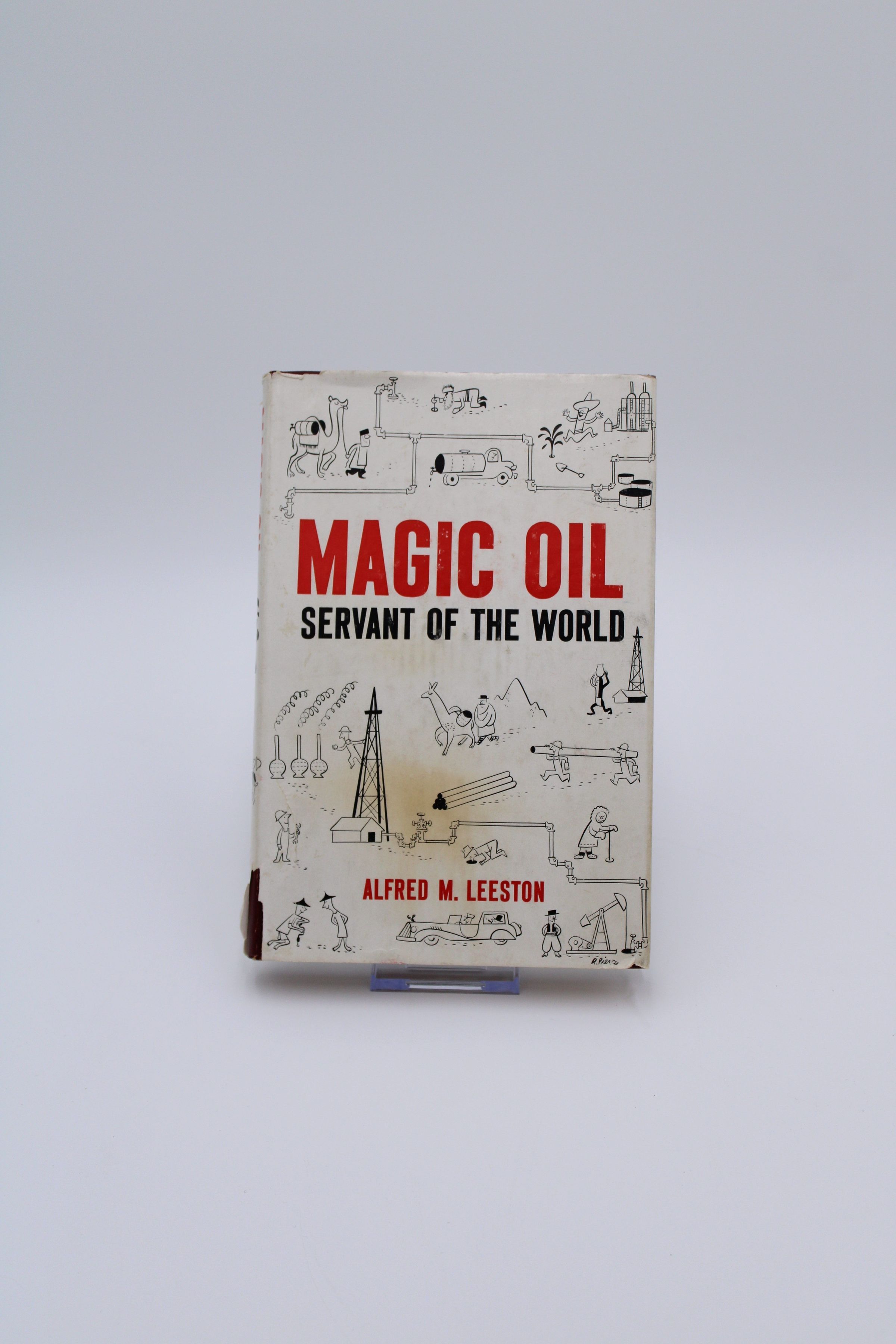 The front cover of "Magic Oil" has simple drawings of different rigs, drills, and parts of oil production. In big bold letters, it says "Magic Oil: Servant of the World, Alfred M. Leeston."