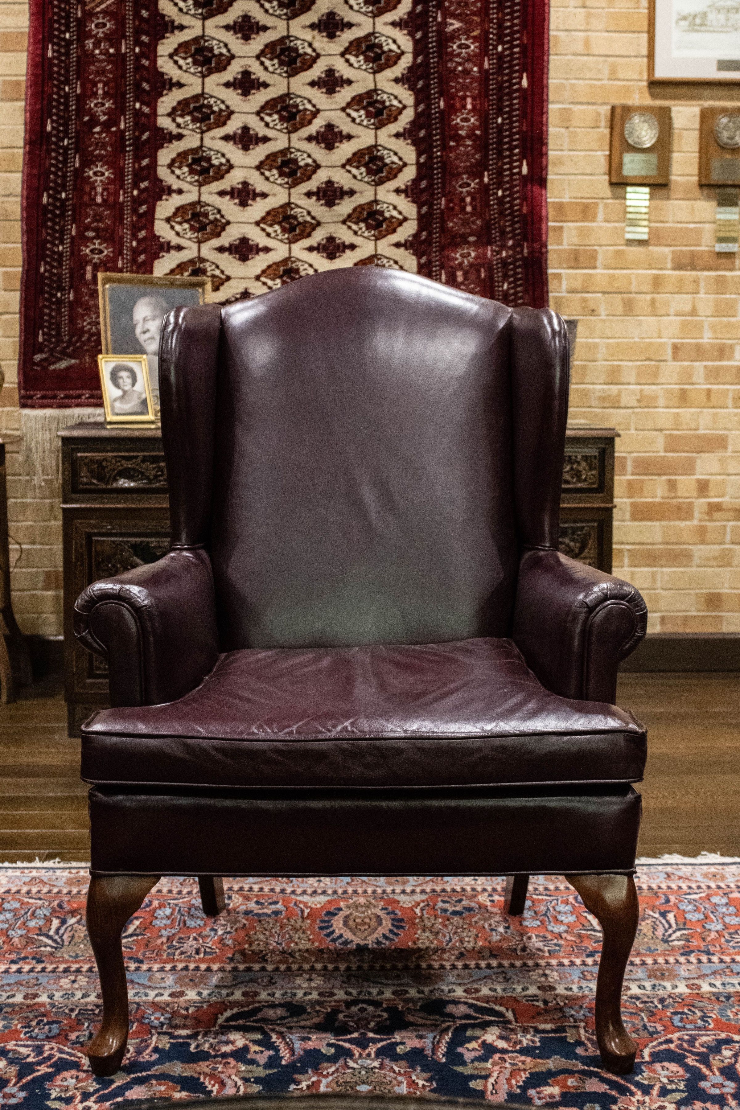 A maroon leather wingback chair.