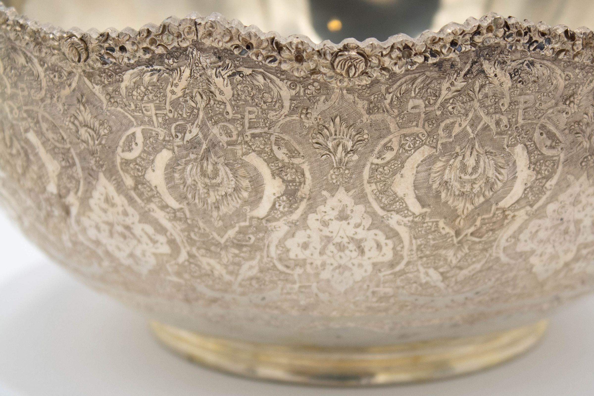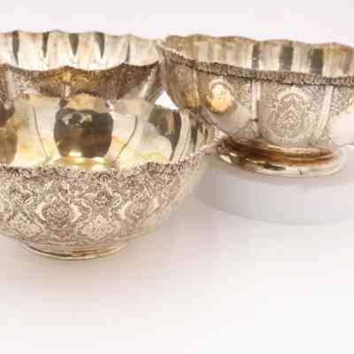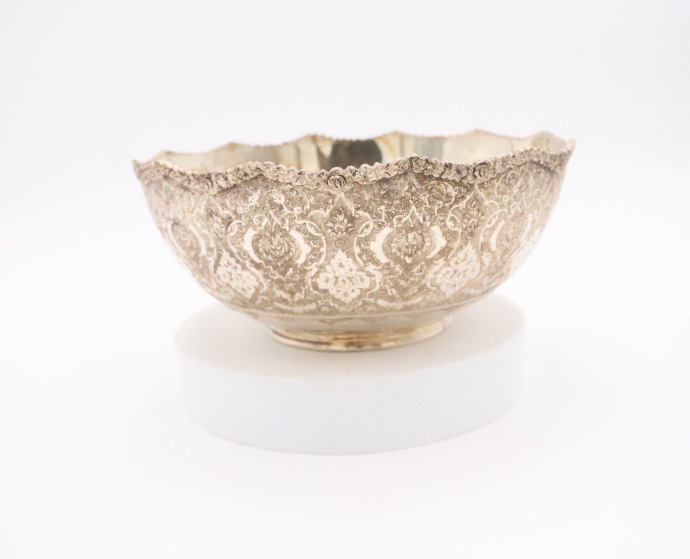 The medium-sized silver bowl features intricate etching and a scalloped edge design.