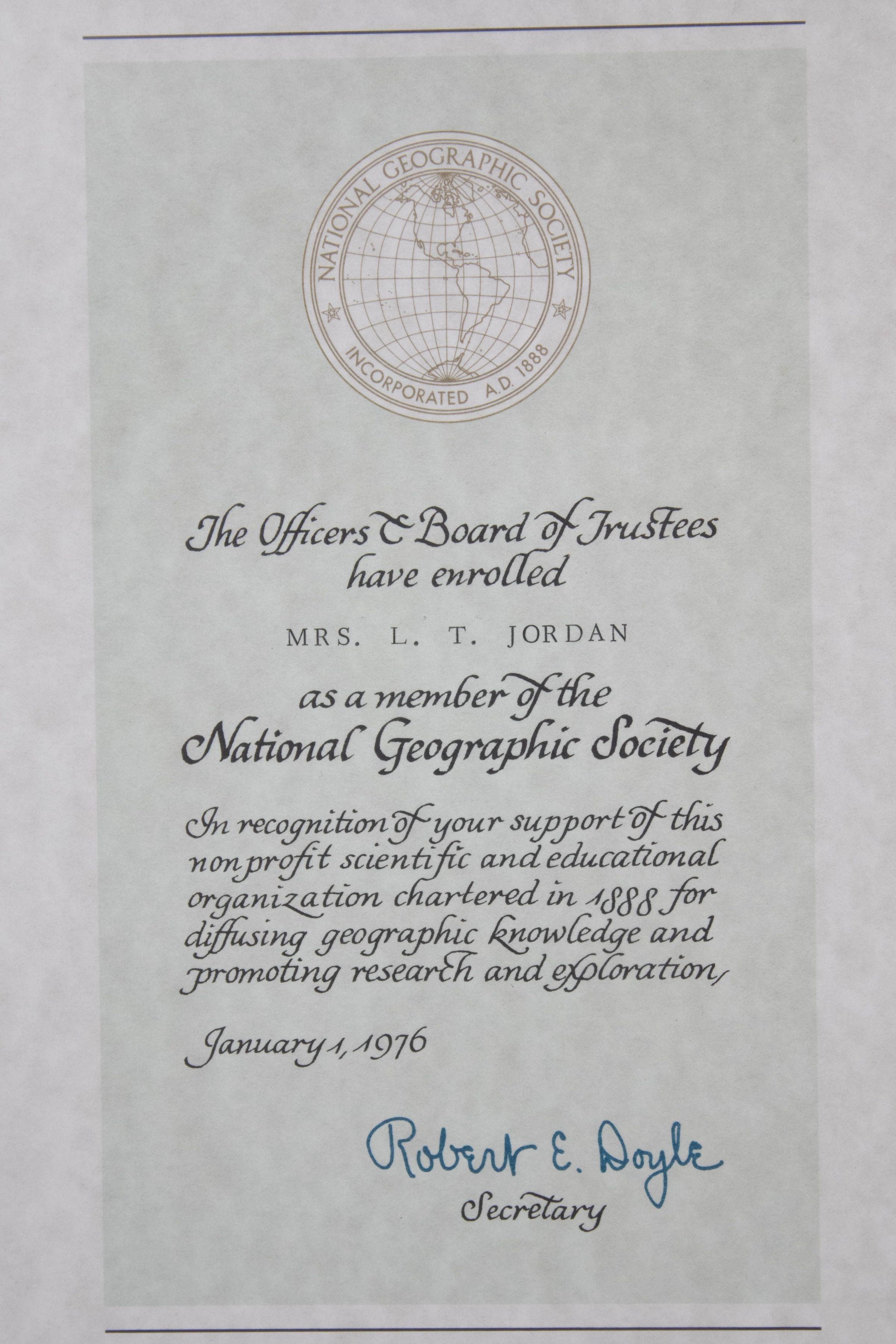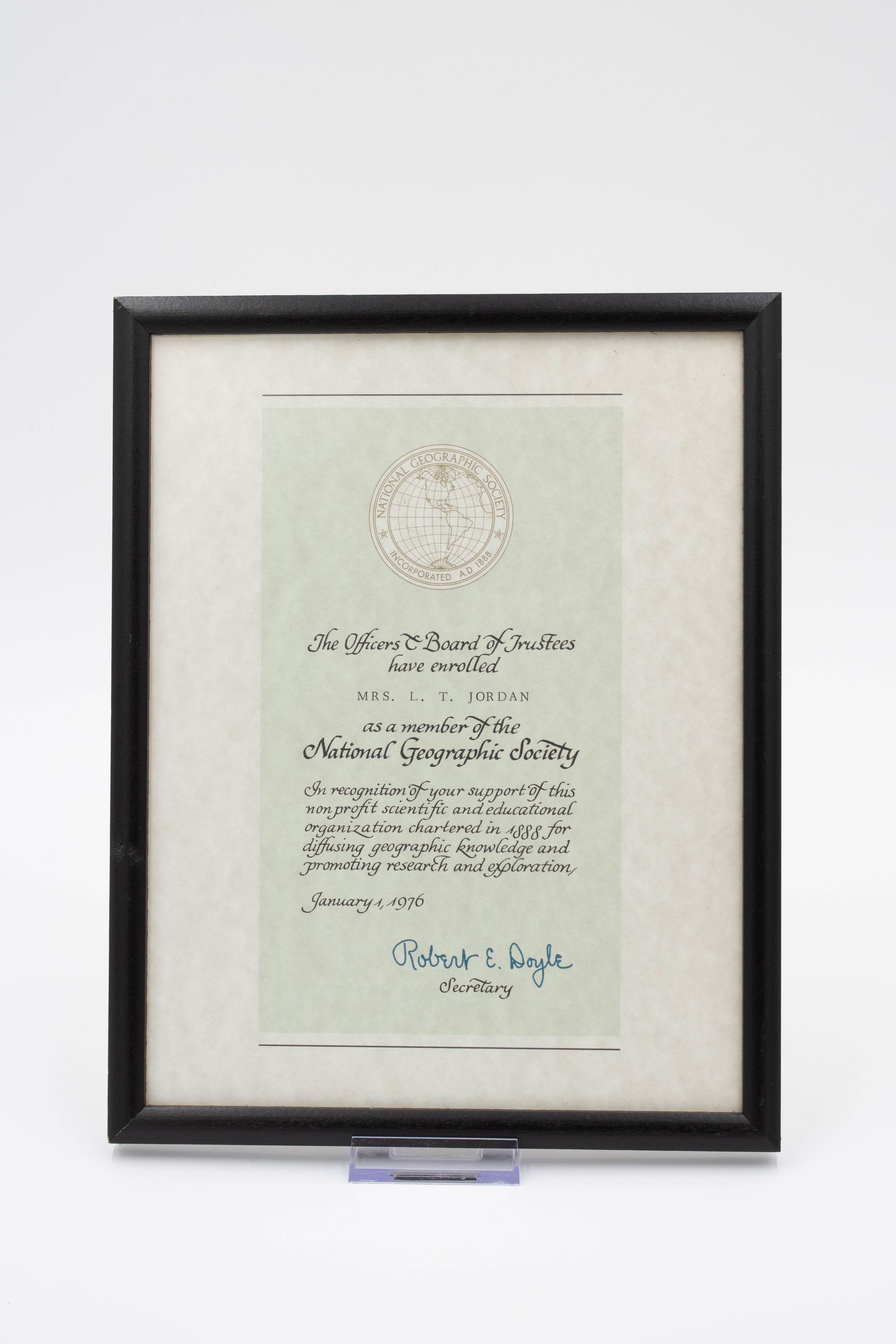 Image of the certificate in a glass case with a black wood frame. The certificate welcomes Mrs. L.T. Jordan into the National Geographic Society as a member for her support of the organization. It is dated January 1, 1976. Mild foxing/discoloration gives the paper a cloudy appearance.