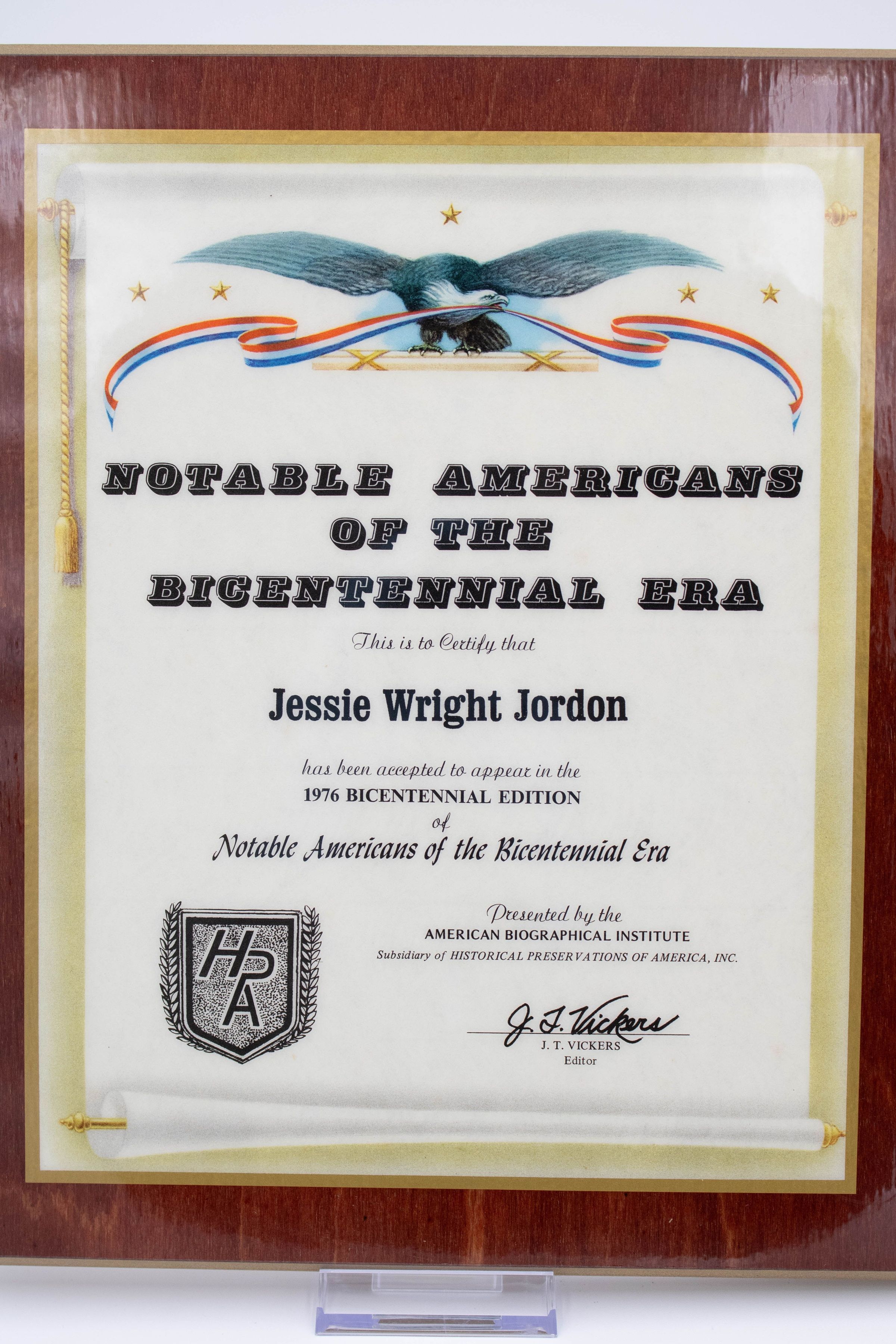Image of a plaque that recognizes Leland Thomas Jordan as a notable American in the Bicentennial Era. The surface of the certificate has a sheen and it has a brown wood border. An eagle with its wings stretched out and with a red, white, and blue banner in its beak accompanies the top of the certificate.