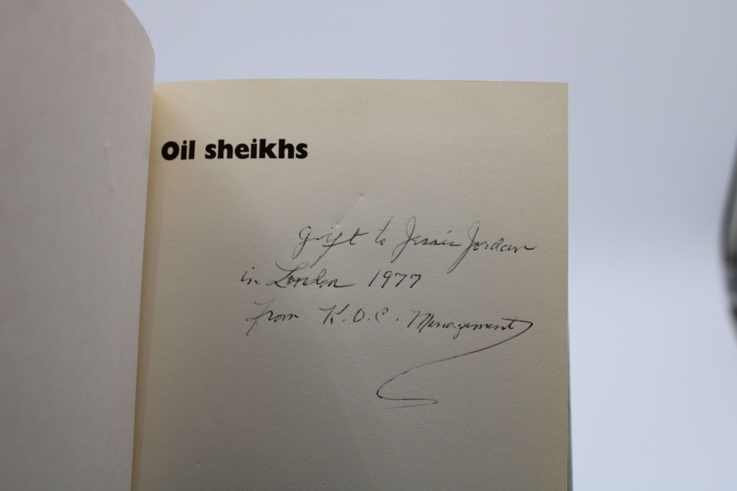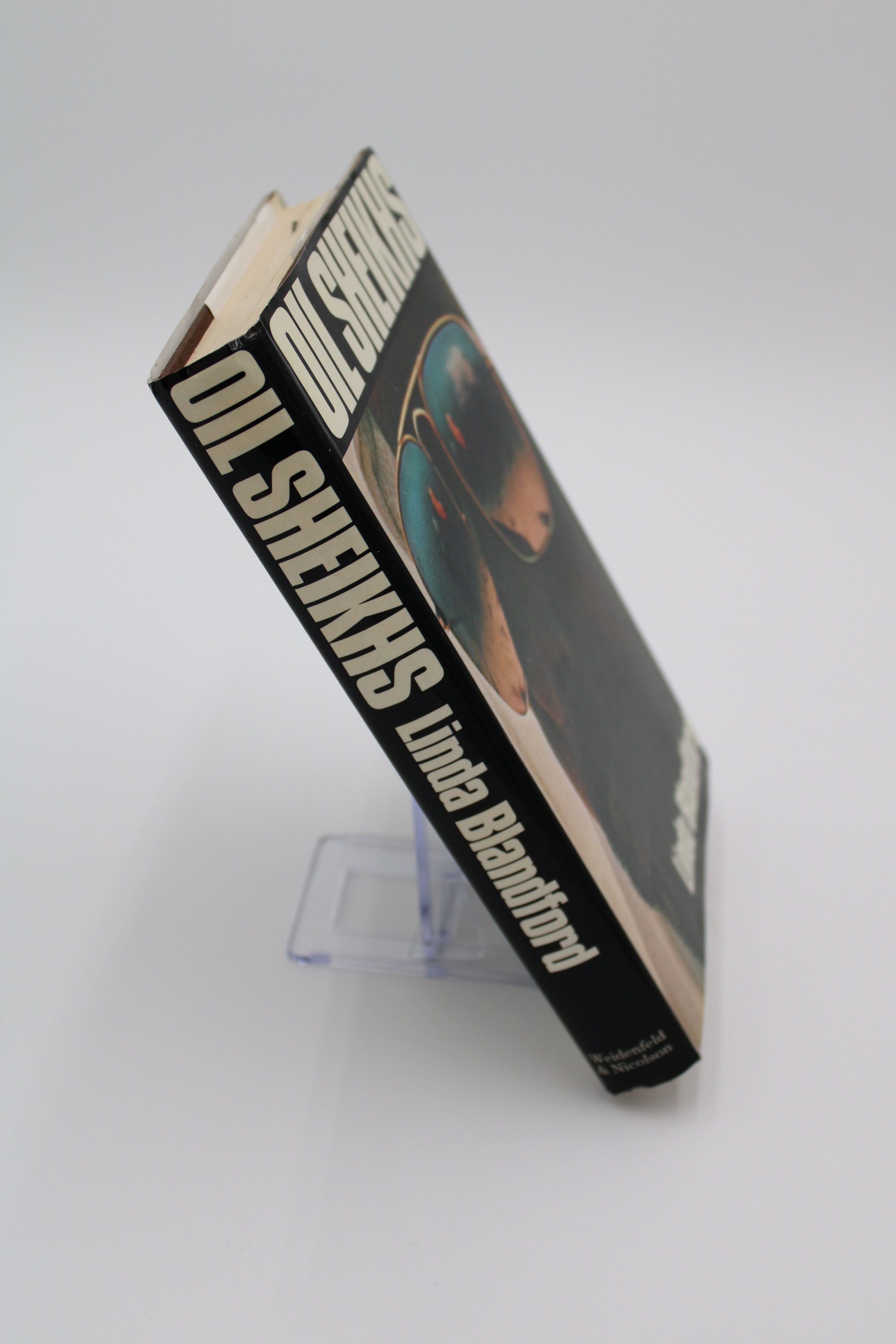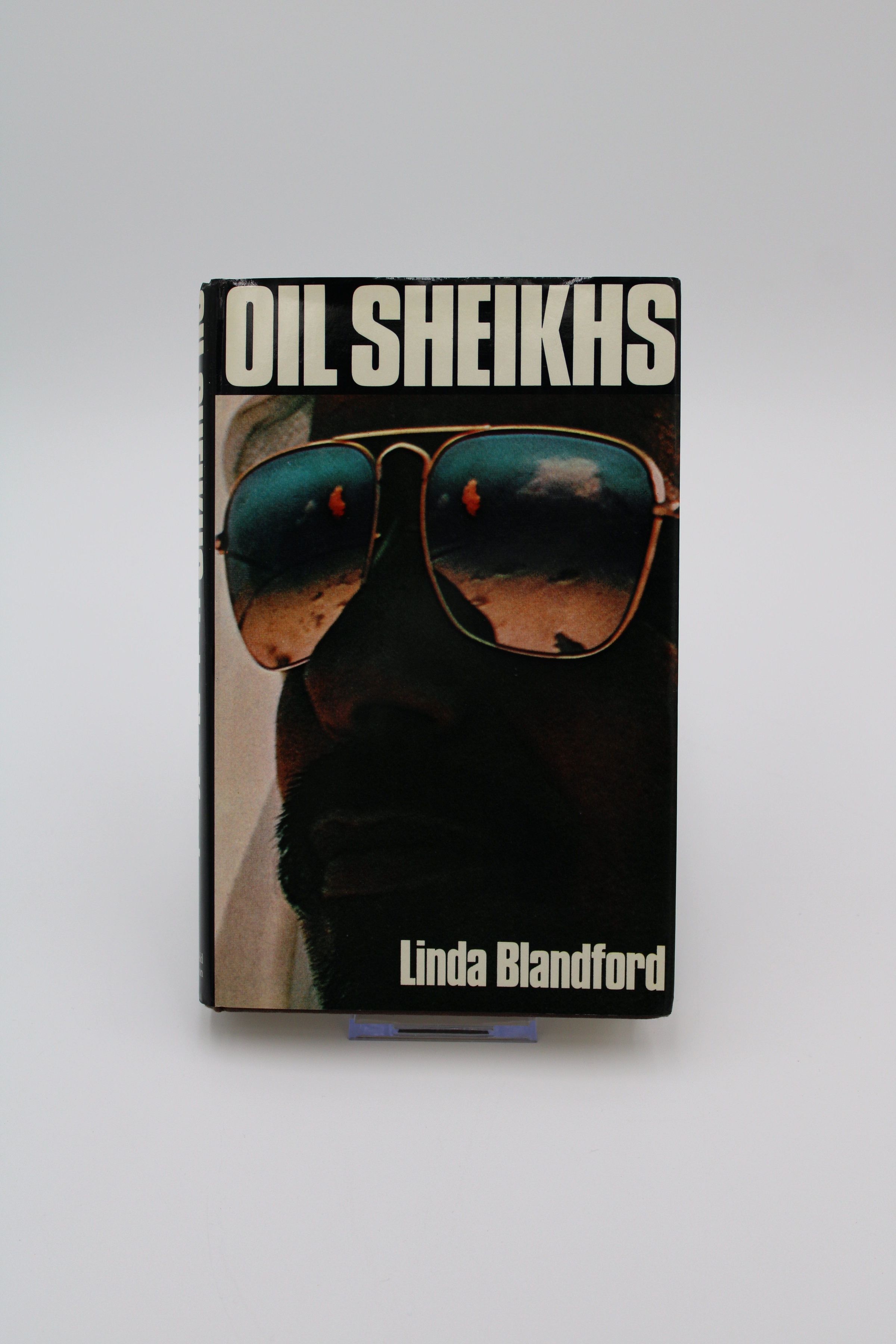 The cover of "Oil Sheikhs" has a very close-up image of a middle eastern man wearing a keffiyeh and reflective sunglasses.