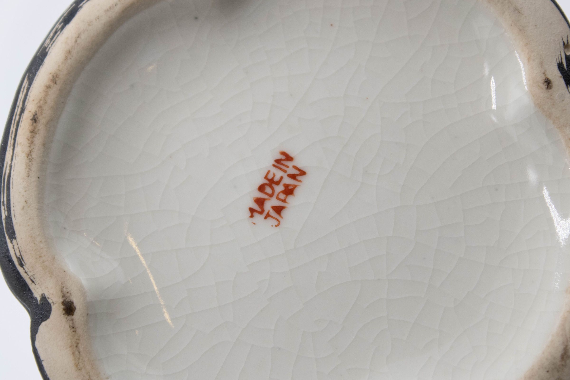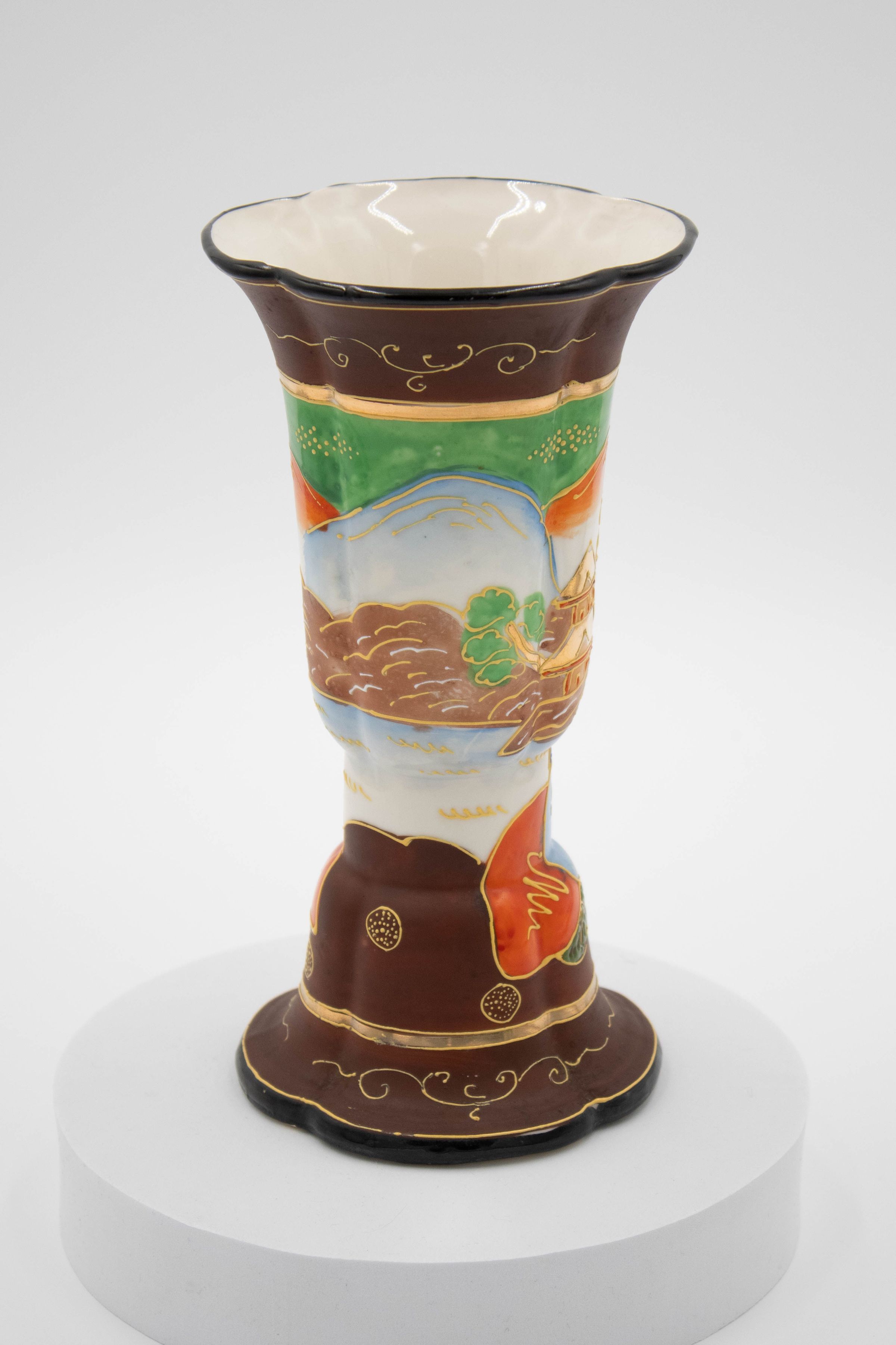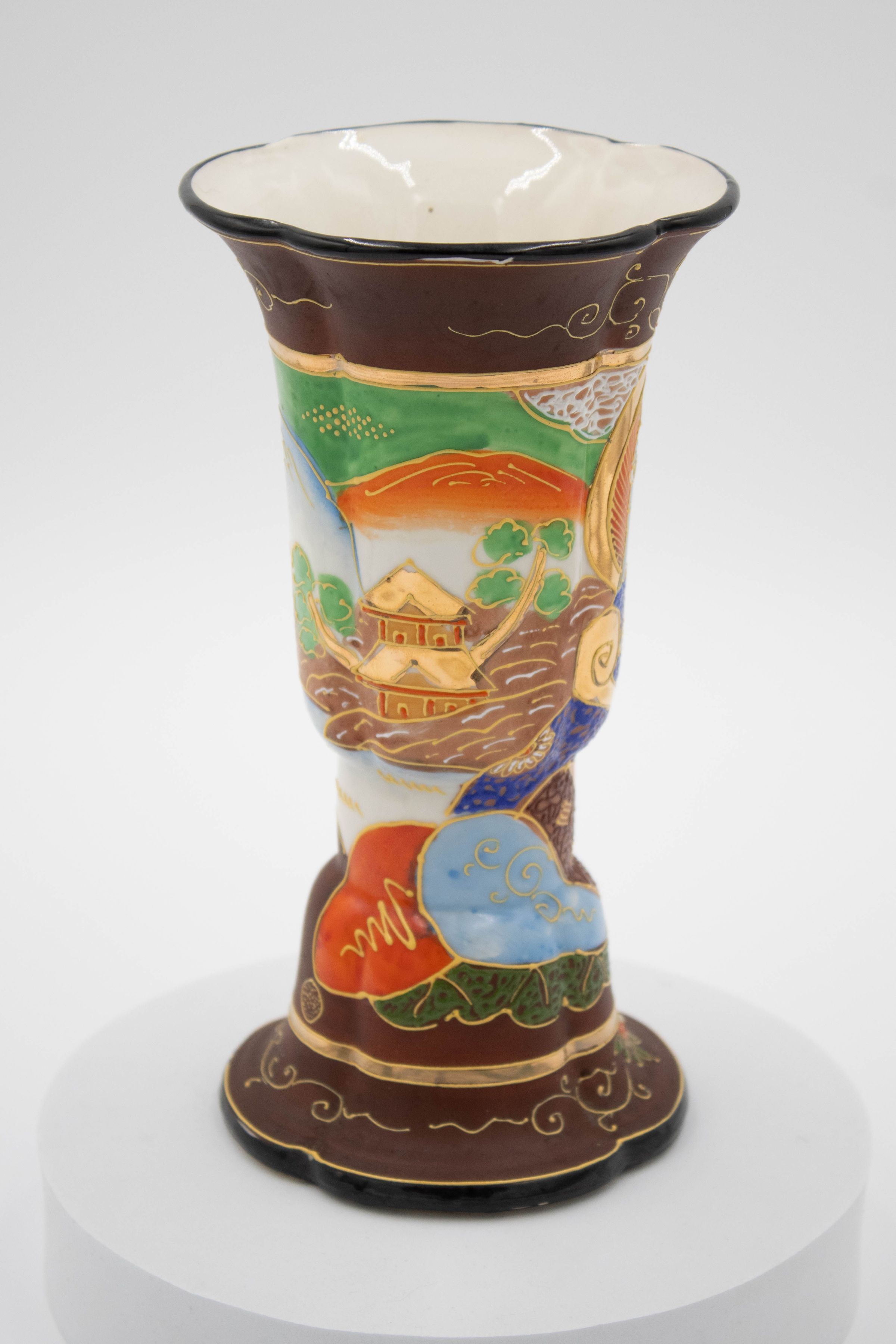 Japanese painted porcelain vase with white interior and multicolored exterior scene with a woman and temple. The piece has a faux-cloisonne look with raised gold lines in-between the different colors. The “Made in Japan” mark on the bottom is indicative of art from Japan after 1941, but before the period of occupation after World War II (1945-1952).Context