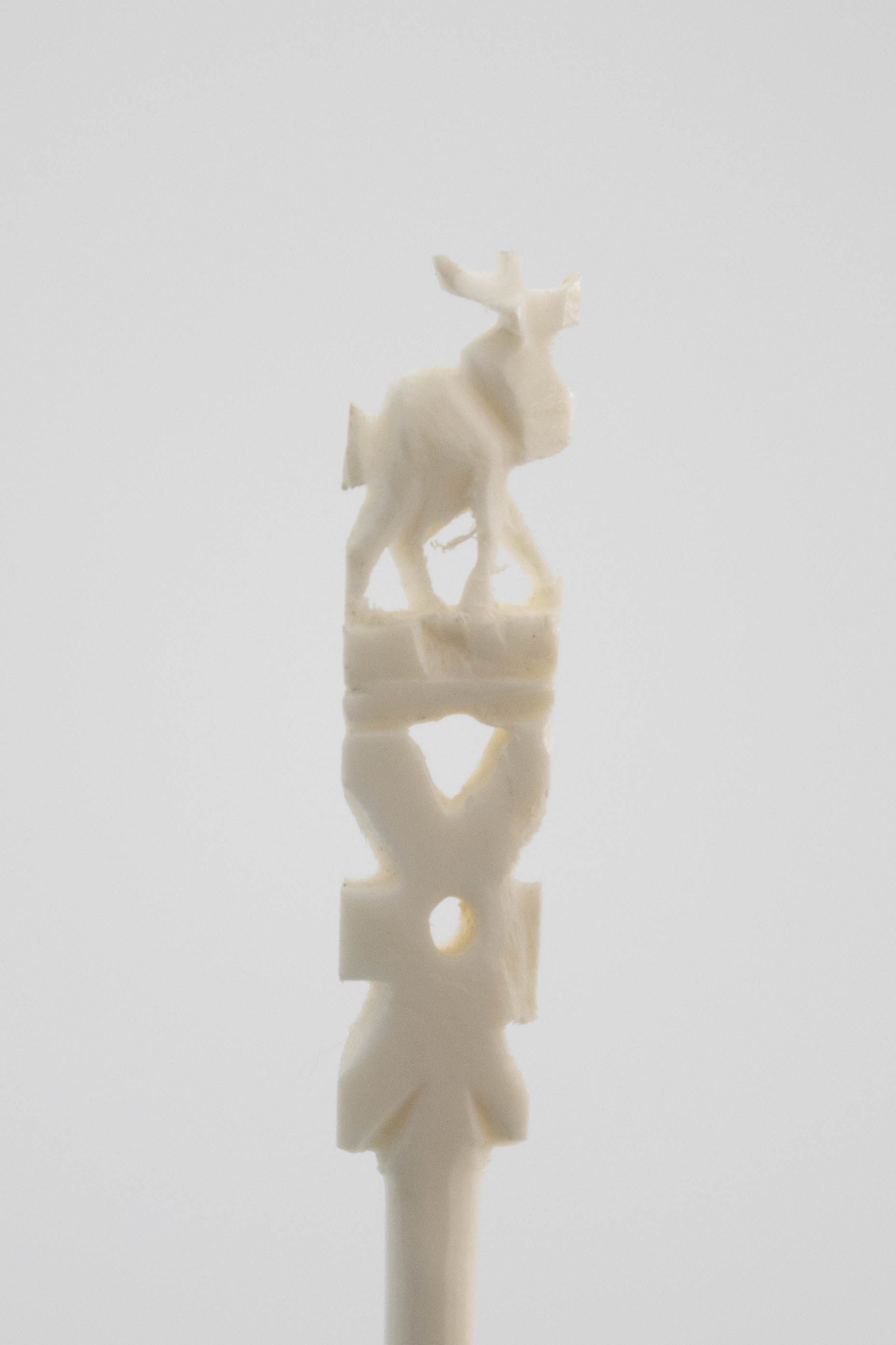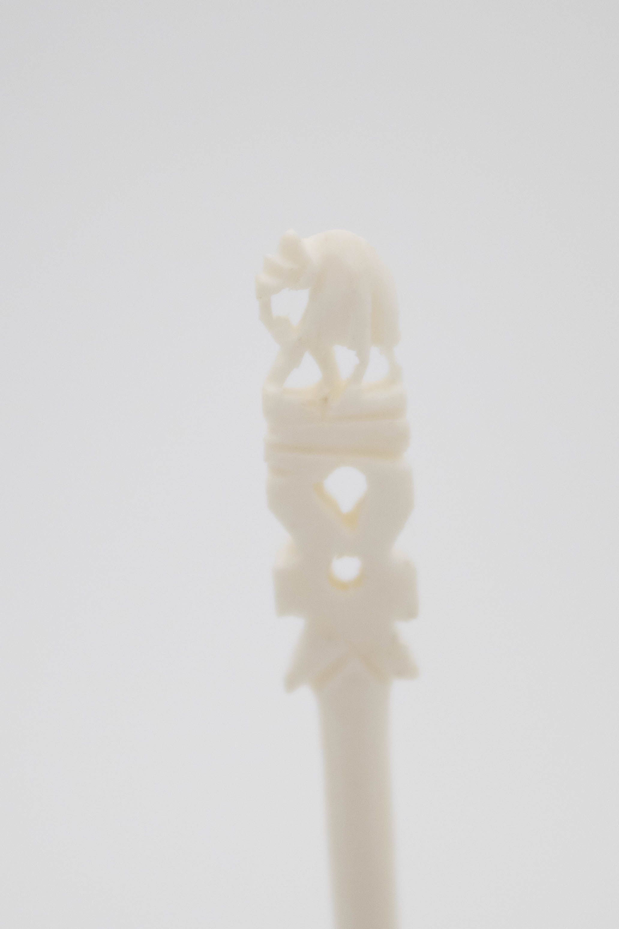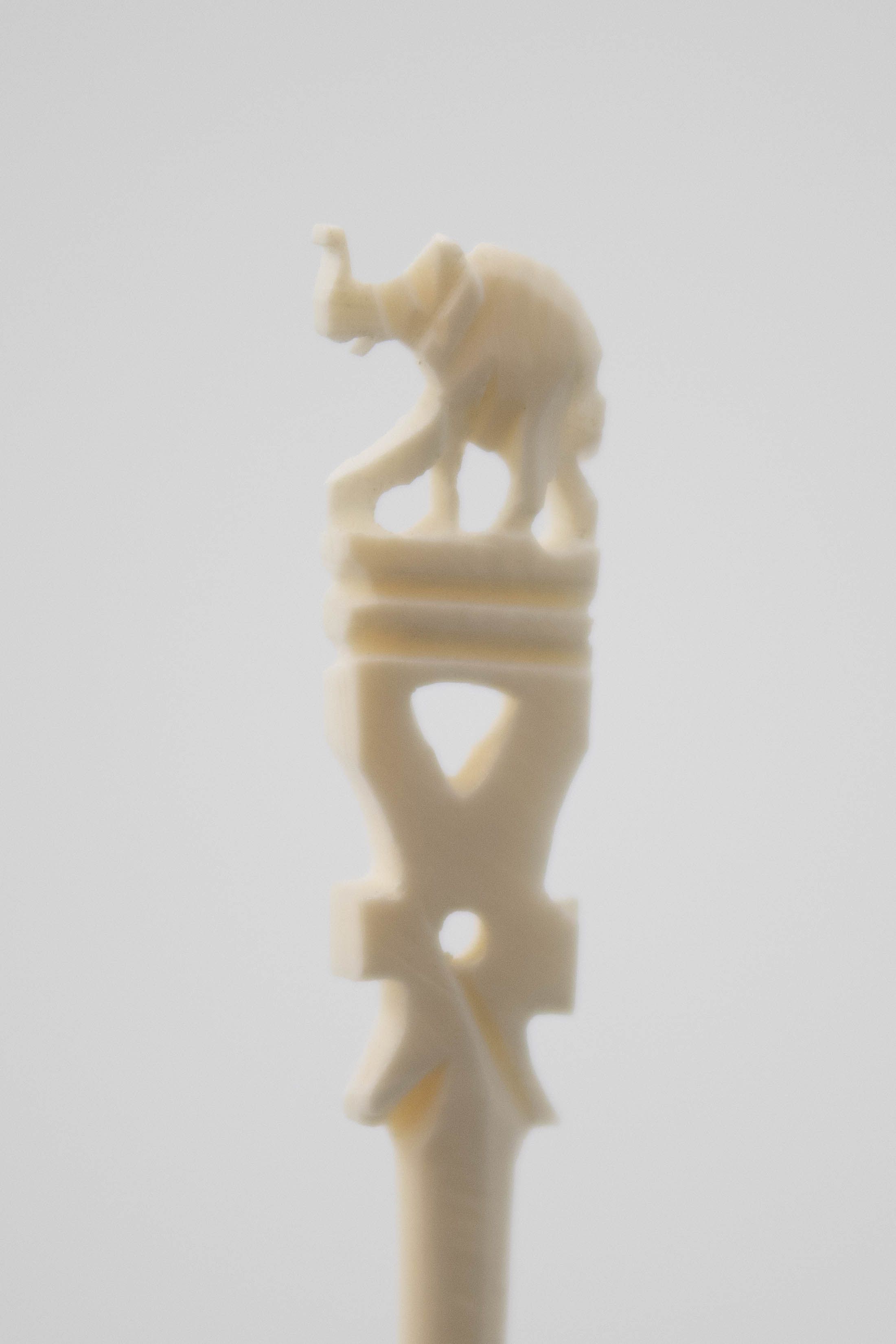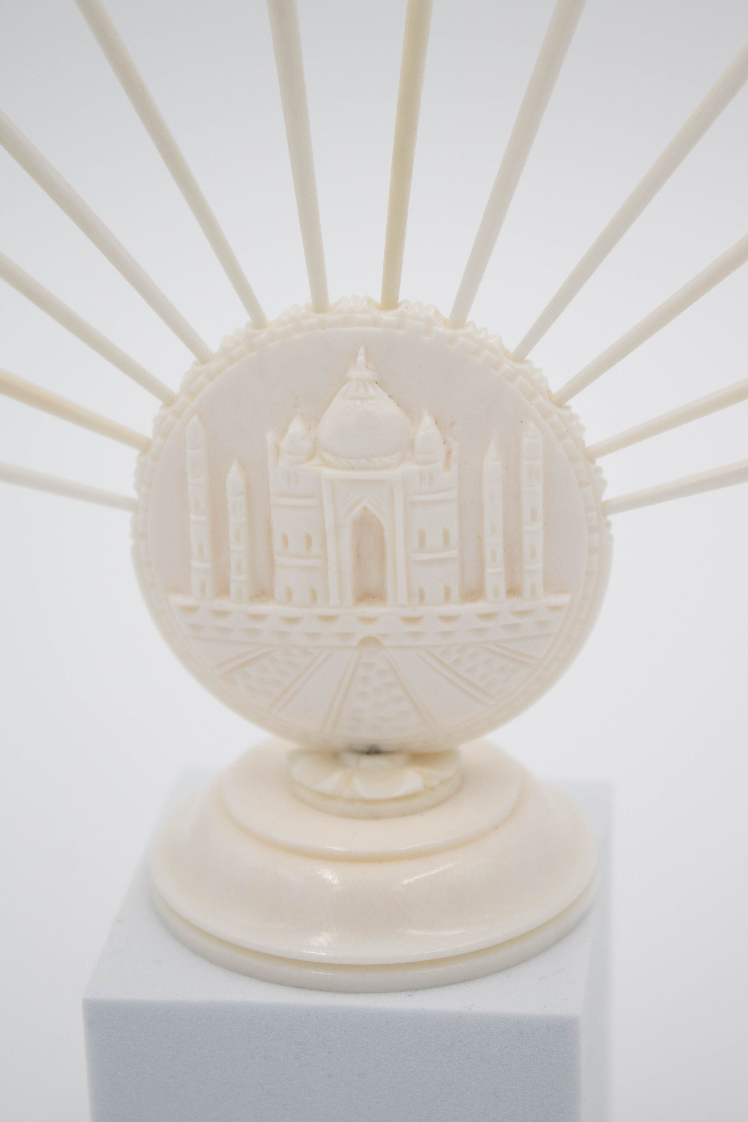 Image of the two sets of ivory skewers. The one on the front right has a flower on the base and 12 skewers across the top. The one on the back left has the Taj Mahal on the base and 12 skewers across the top. Each of the skewers either has an elephant or elk on the top.