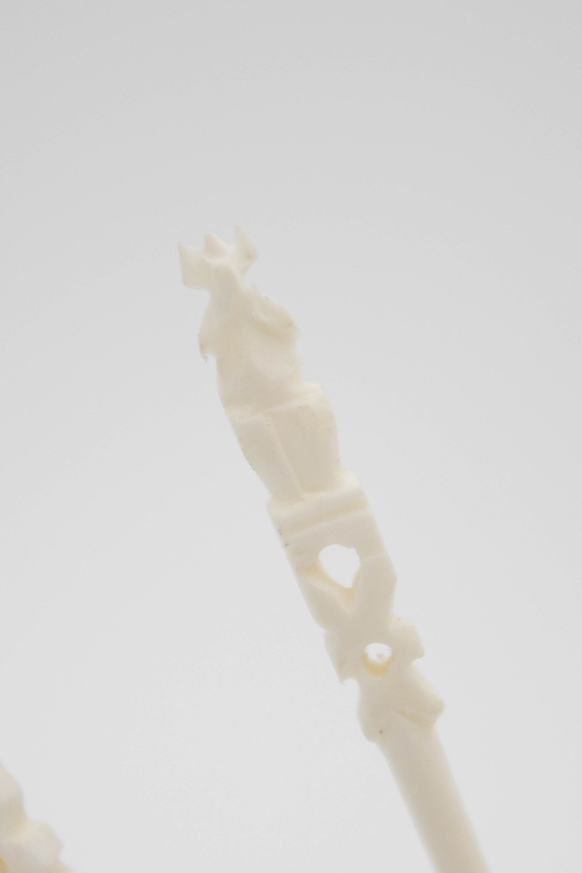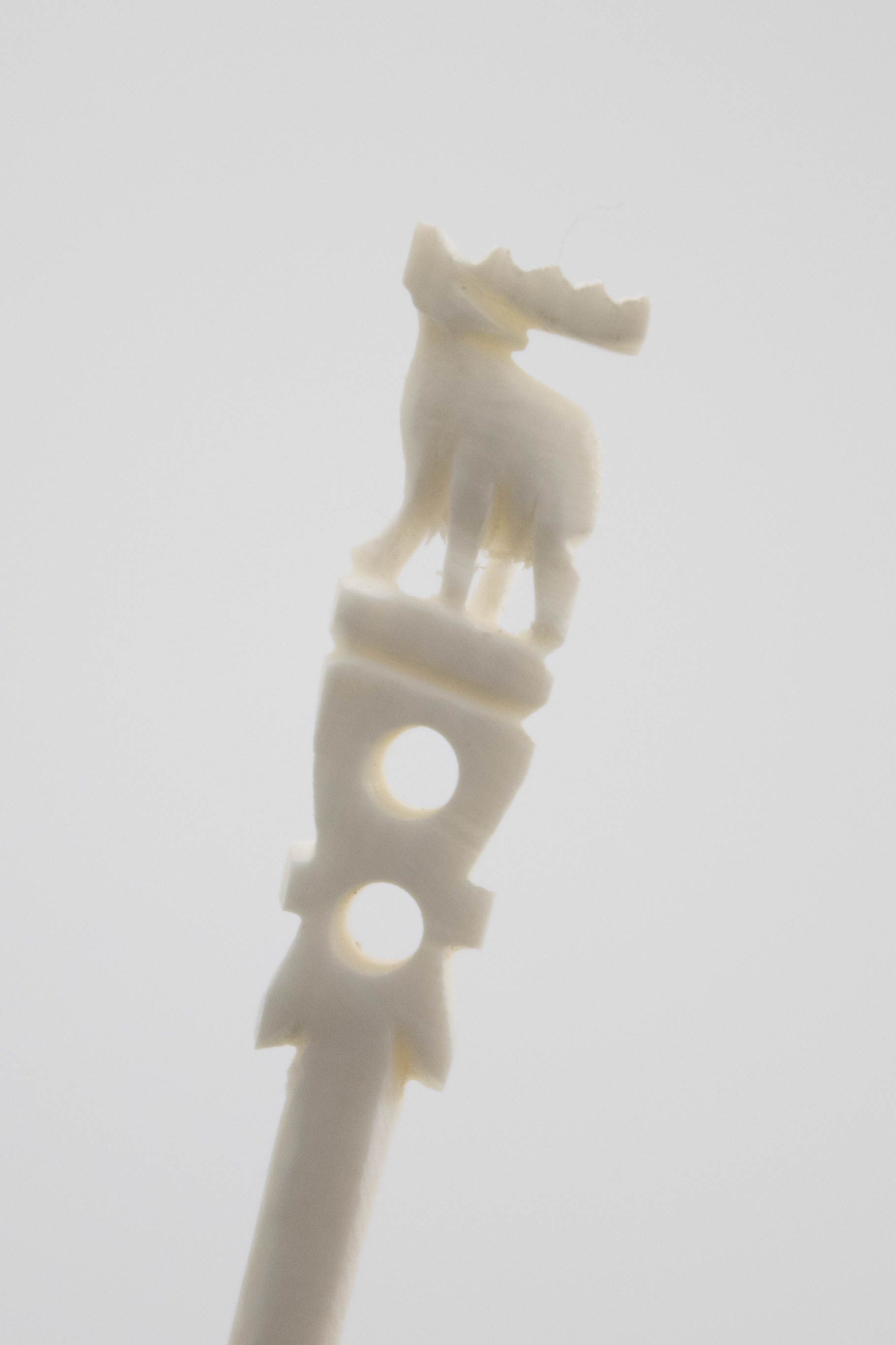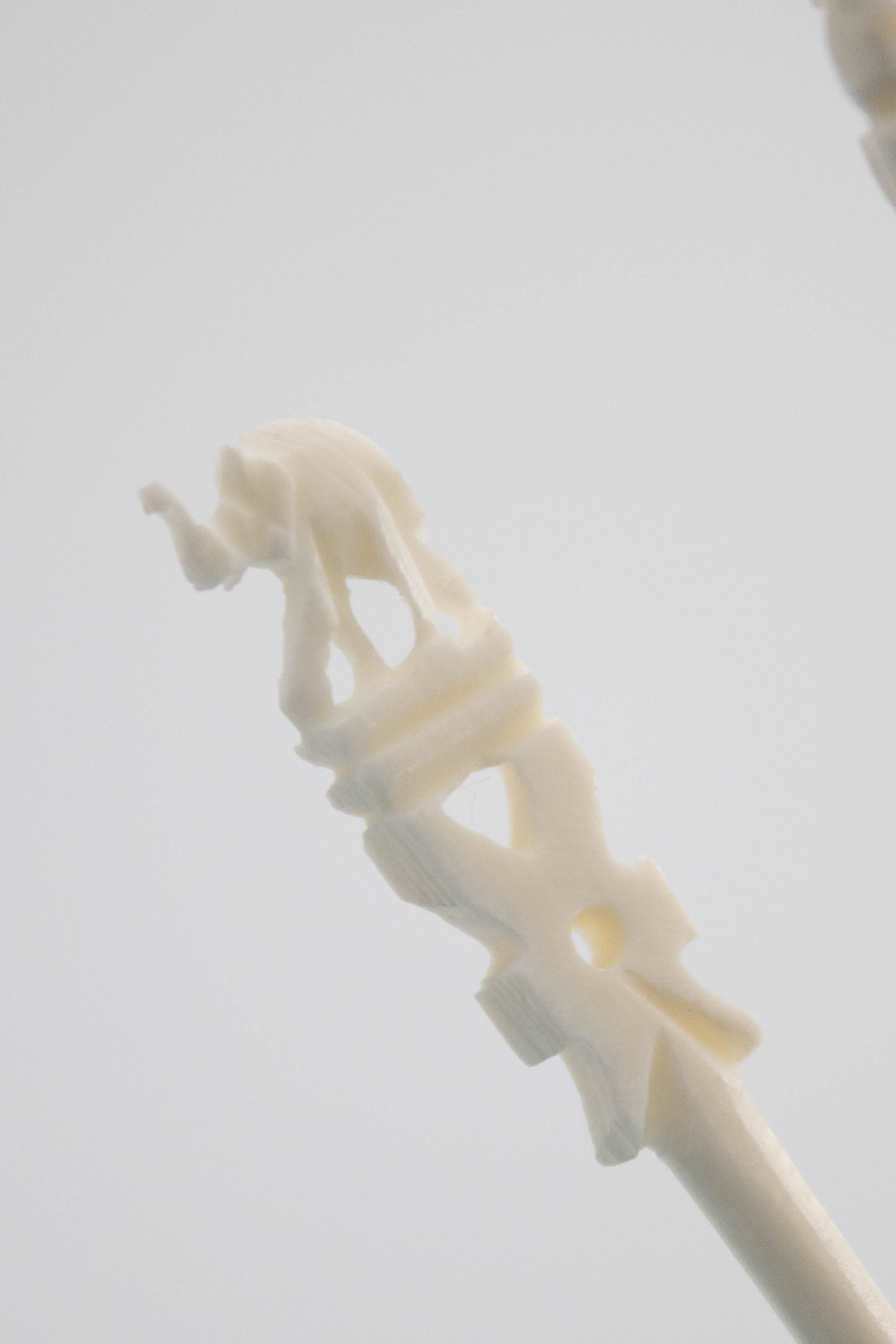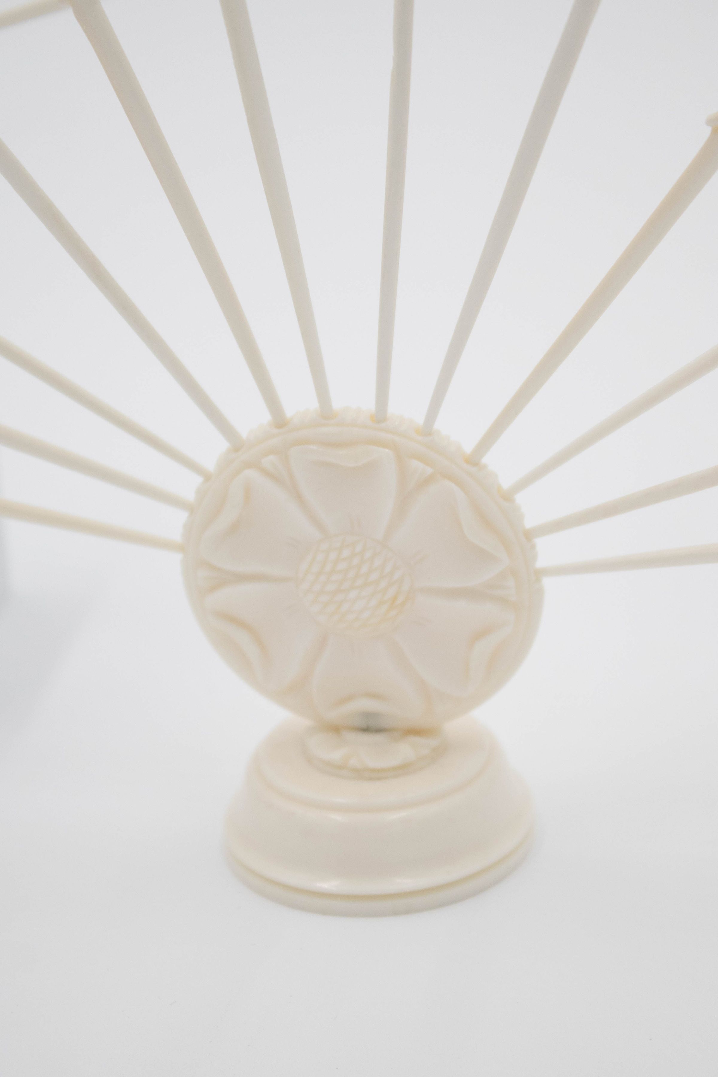 Image of the two sets of ivory skewers. The one on the front right has a flower on the base and 12 skewers across the top. The one on the back left has the Taj Mahal on the base and 12 skewers across the top. Each of the skewers either has an elephant or elk on the top.