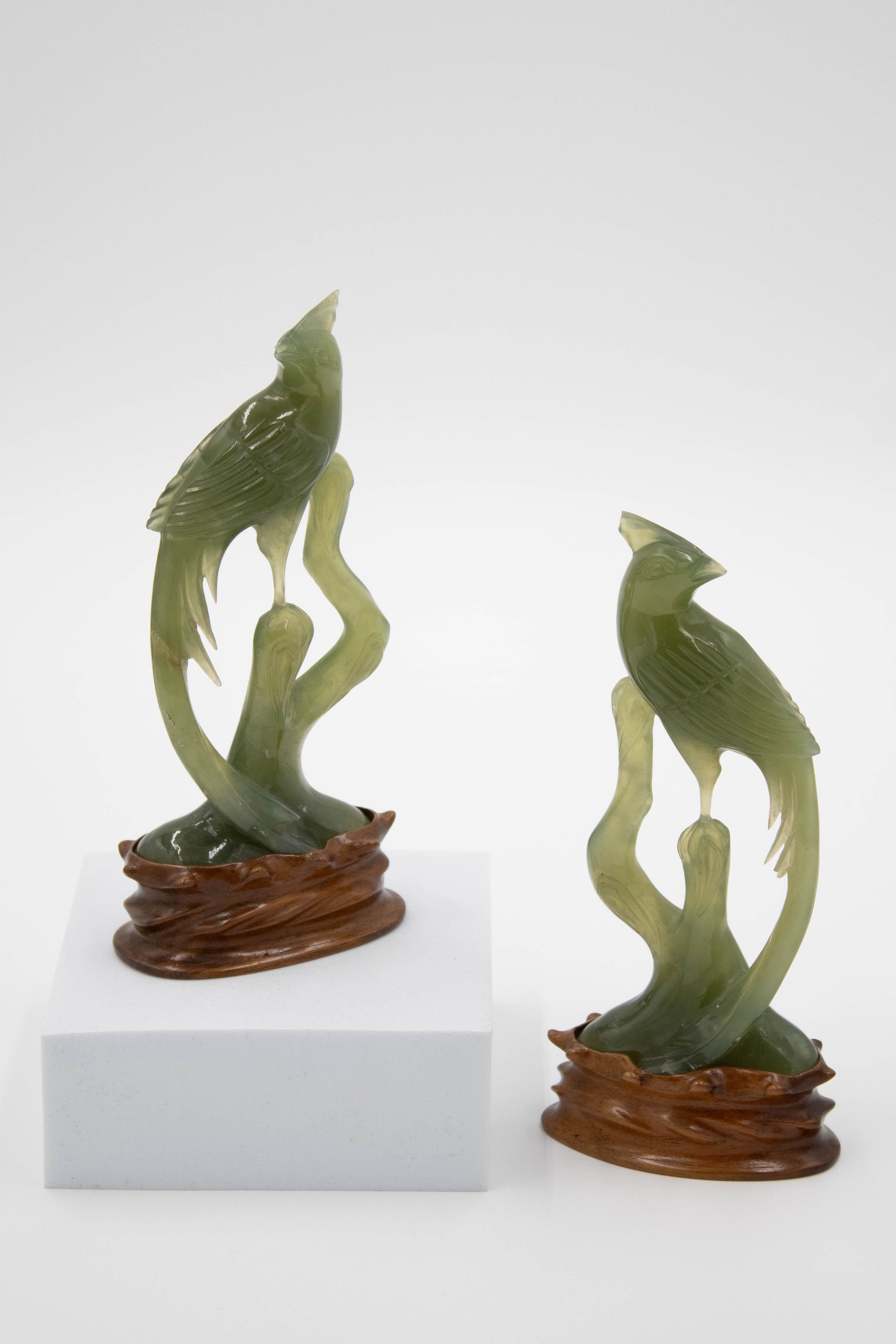 Pair of bird statuettes are carved out of jade on mahogany wooden stands.Context