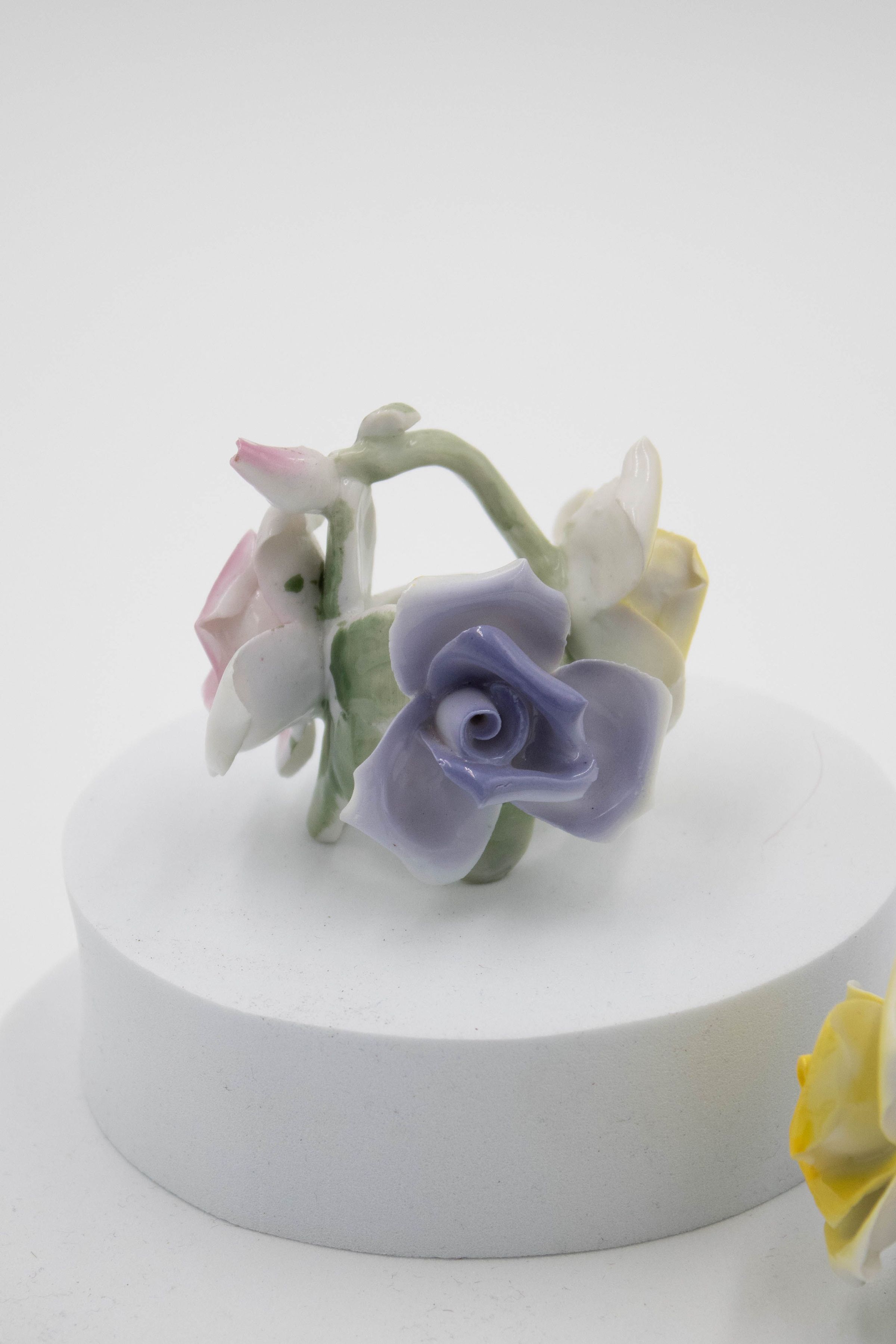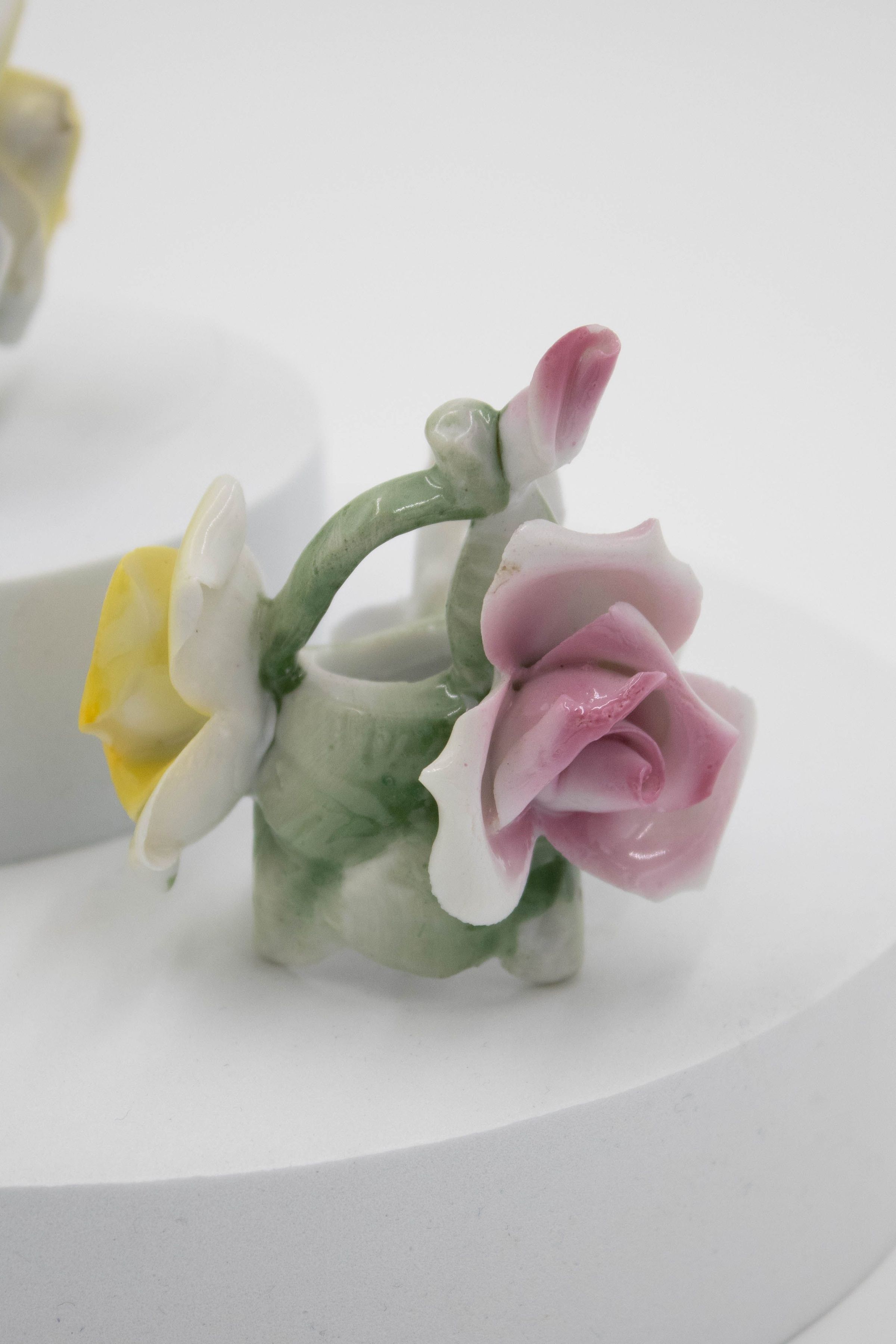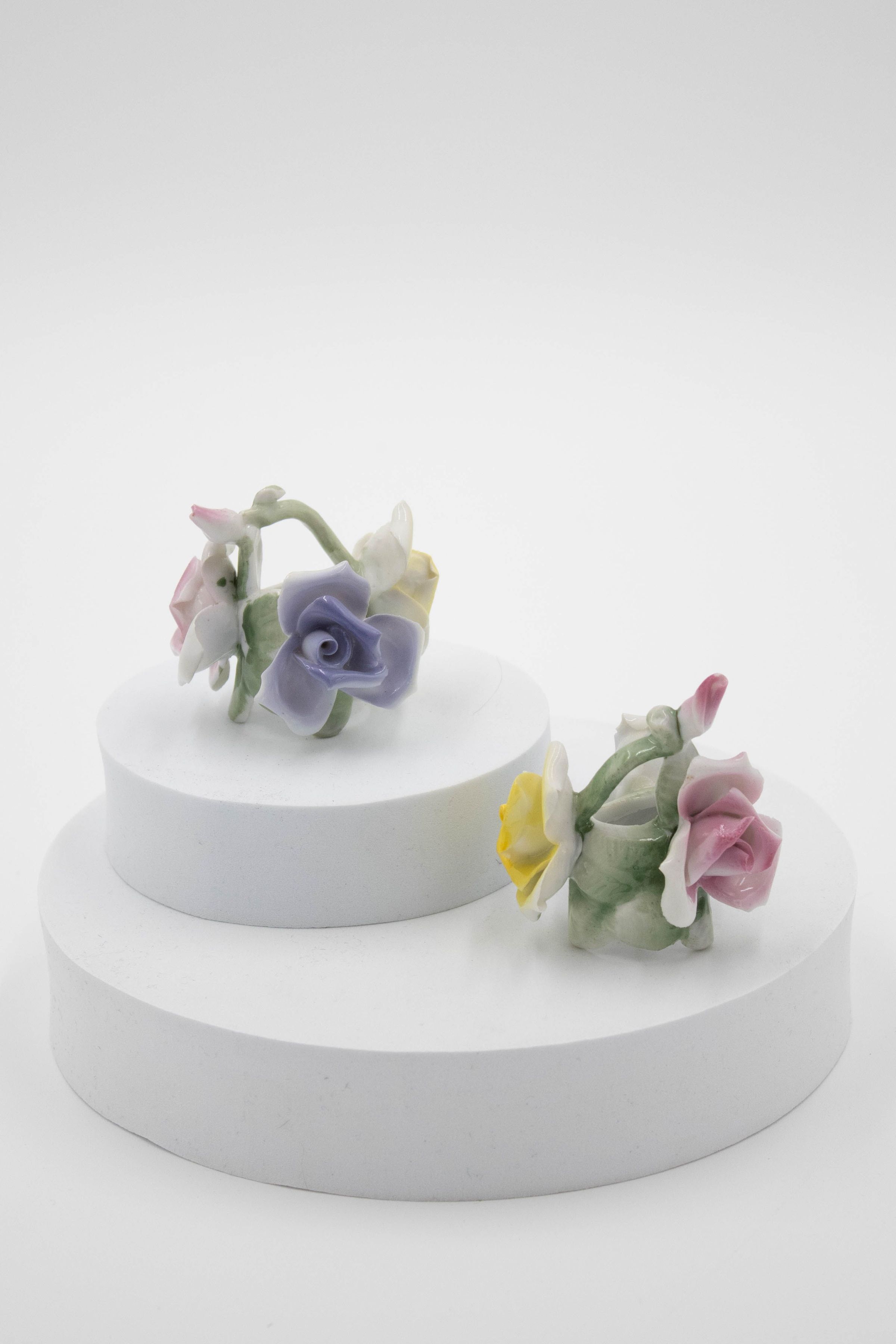 Two painted ceramic rose candleholders, featuring delicate pastel flowers in pink, yellow, and blue.