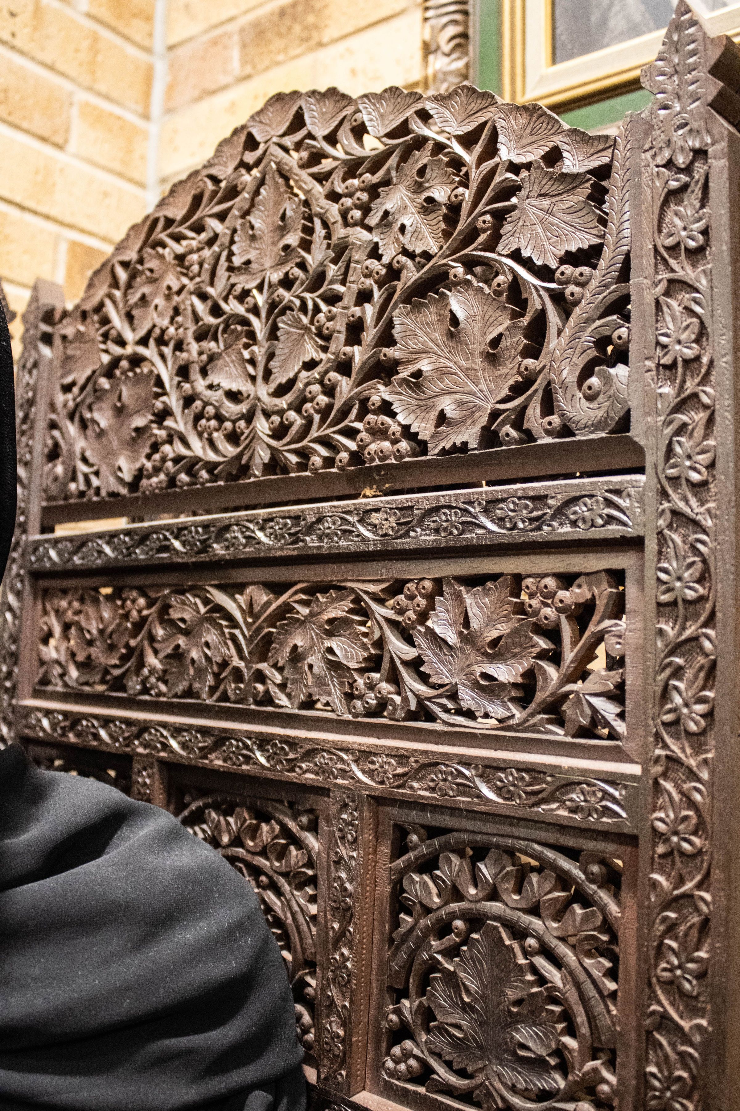 The intricately carved wooden room partition screens feature an elegant leaf design, providing both decorative and functional elements to the space.