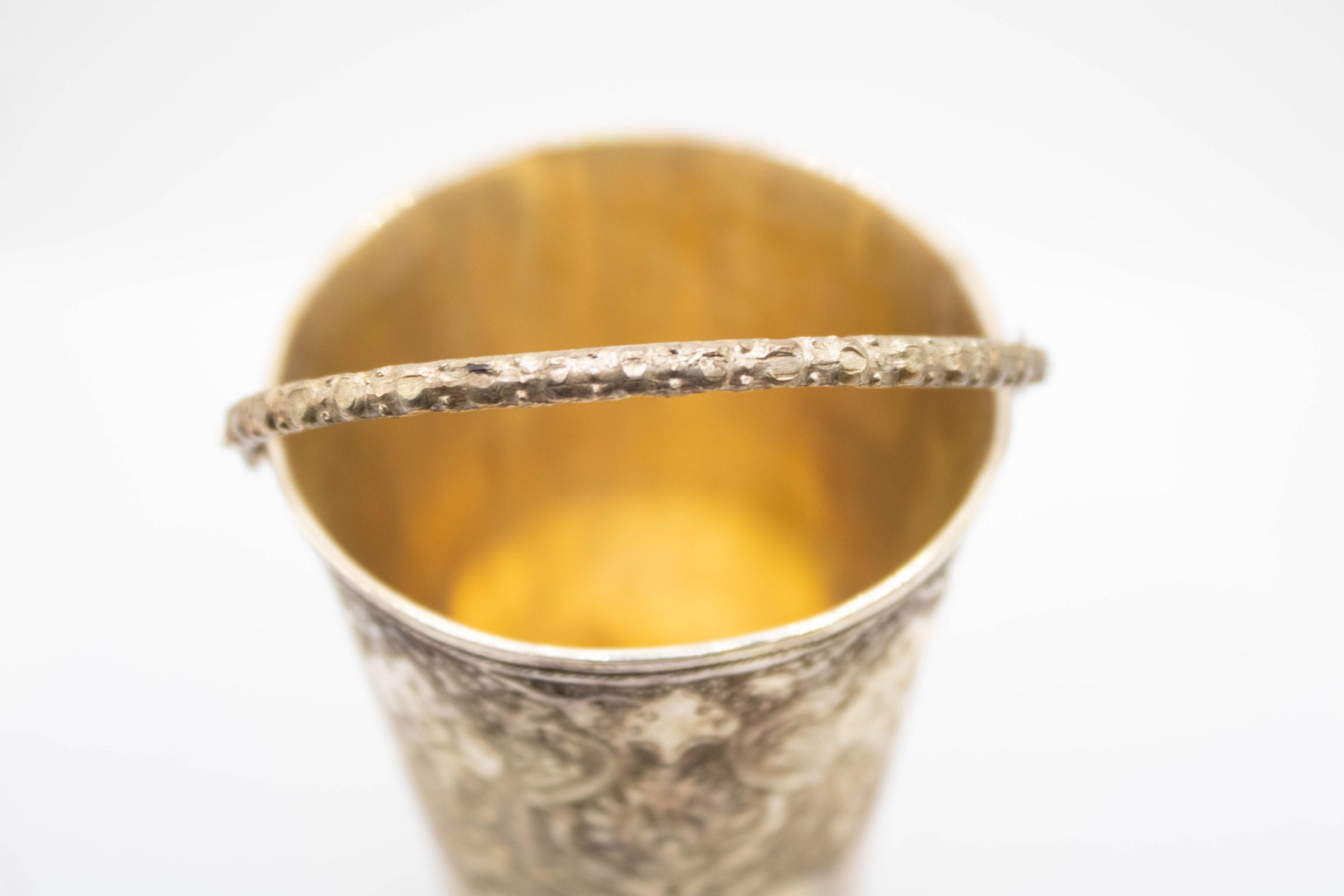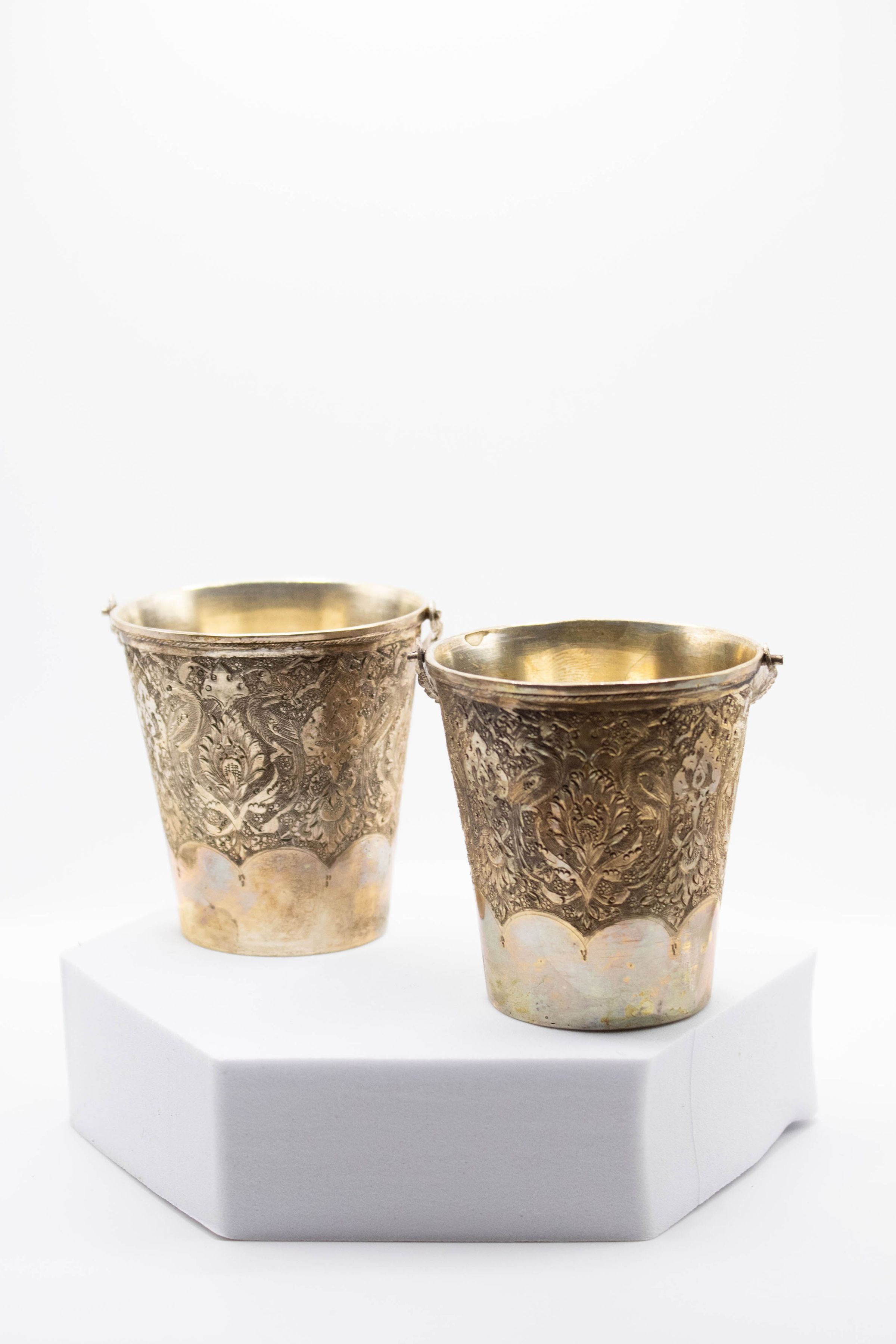 The pair of small silver buckets features intricate floral motifs.