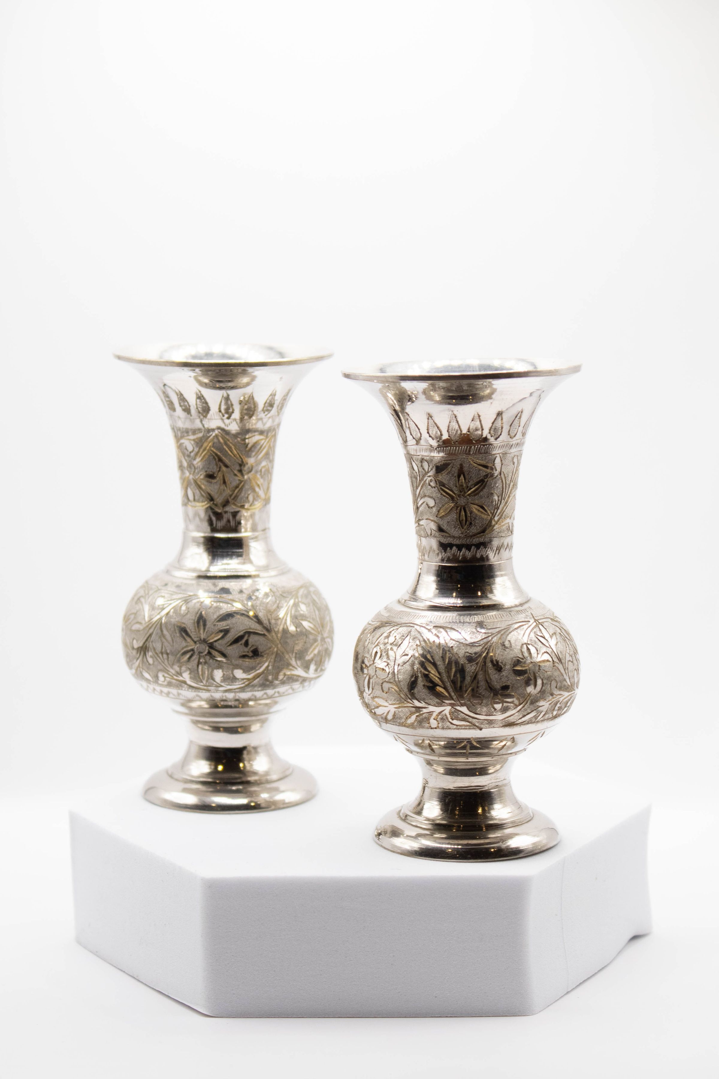 Pair of small silver vases engraved with a floral vine pattern. They are barely three inches tall and were likely made in Persia, now modern-day Iran, during the early 20th century.Context