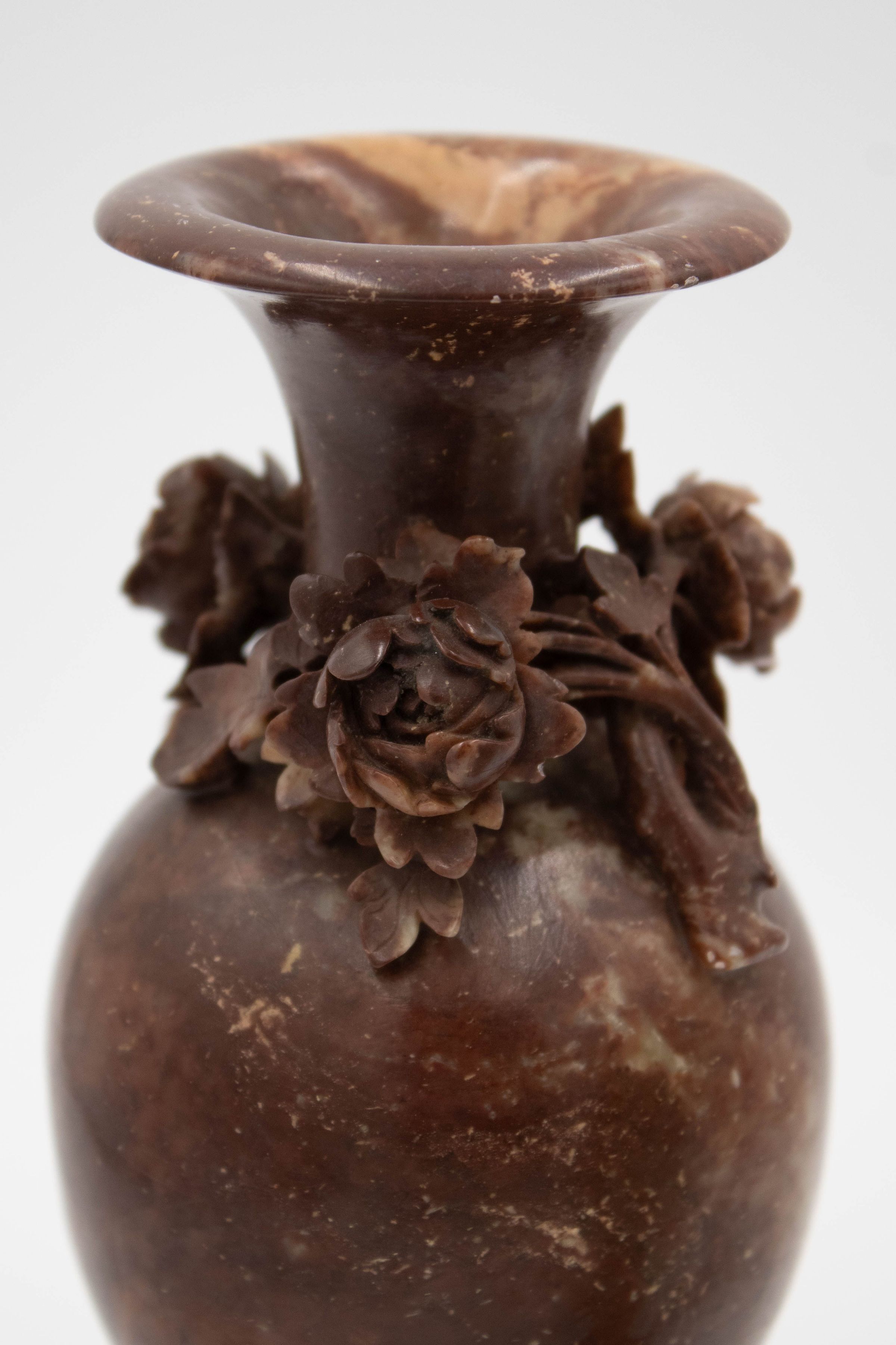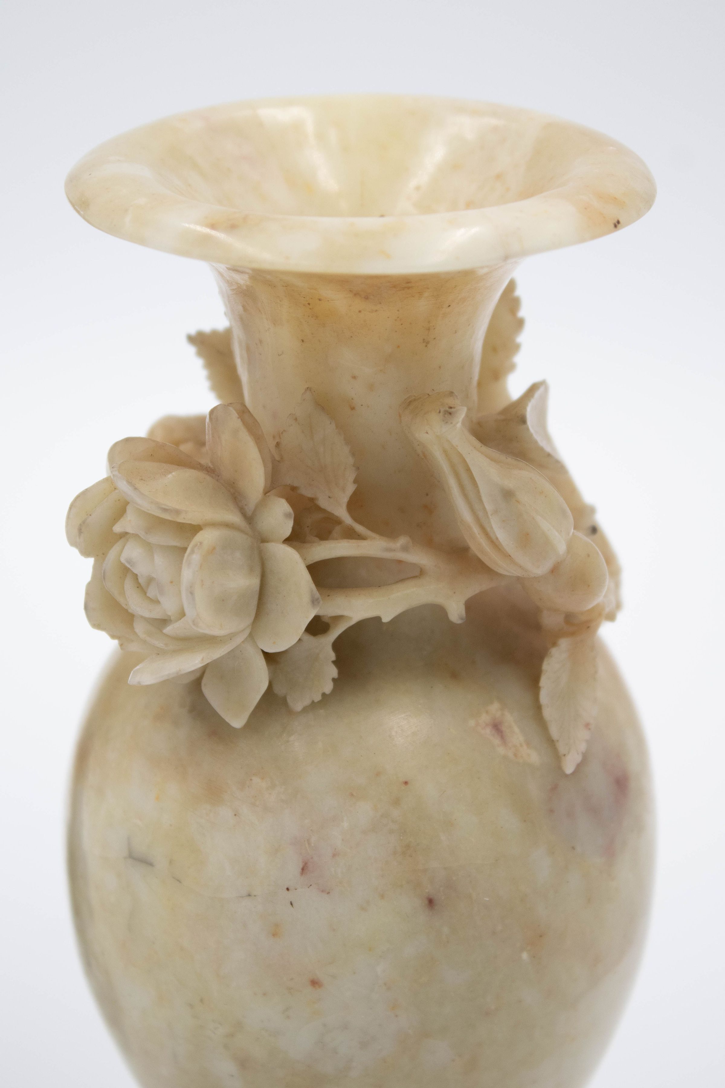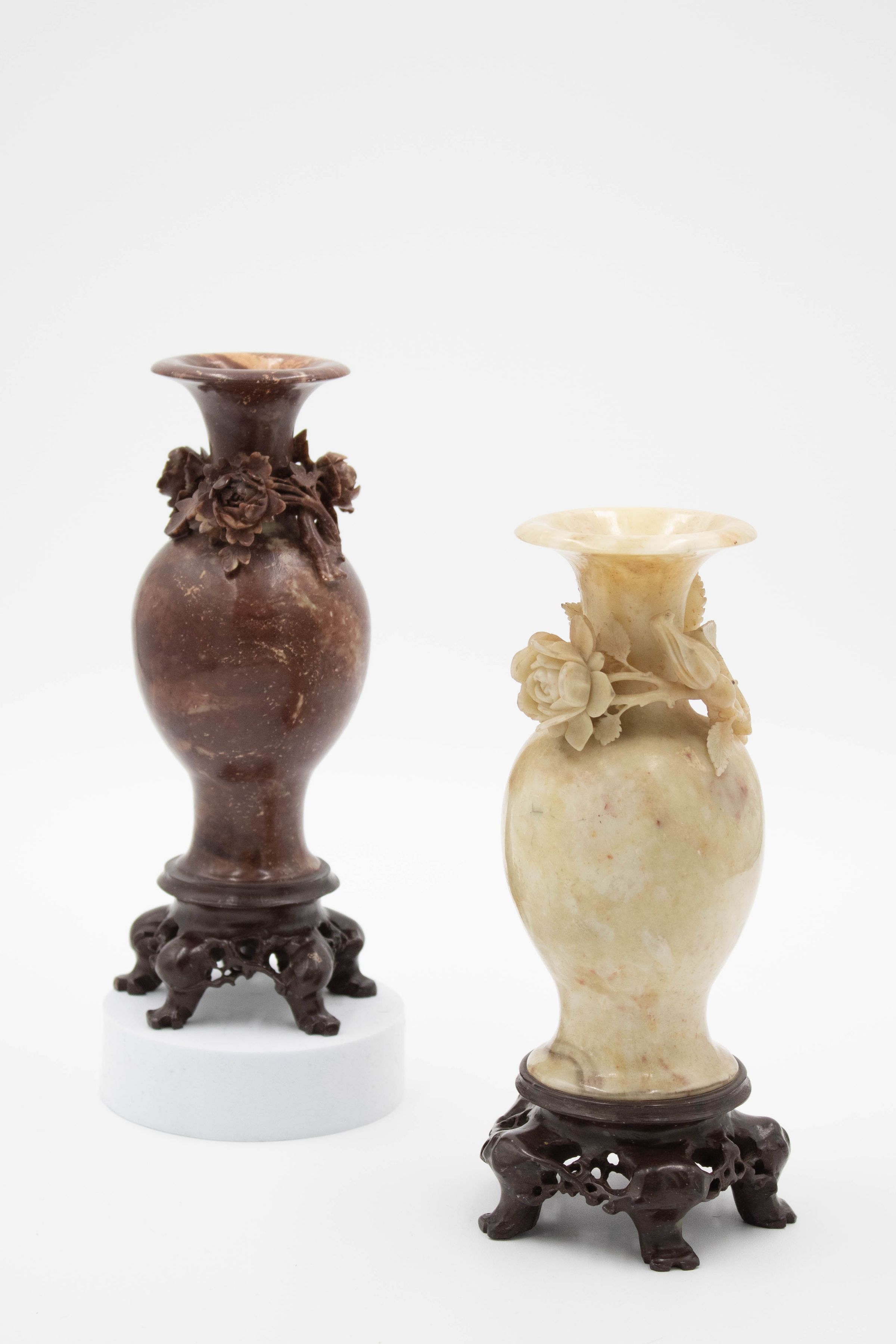 The image shows two intricately carved soapstone vases, one cream and one brown, each adorned with delicate floral designs.