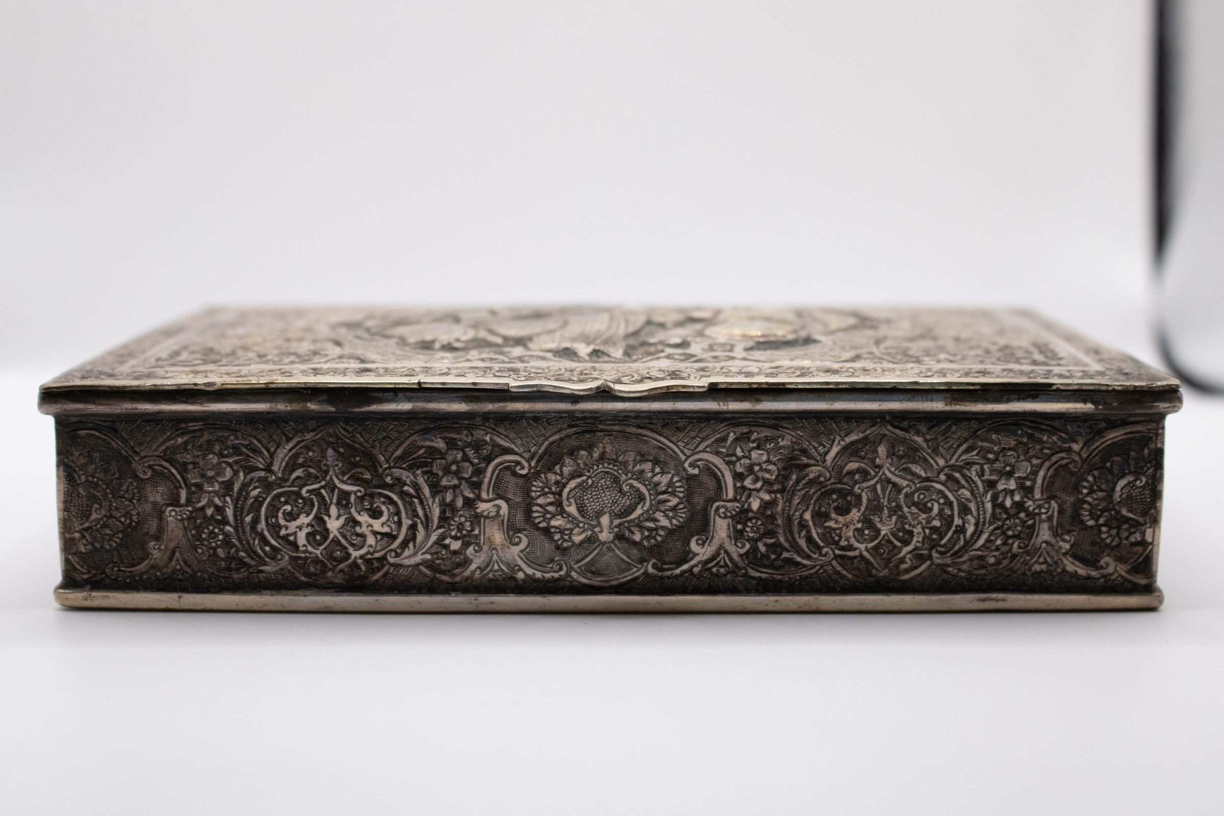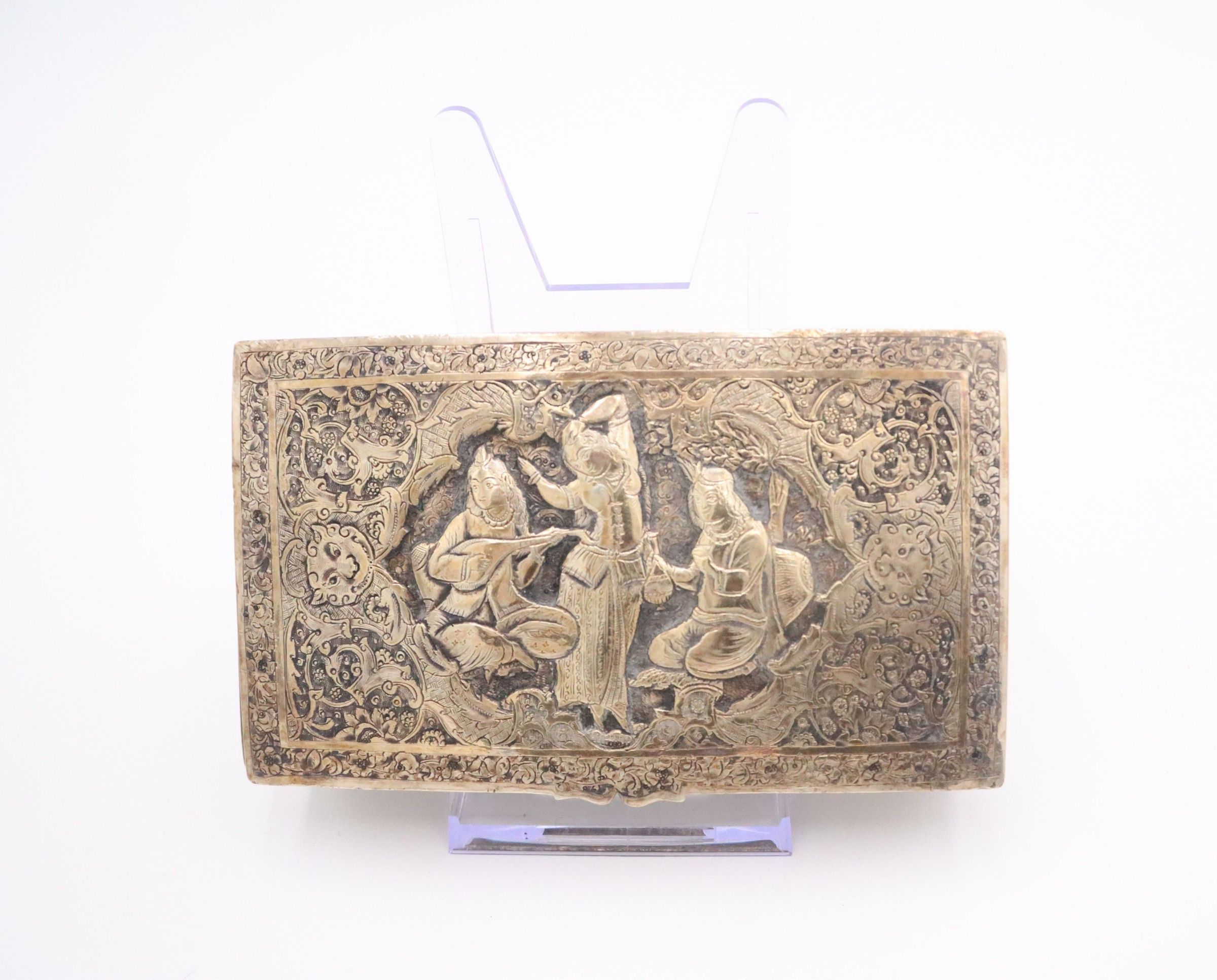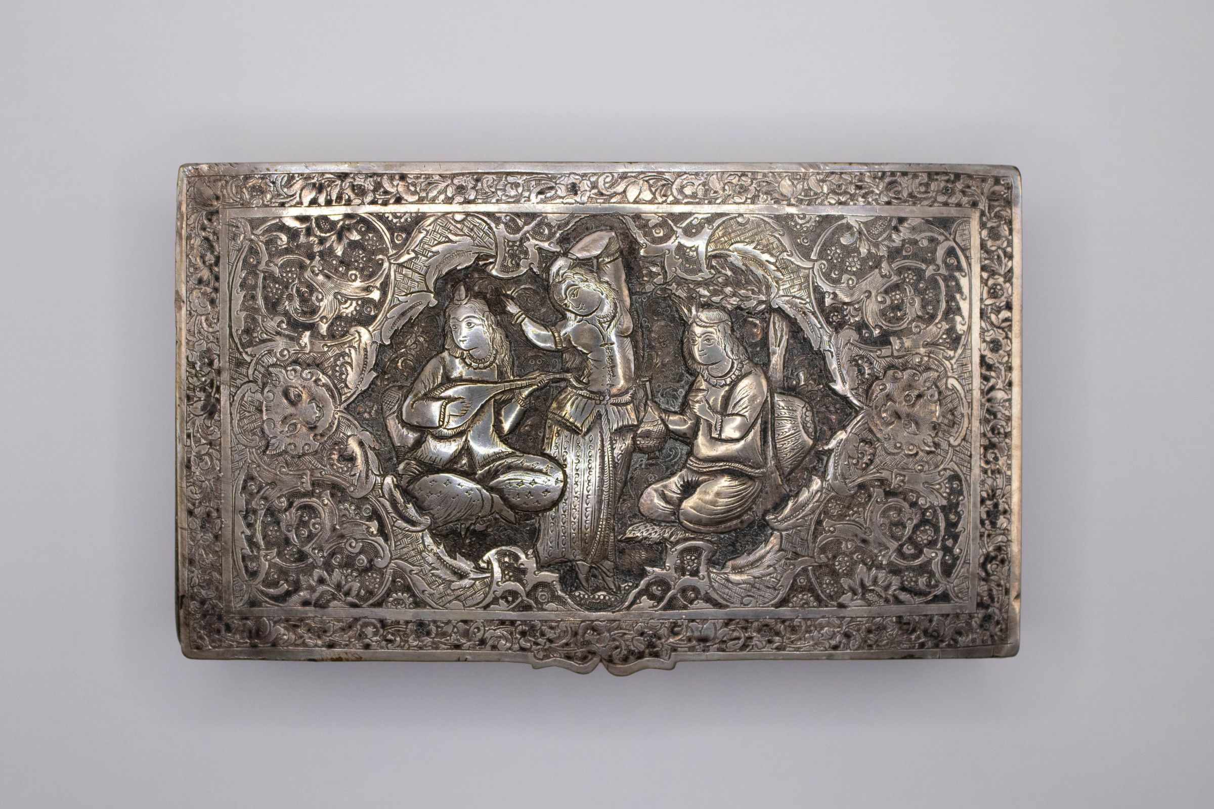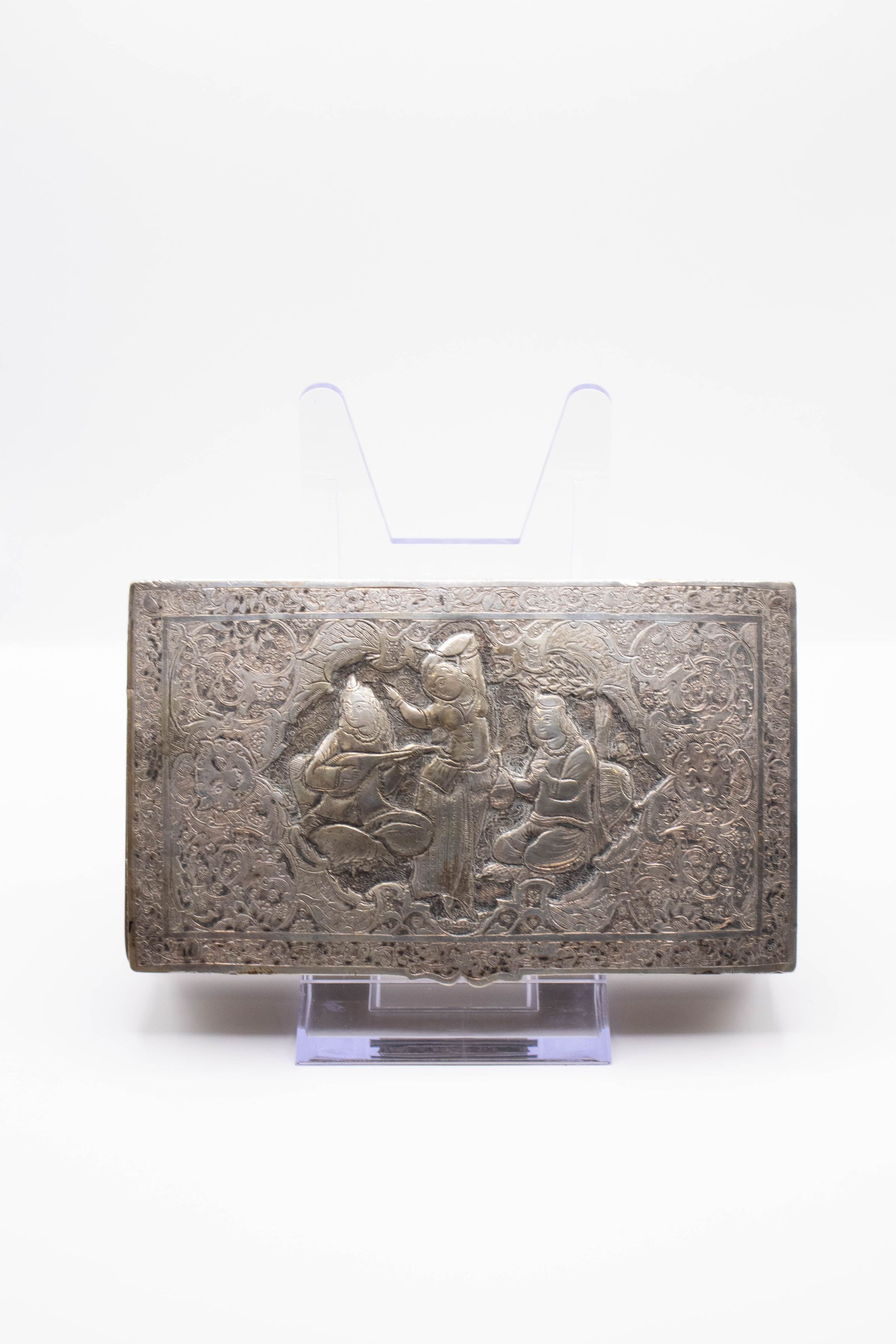 19th century silver repousse box from Persia, now modern-day Iran. The box depicts a woman dancing with two other figures playing instruments on either side.Context