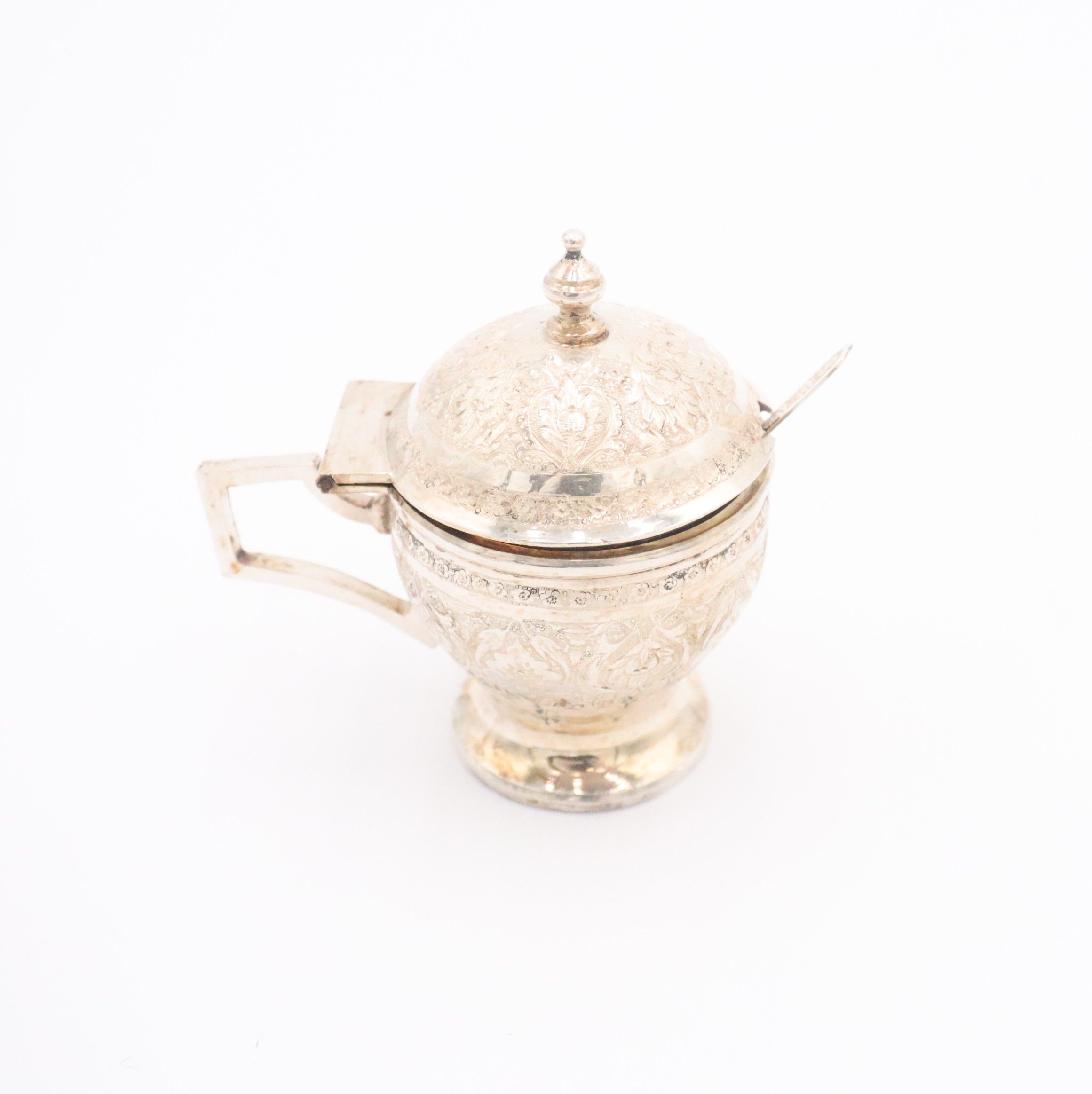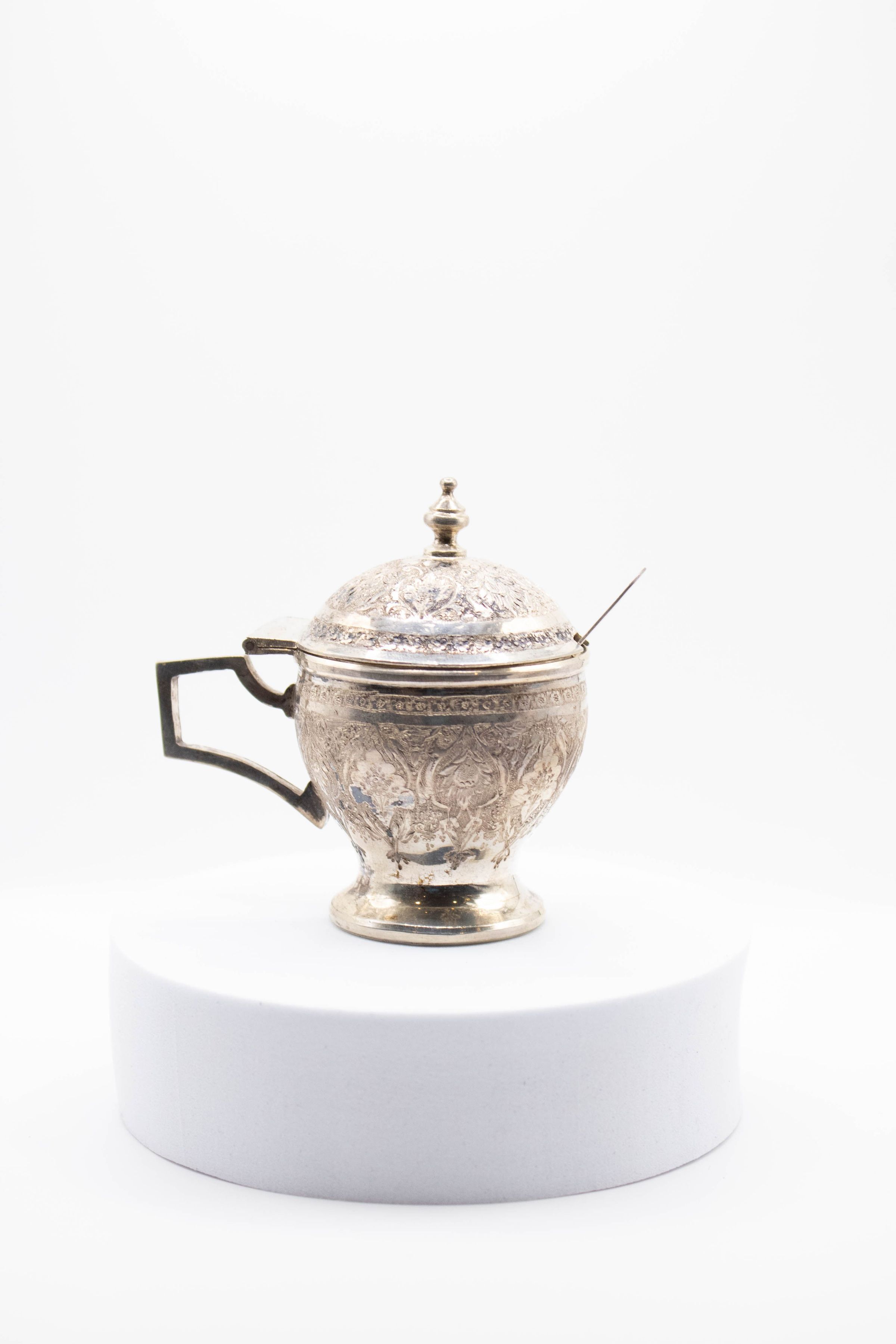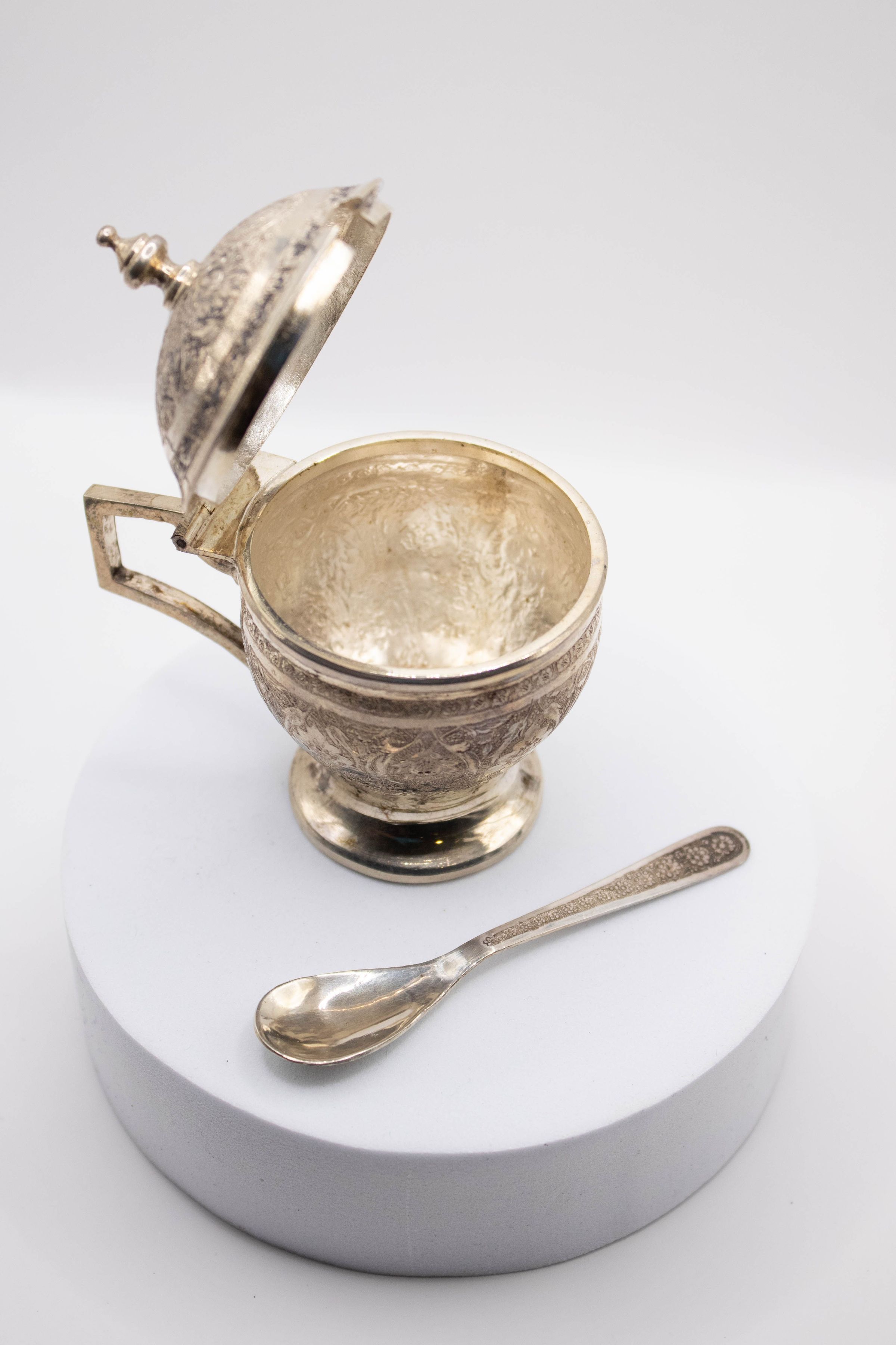Persian silver engraved sugar bowl with lid and spoon from Iran.Context