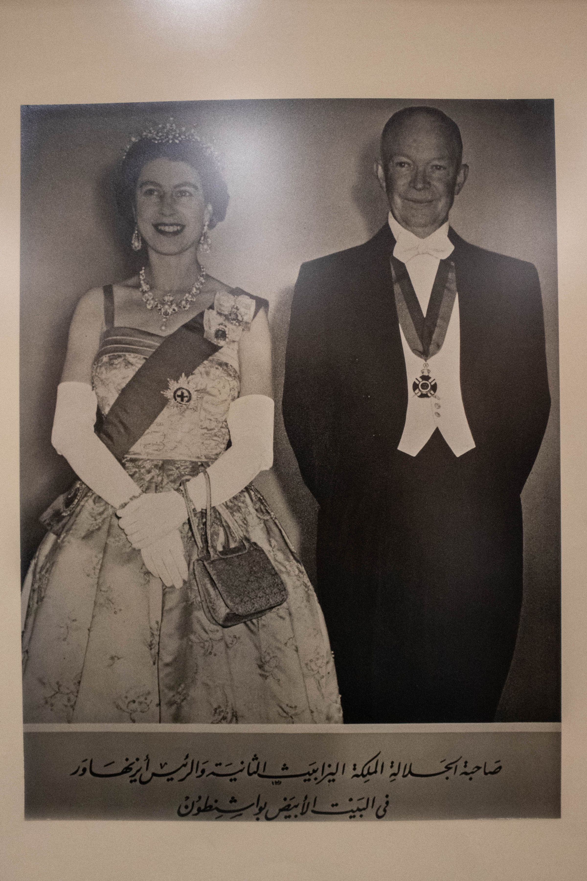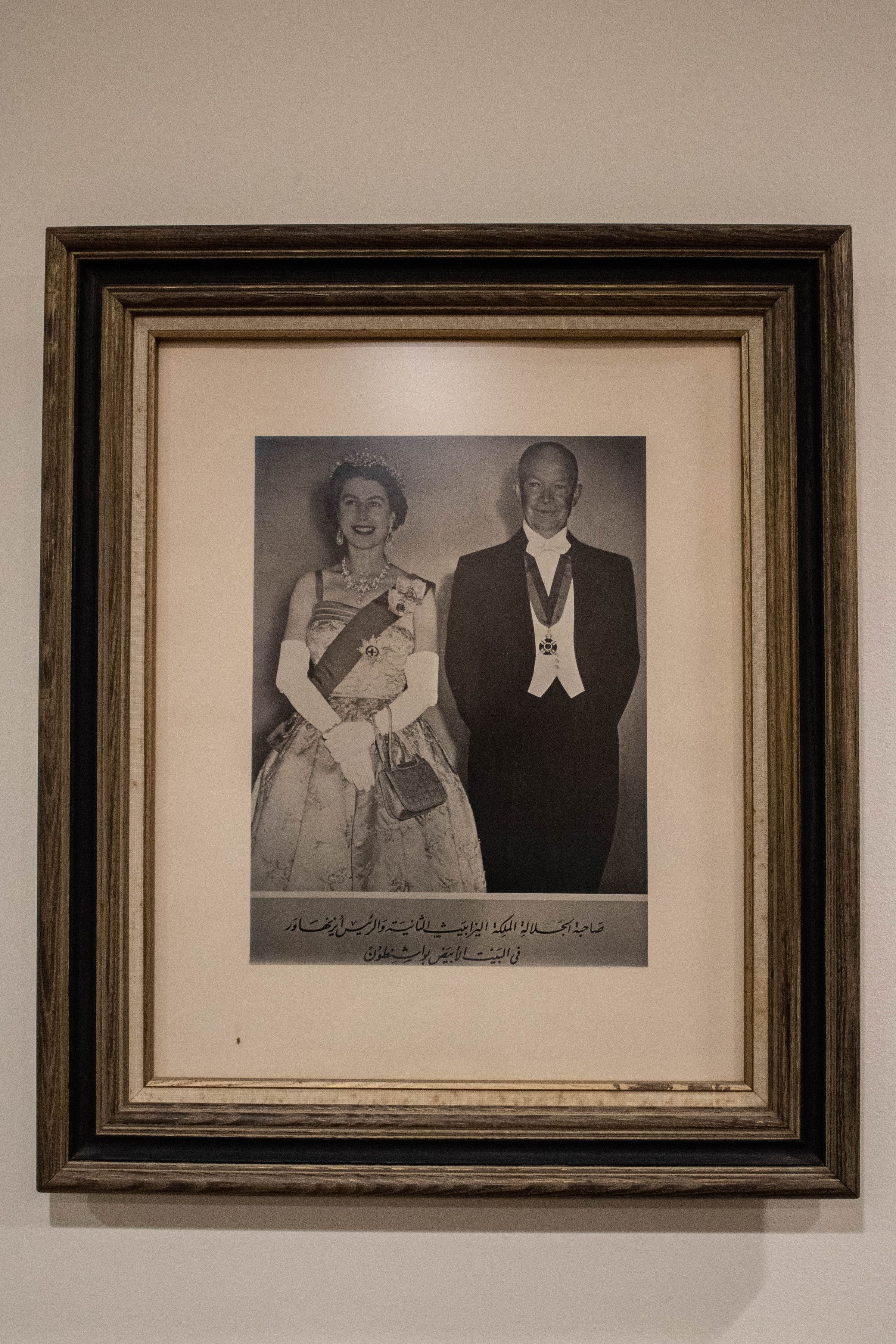 Framed photograph of Queen Elizabeth II and President Dwight D. Eisenhower with Arabic script.Context
