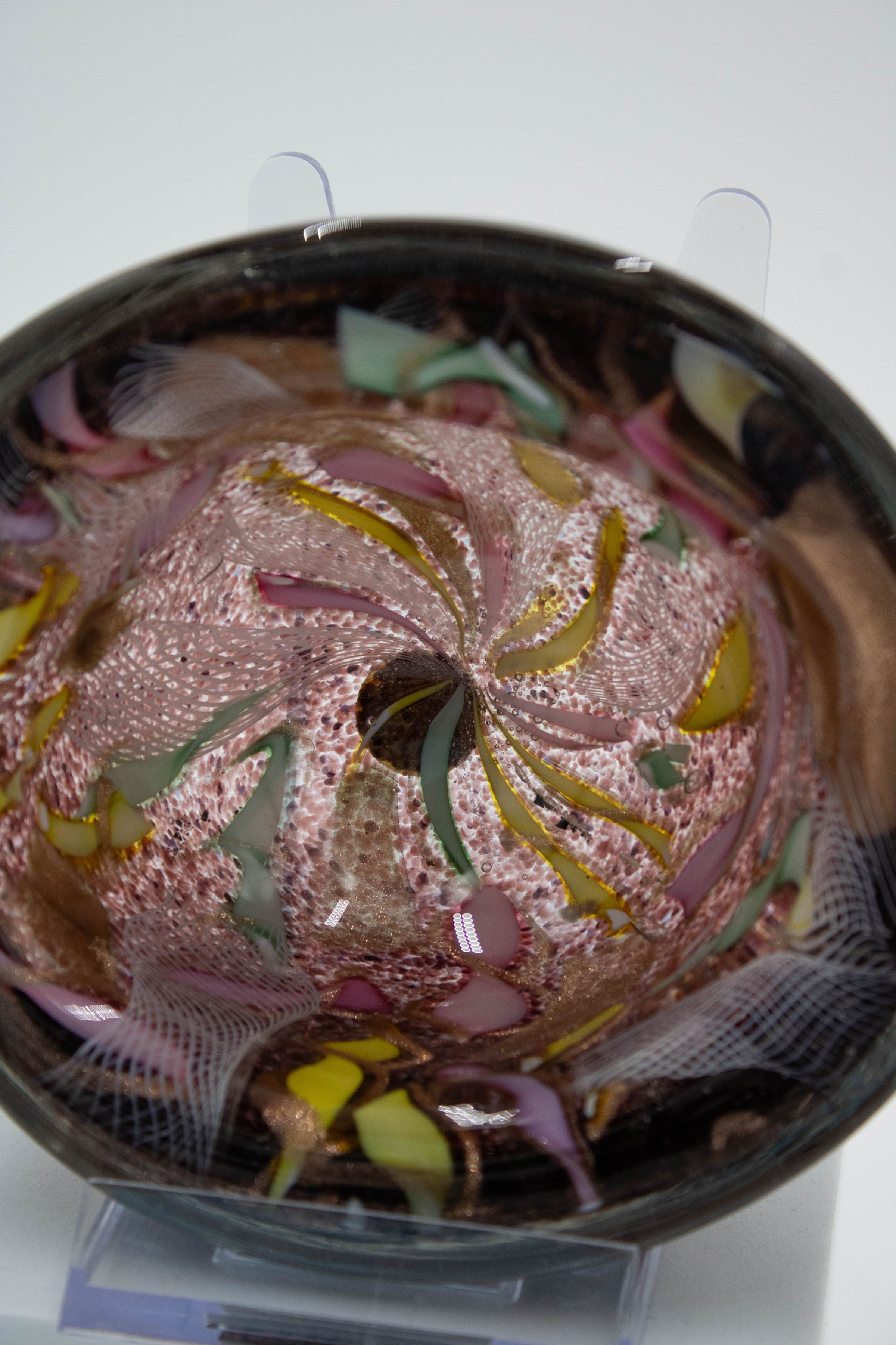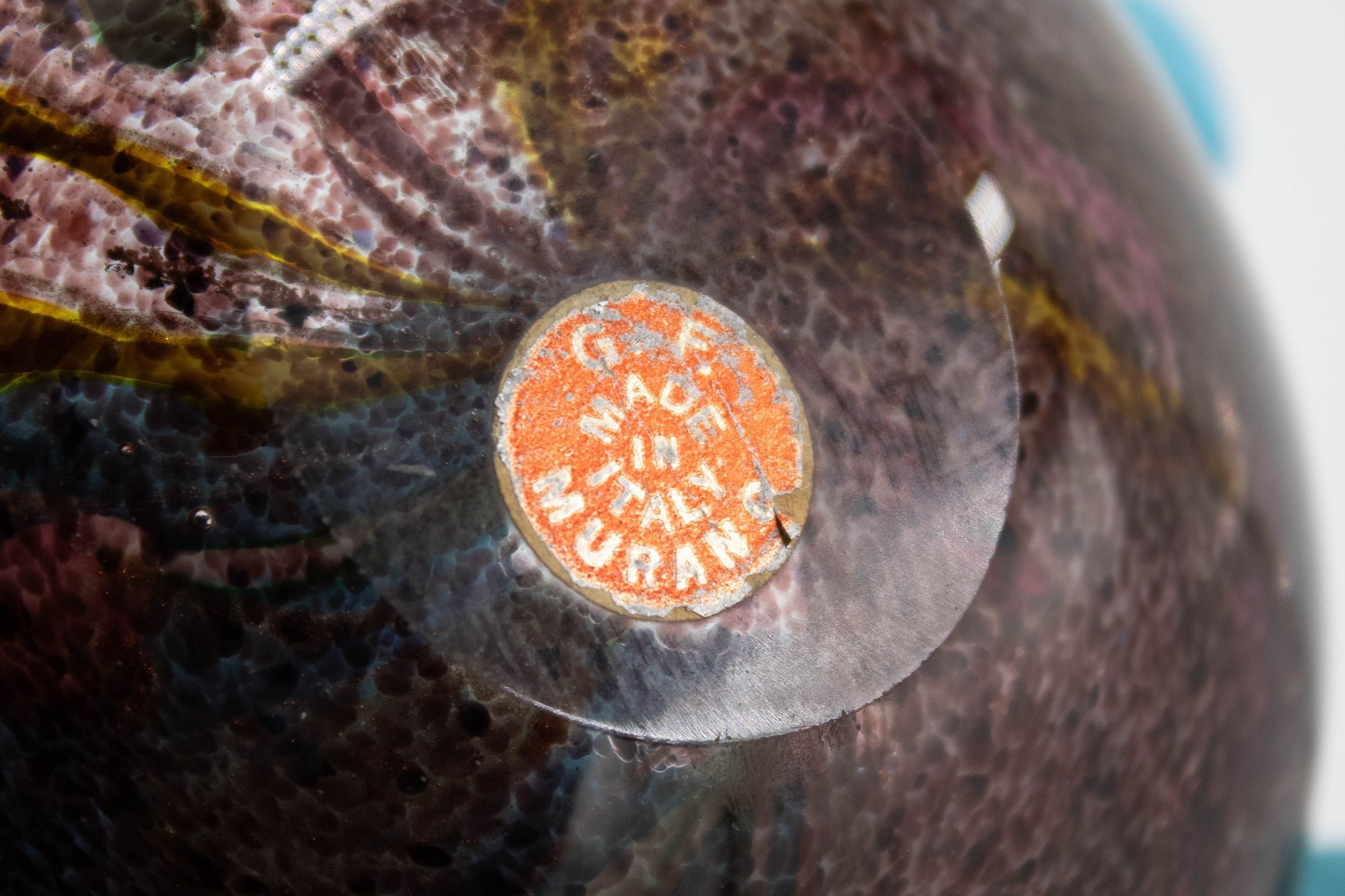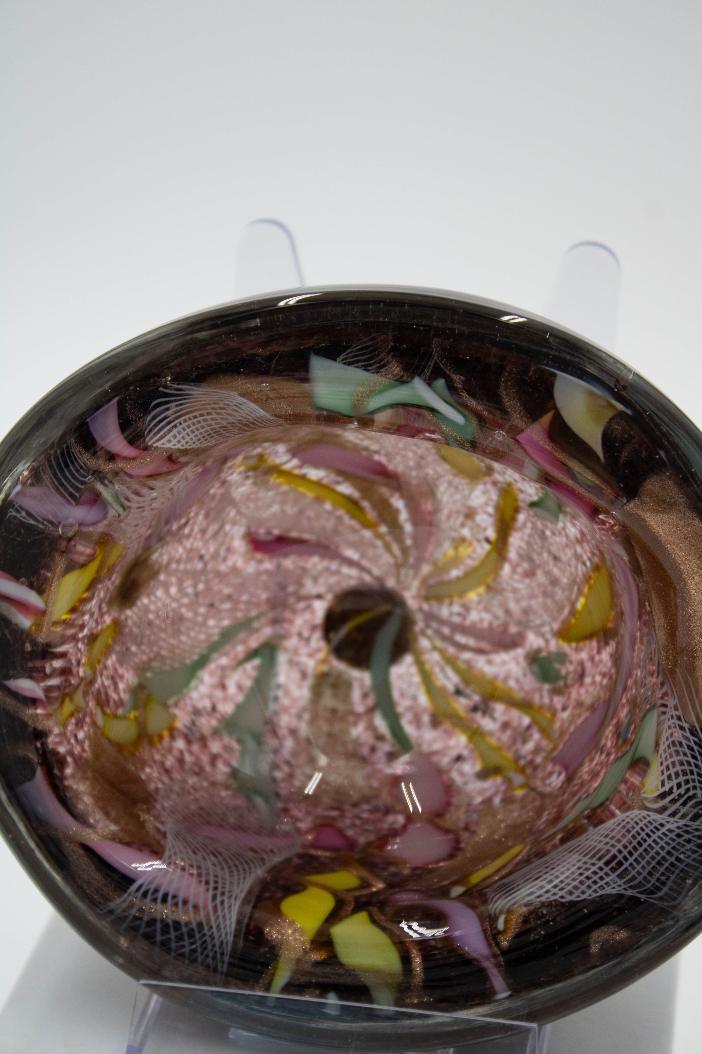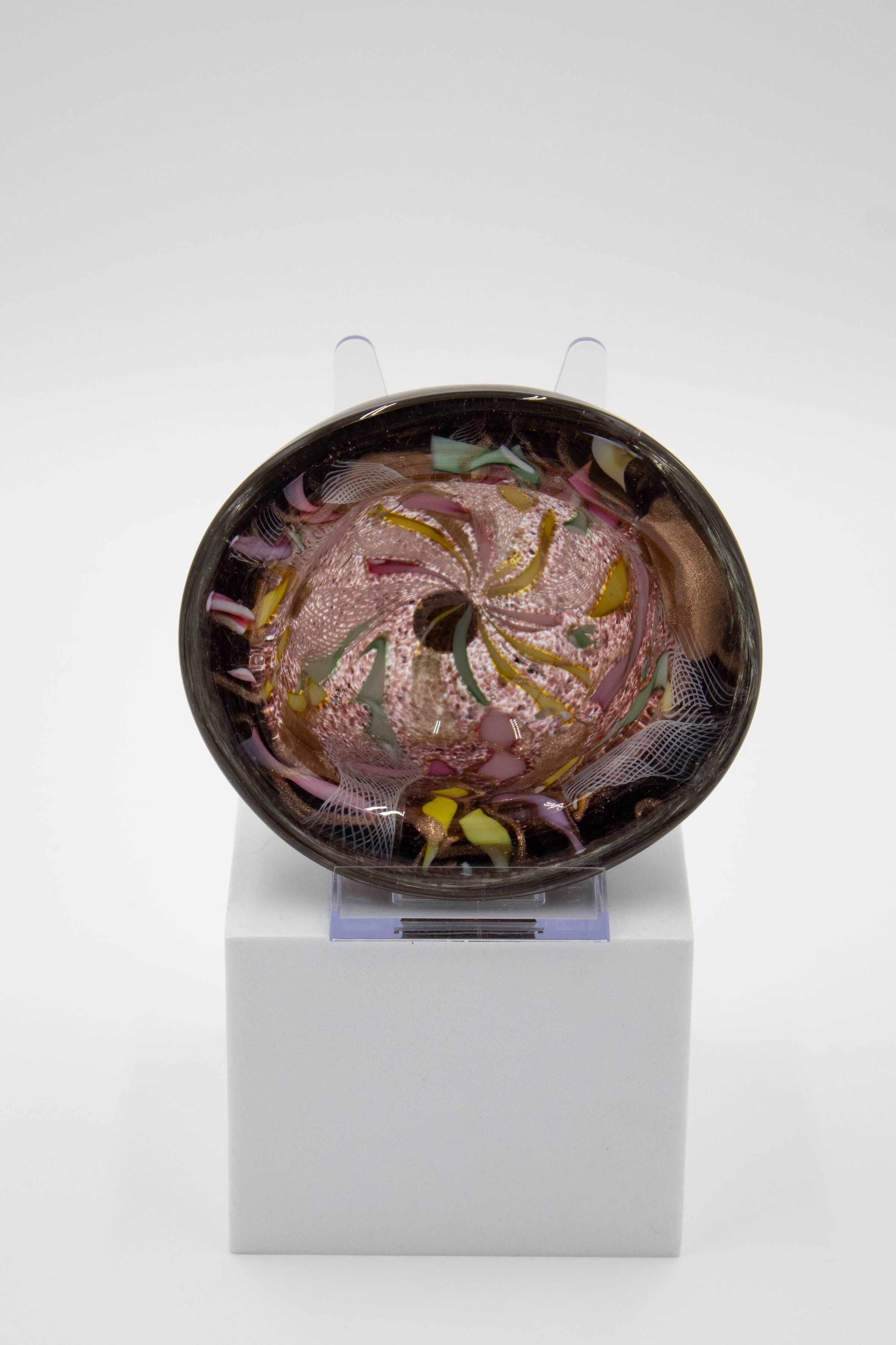 Purple blown glass ashtray with bright colors.