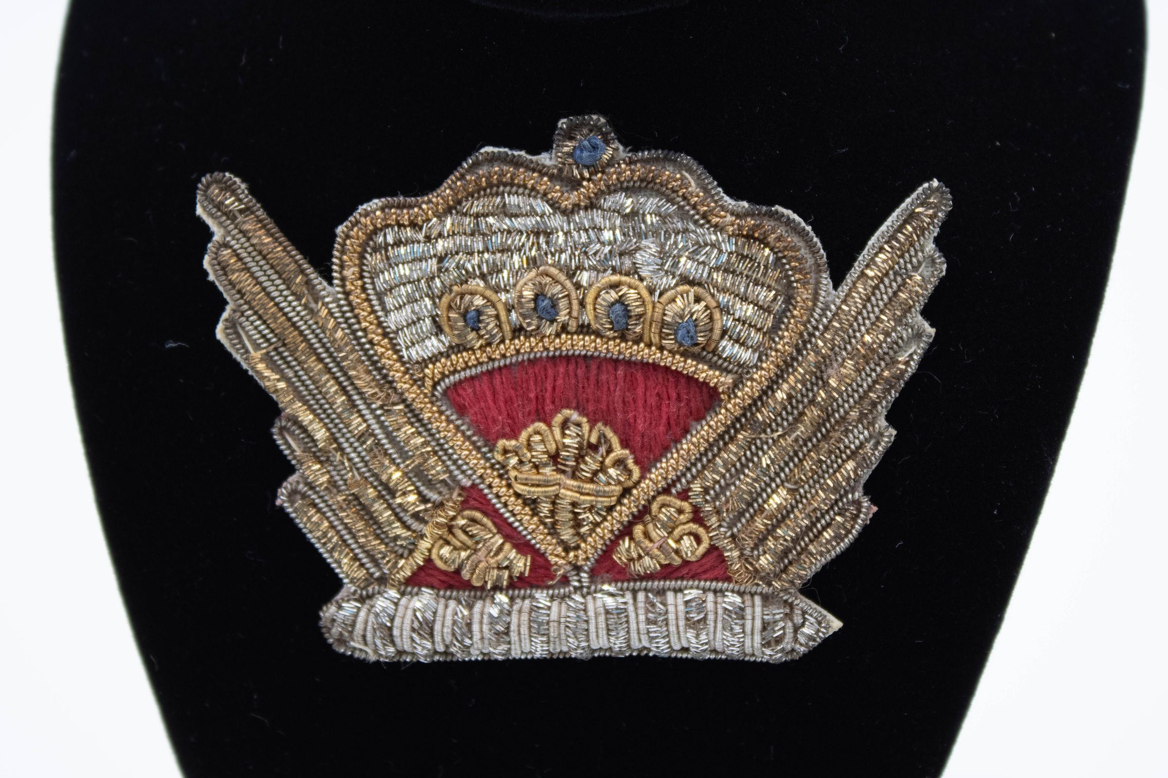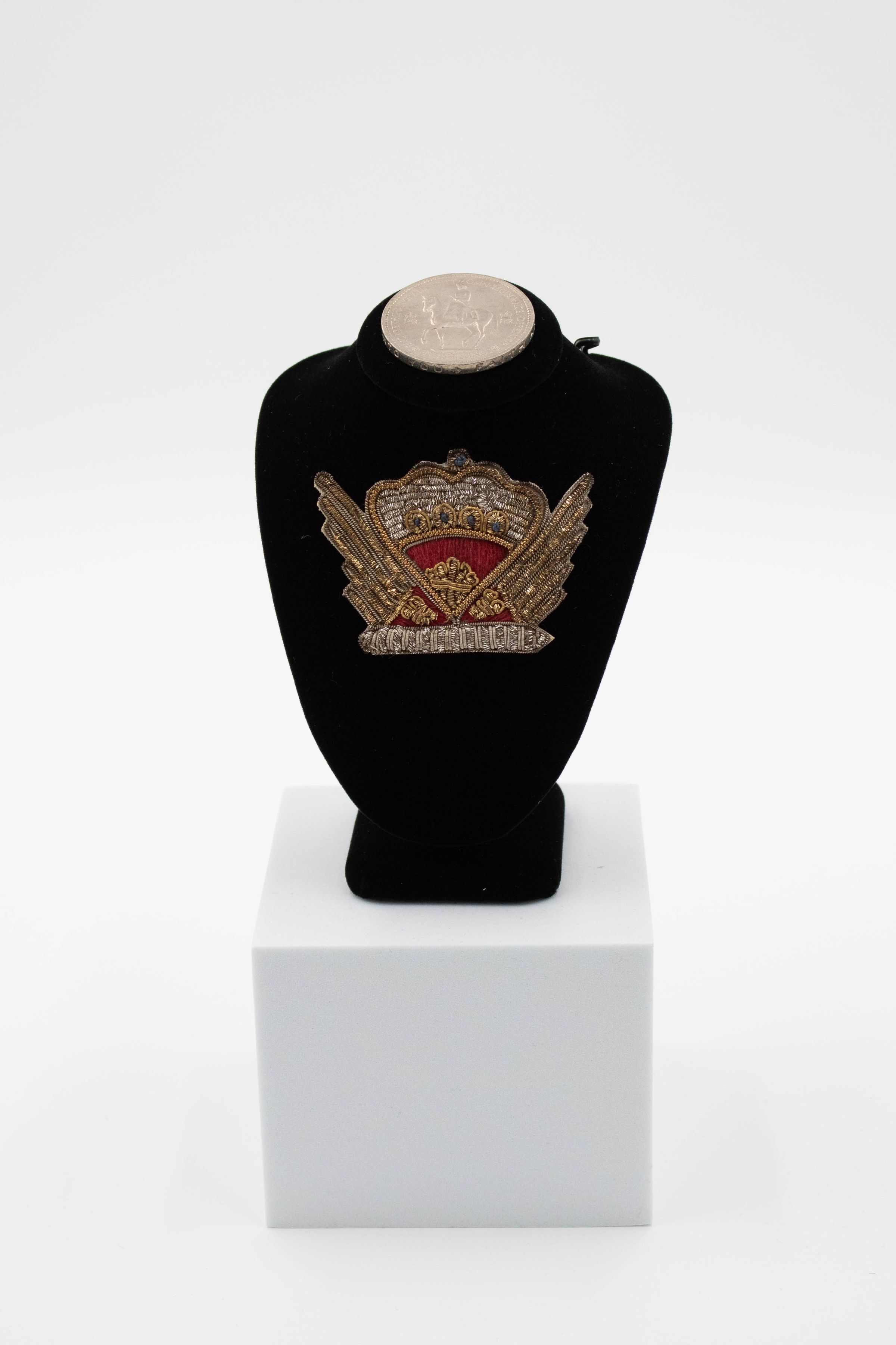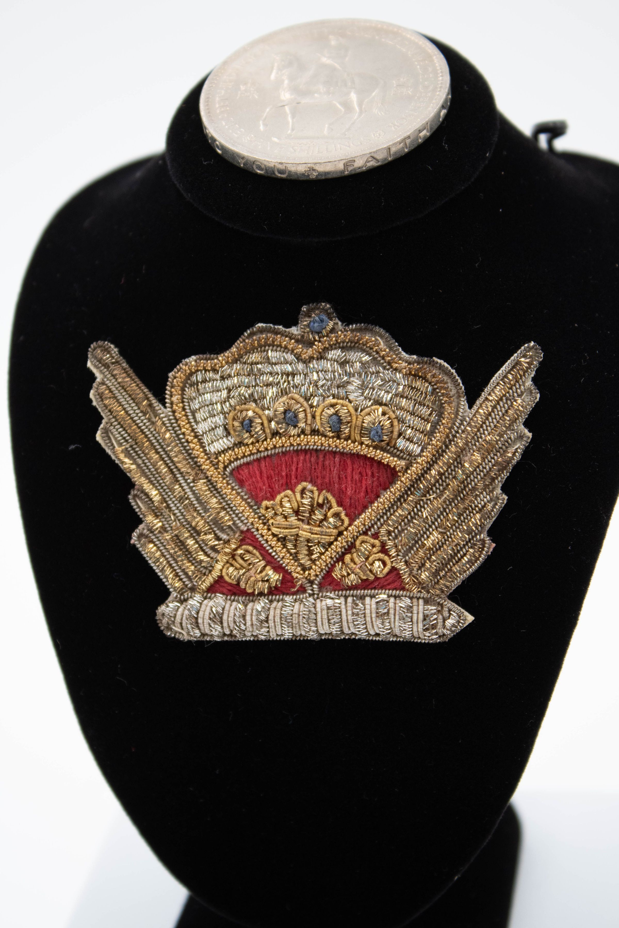 Red and silver crown pin given to Mrs. Jordan by Queen Elizabeth II; handmade in India; could also possibly be British Army Regiment Parachute Badge.Context