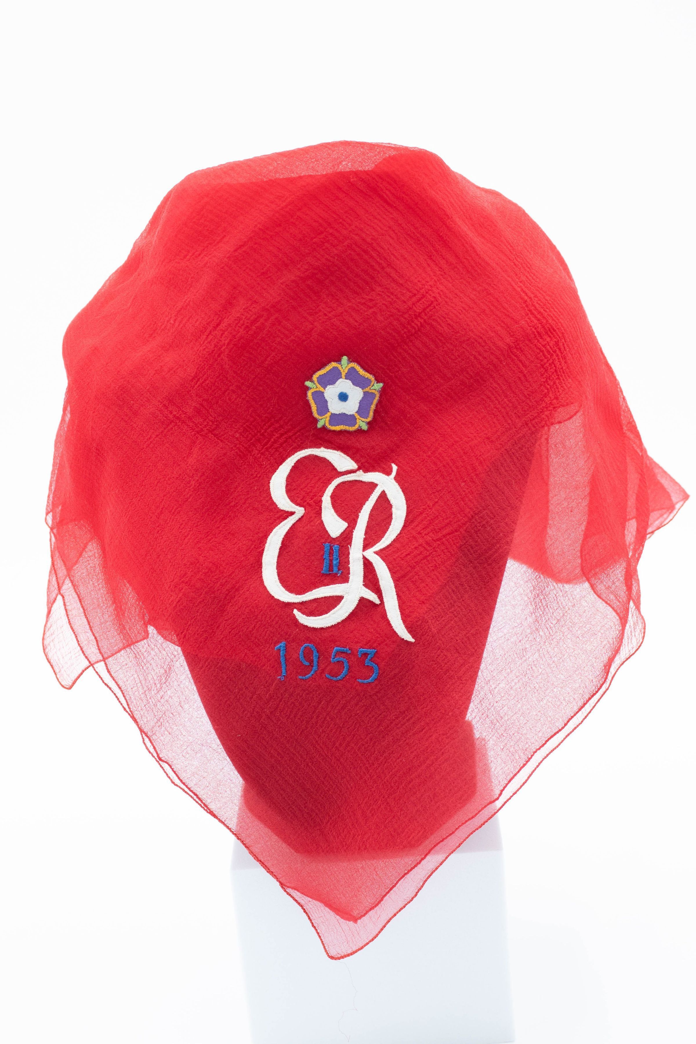 Red embroidered scarf from Queen Elizabeth II's coronation in 1953.Context