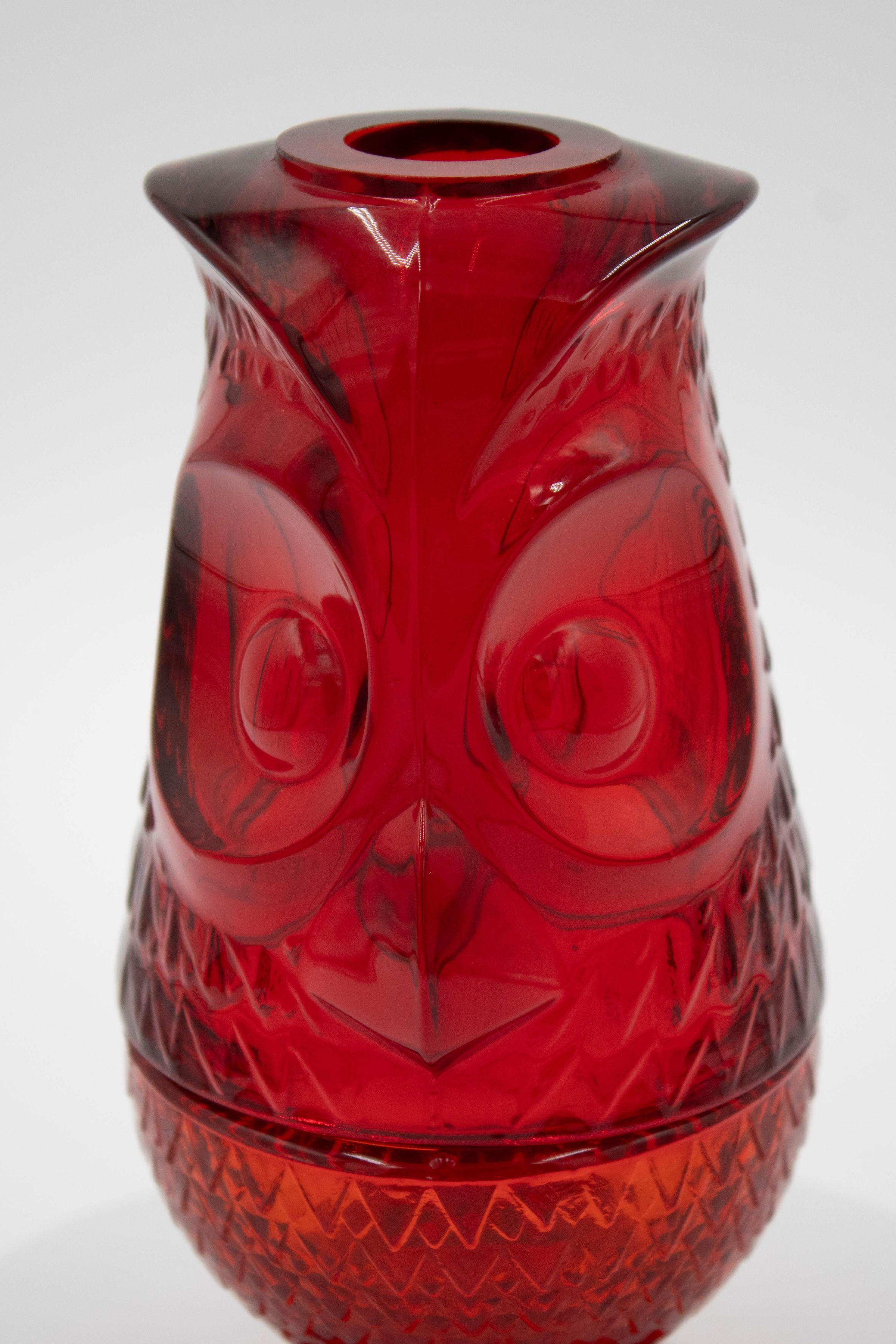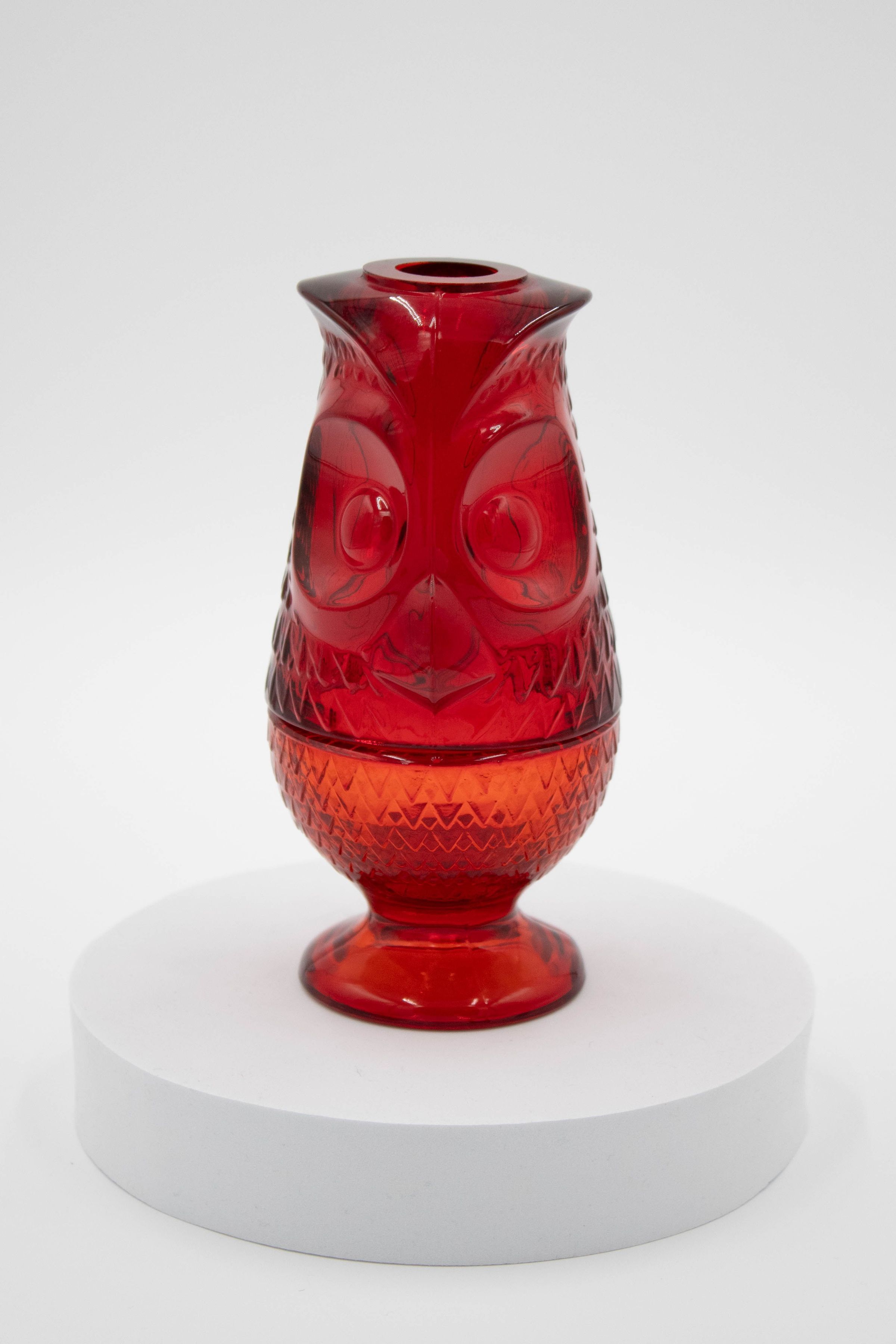 Red Viking Glass Owl Fairy Light. Red owl-shaped, tall candle light.Context