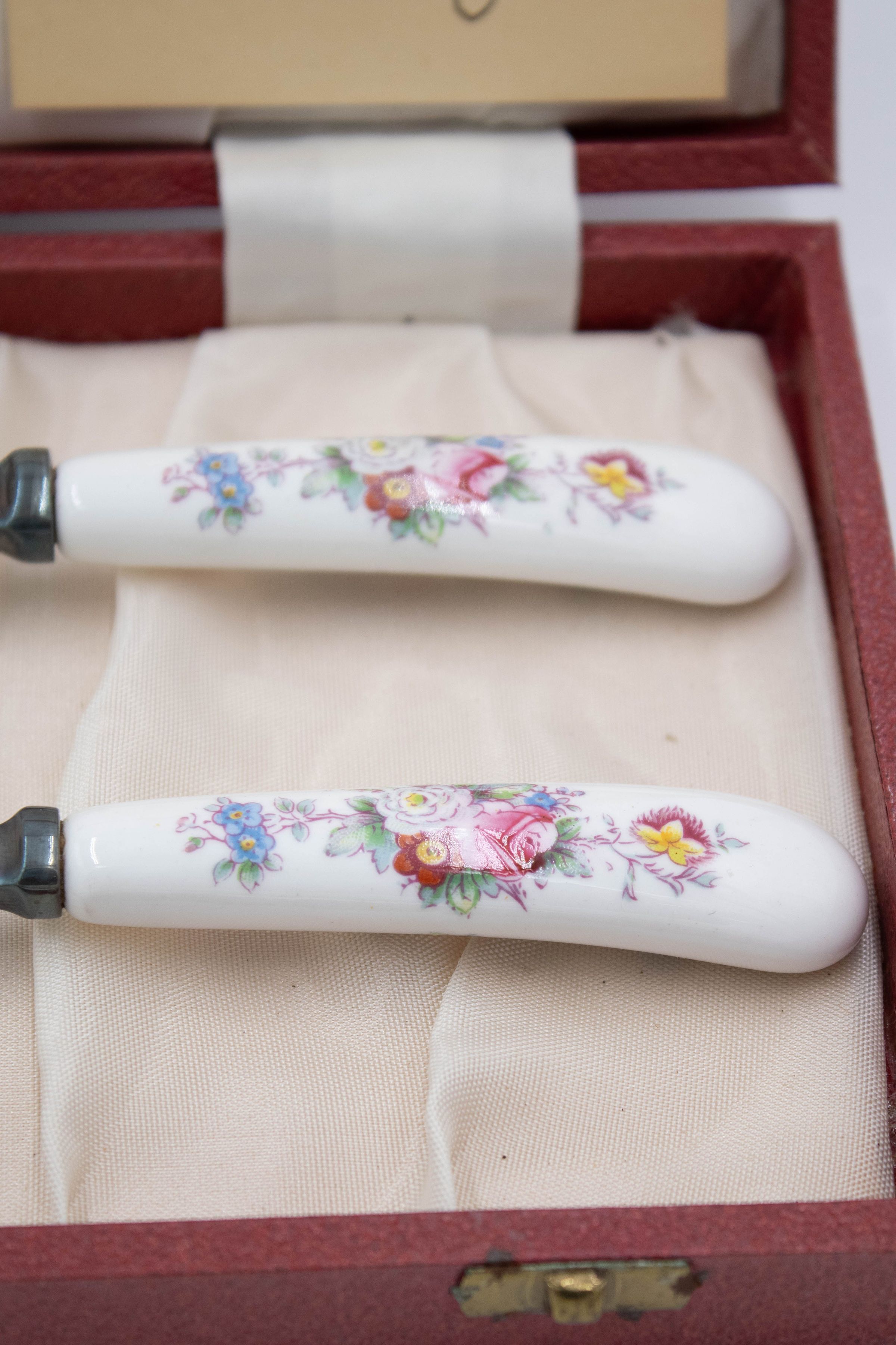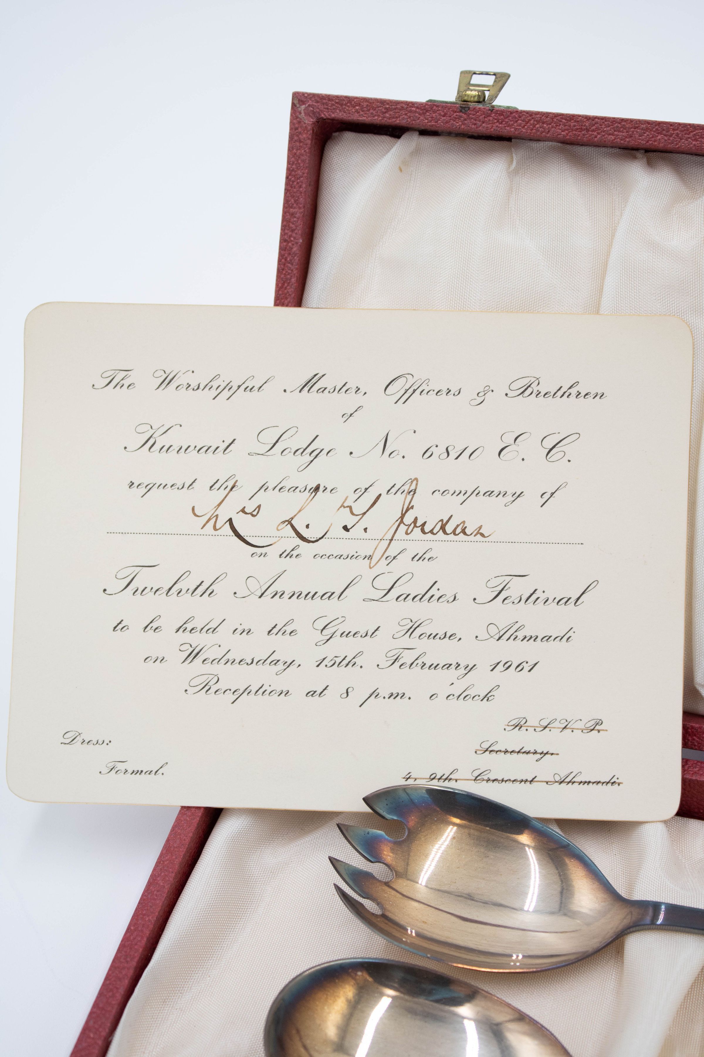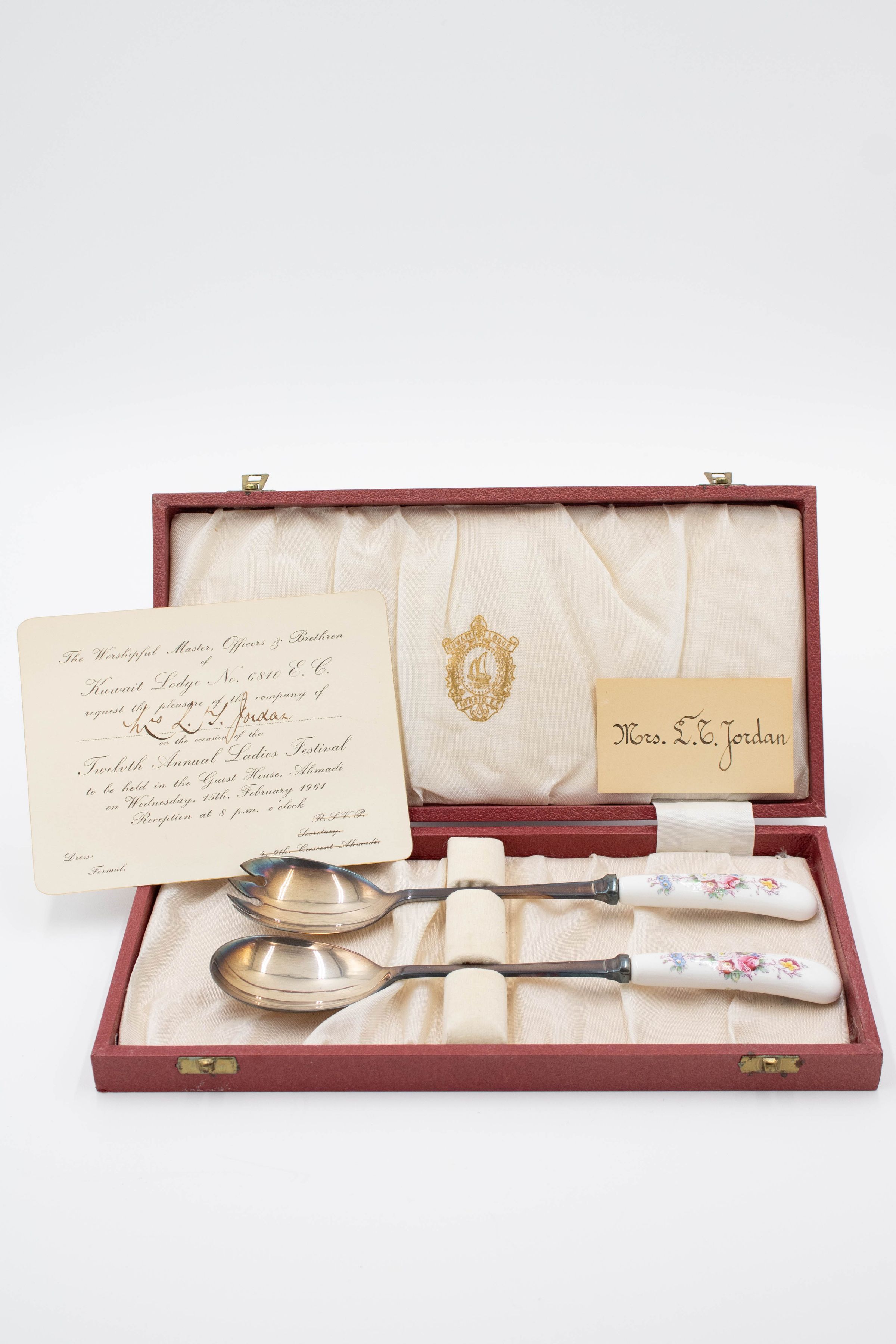 The two Royal Crown Derby serving spoons have bone China handles with a floral pattern and silver ends. They are in a red case lined with off-white satin and the Kuwait Masonic Lodge 6810 seal in gold. There are also two notecards, one is an invitation from the Ladies' Night and the other just says "Mrs. L.T. Jordan." Royal Crown Derby has been producing tableware and ornamental items since the 1750s and is known for their high-quality bone China.Context