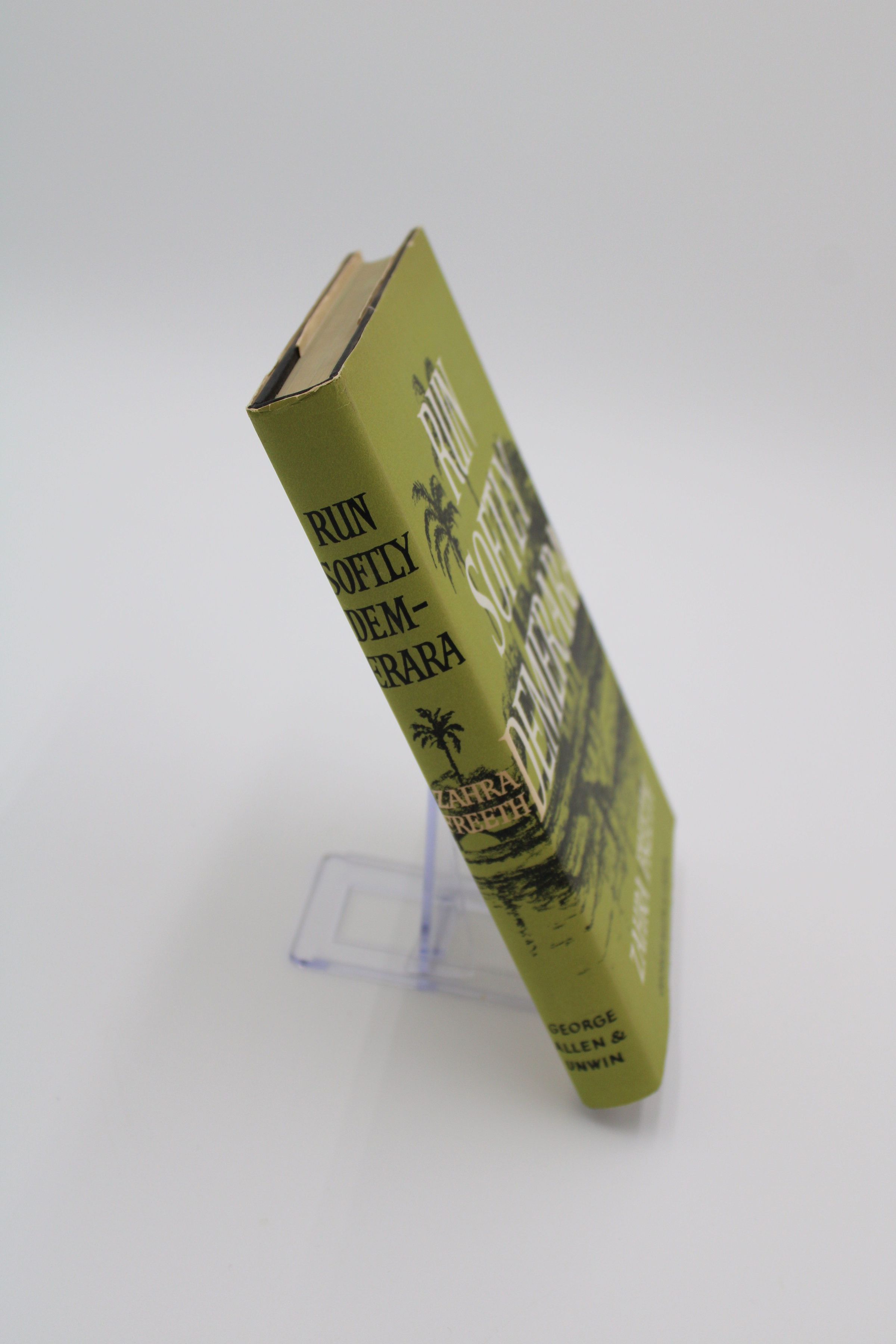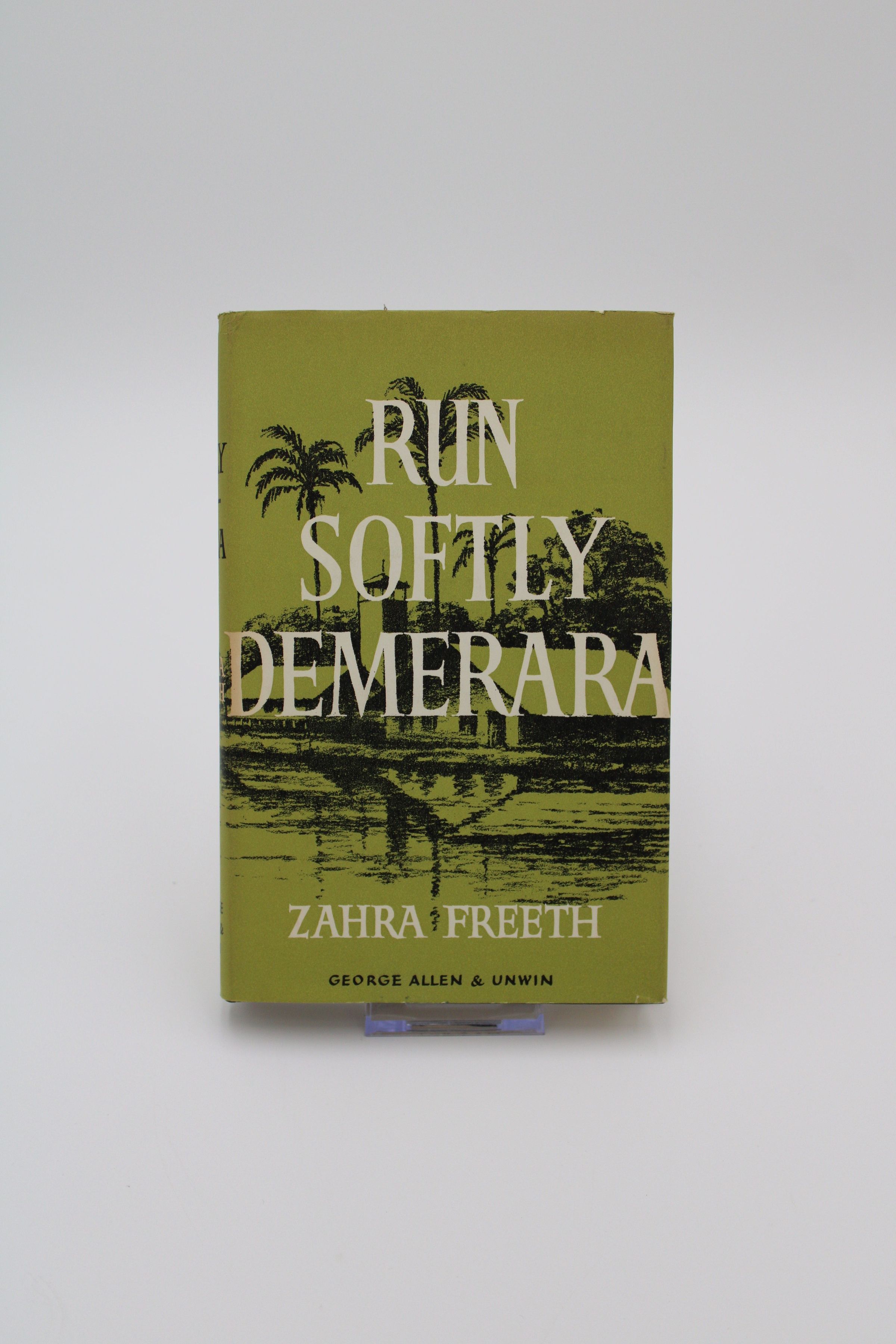 The front cover of “Run Softly Demerara” features a olive and black drawn depiction of a seaside Bauxite mining community in Guayana. The title is featured in front of the drawing in large white capital serif letters.