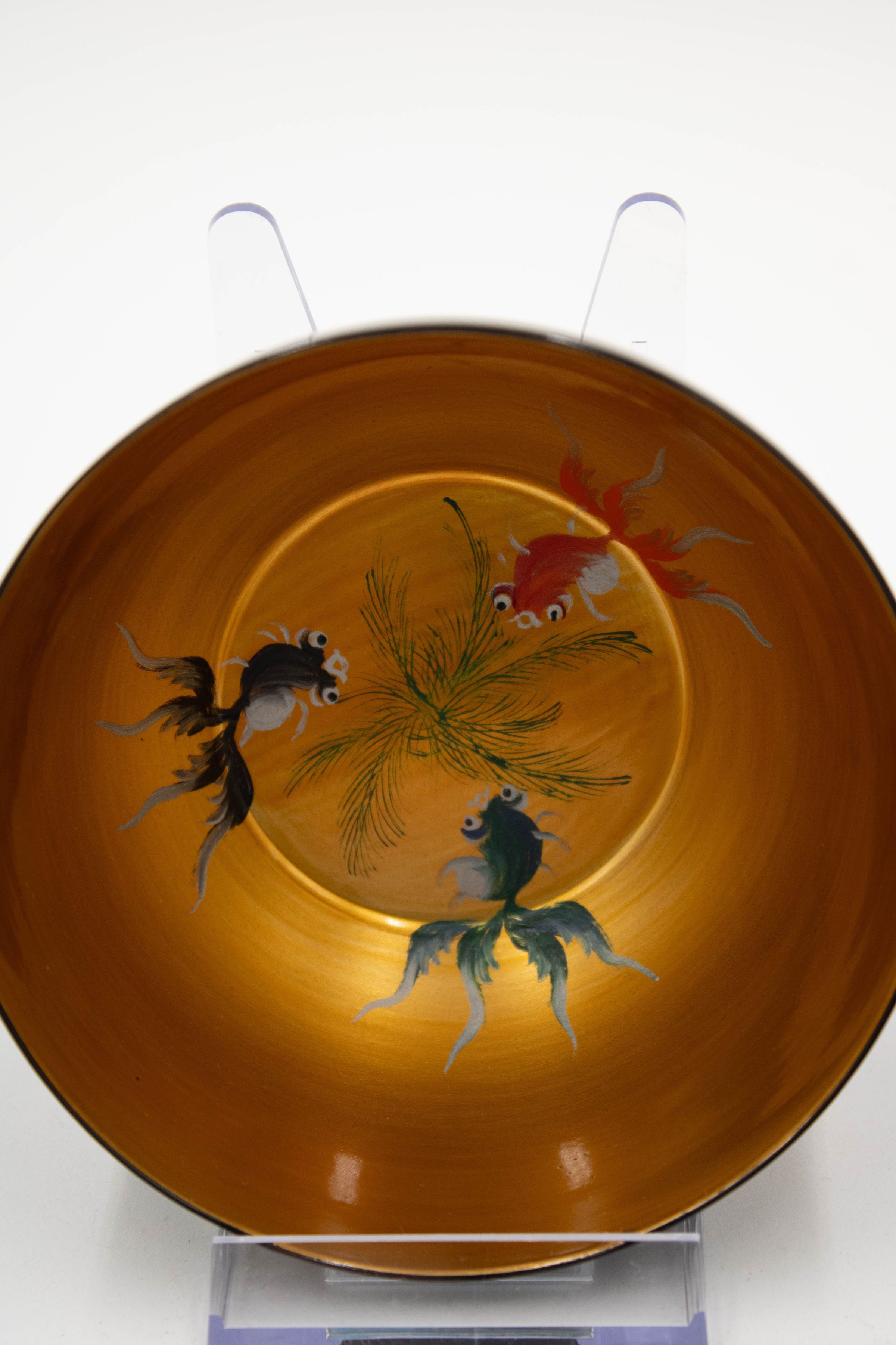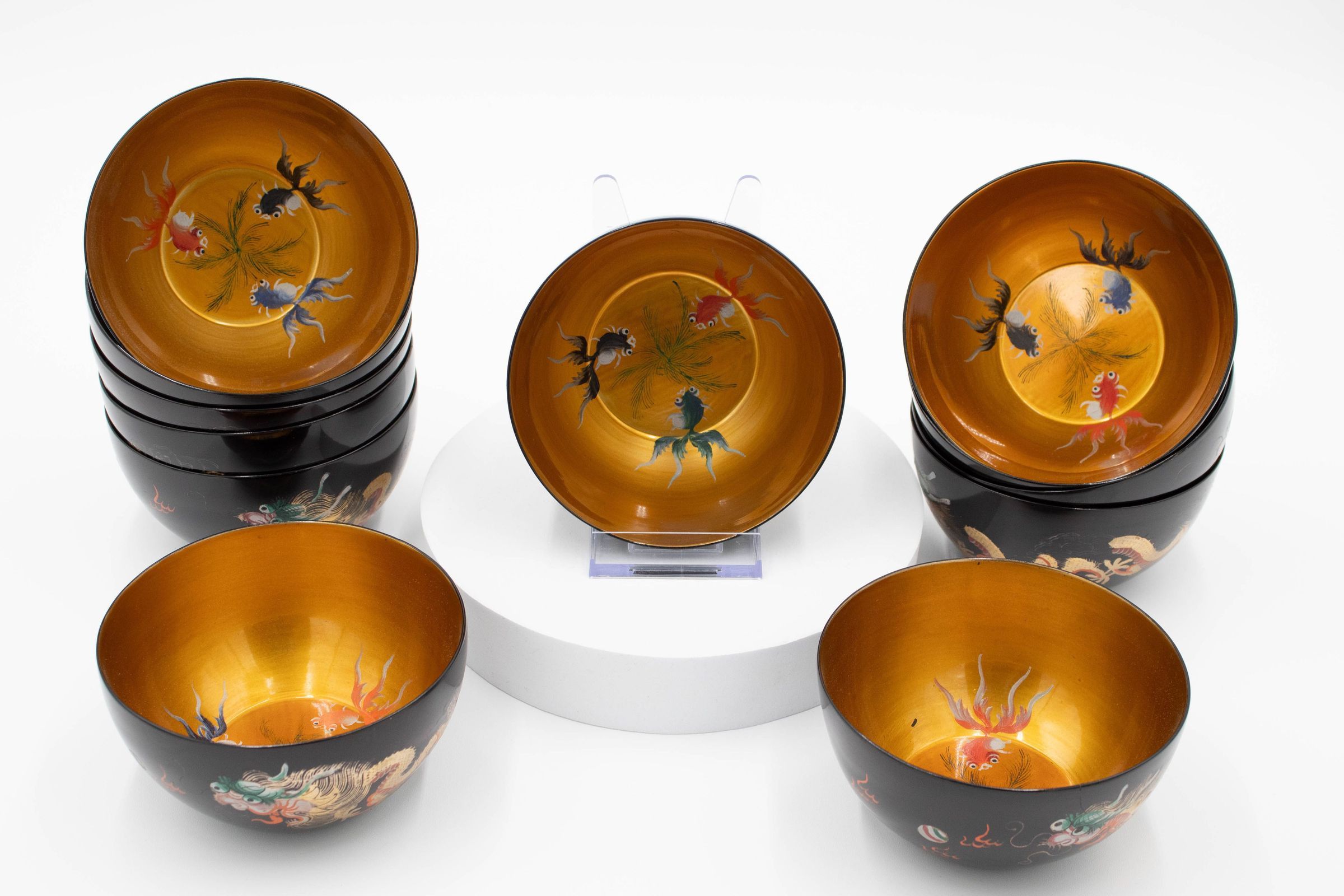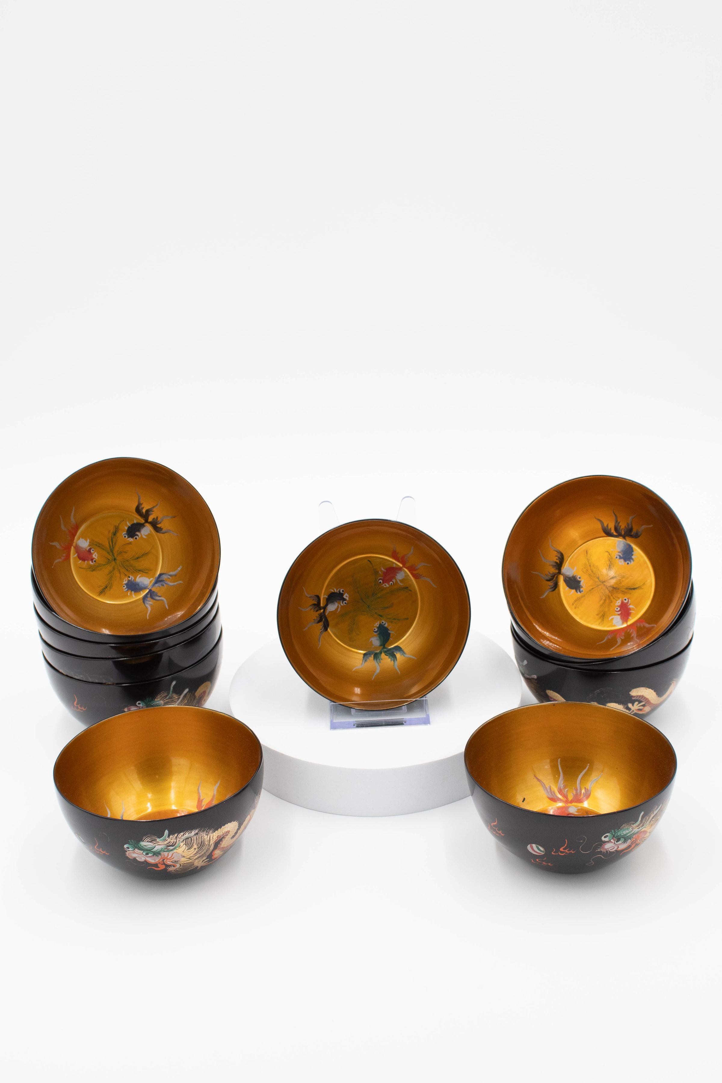 Set of 12 soups bowls decorated with a black exterior painted with a dragon and a gold interior painted with colorful goldfish. The bowls are lacquered and were made in China.Context