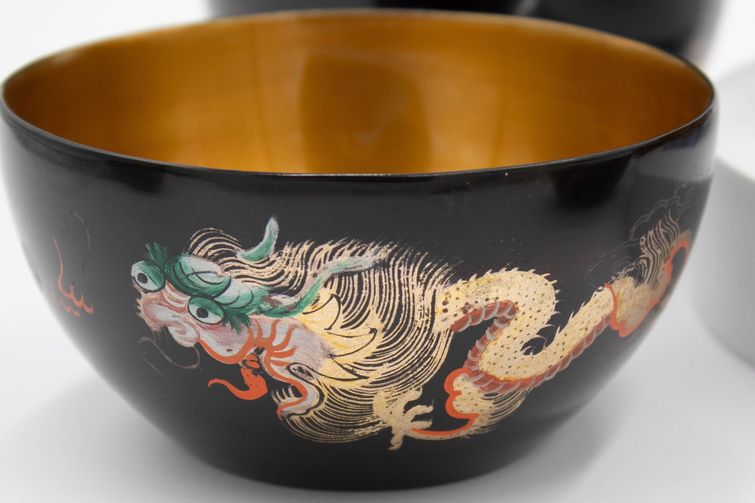 Set of Black Oriental Soup Bowls with Painted Dragon and Gold Interior with Painted FishEntry/Object ID