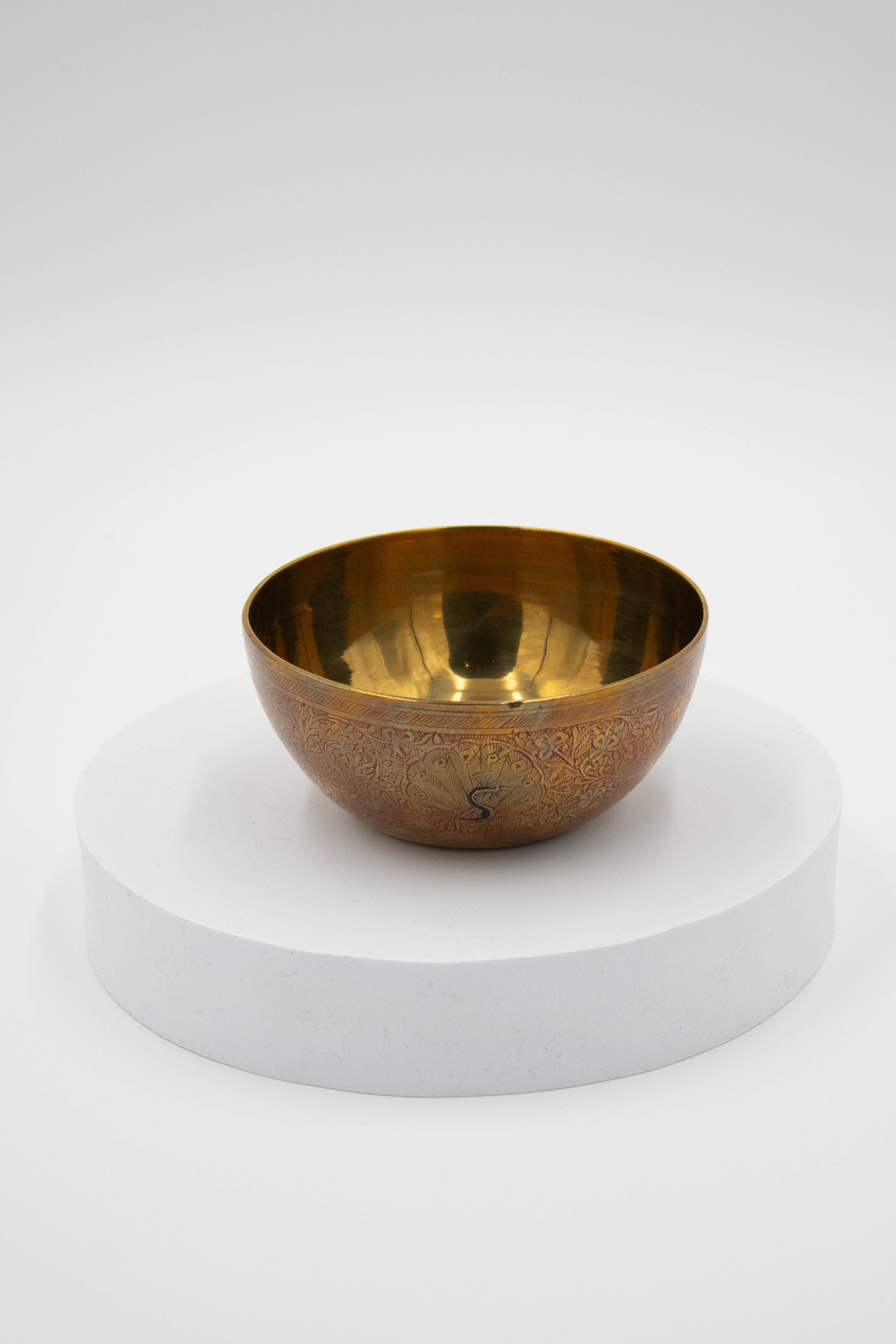 Brass bowls with blue peacock, red peacock, gold peacock, blue flower, and red flower designs.Parts