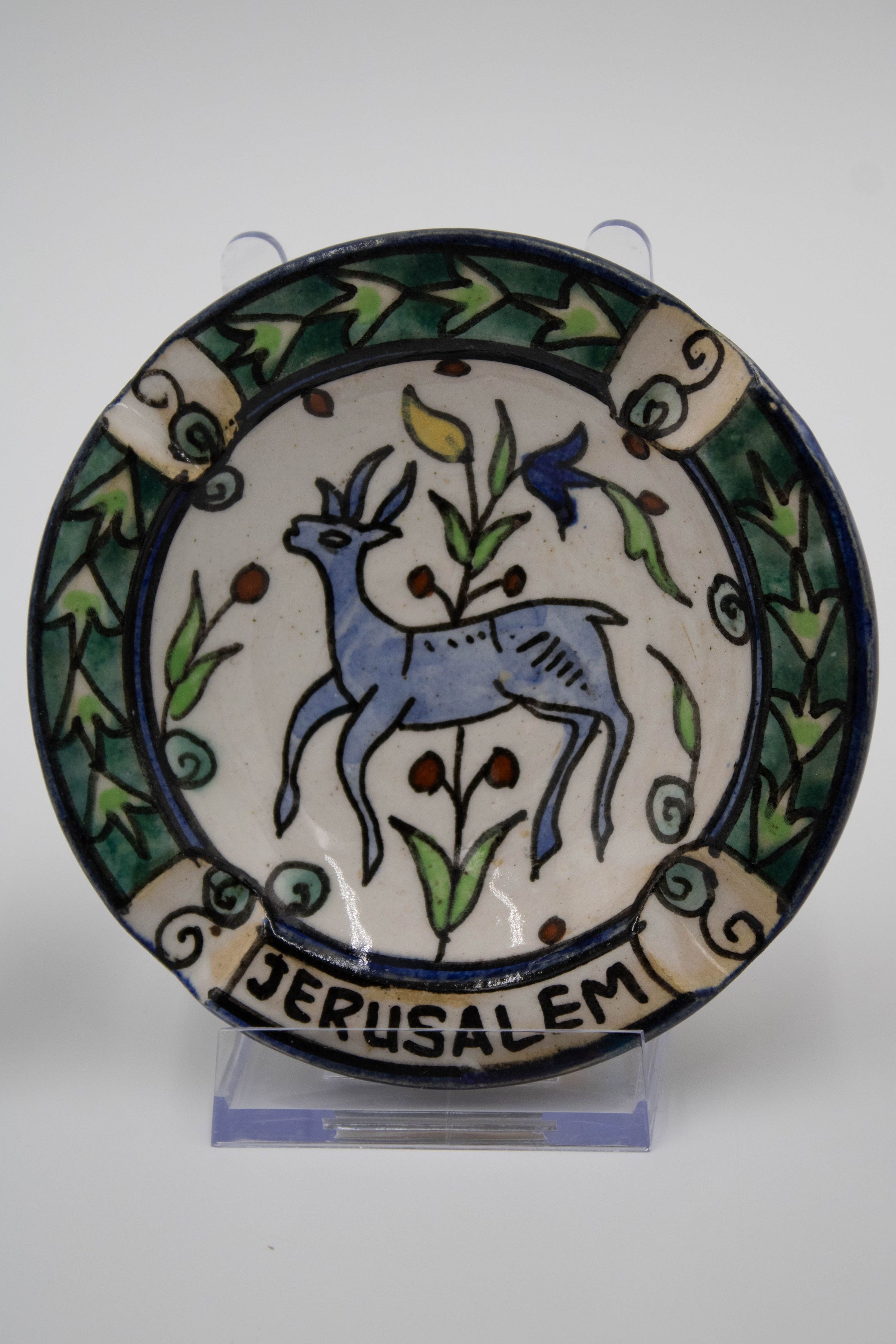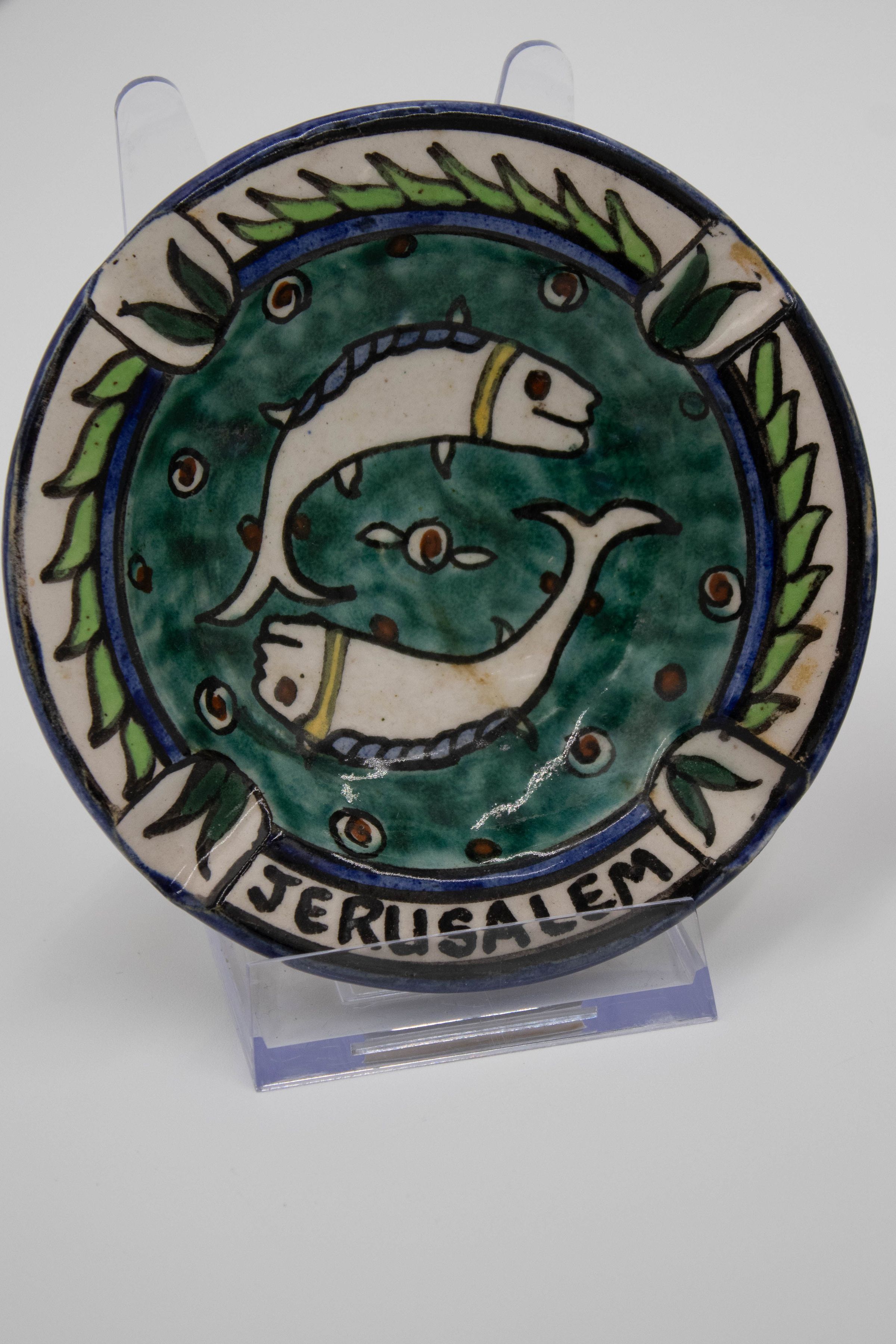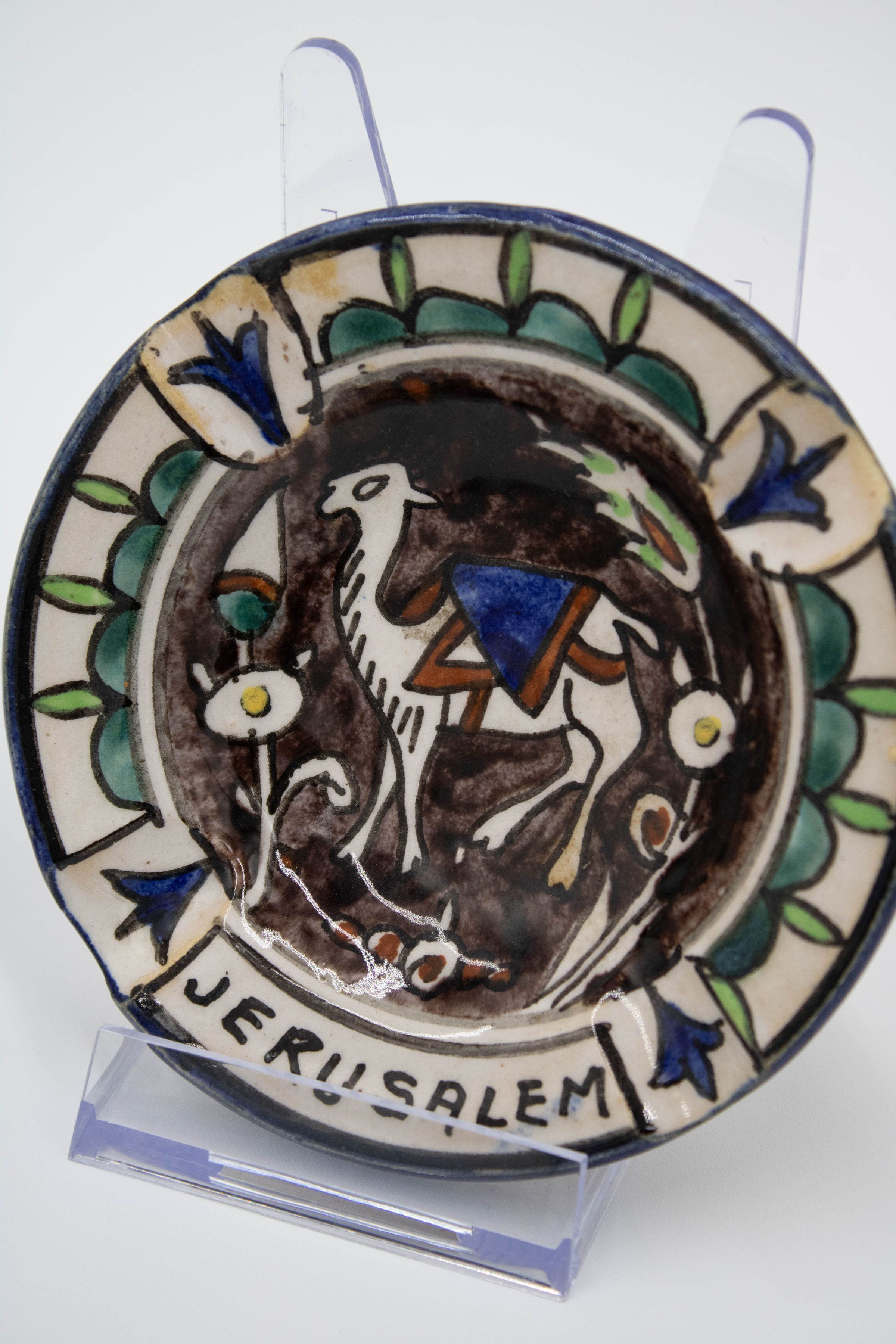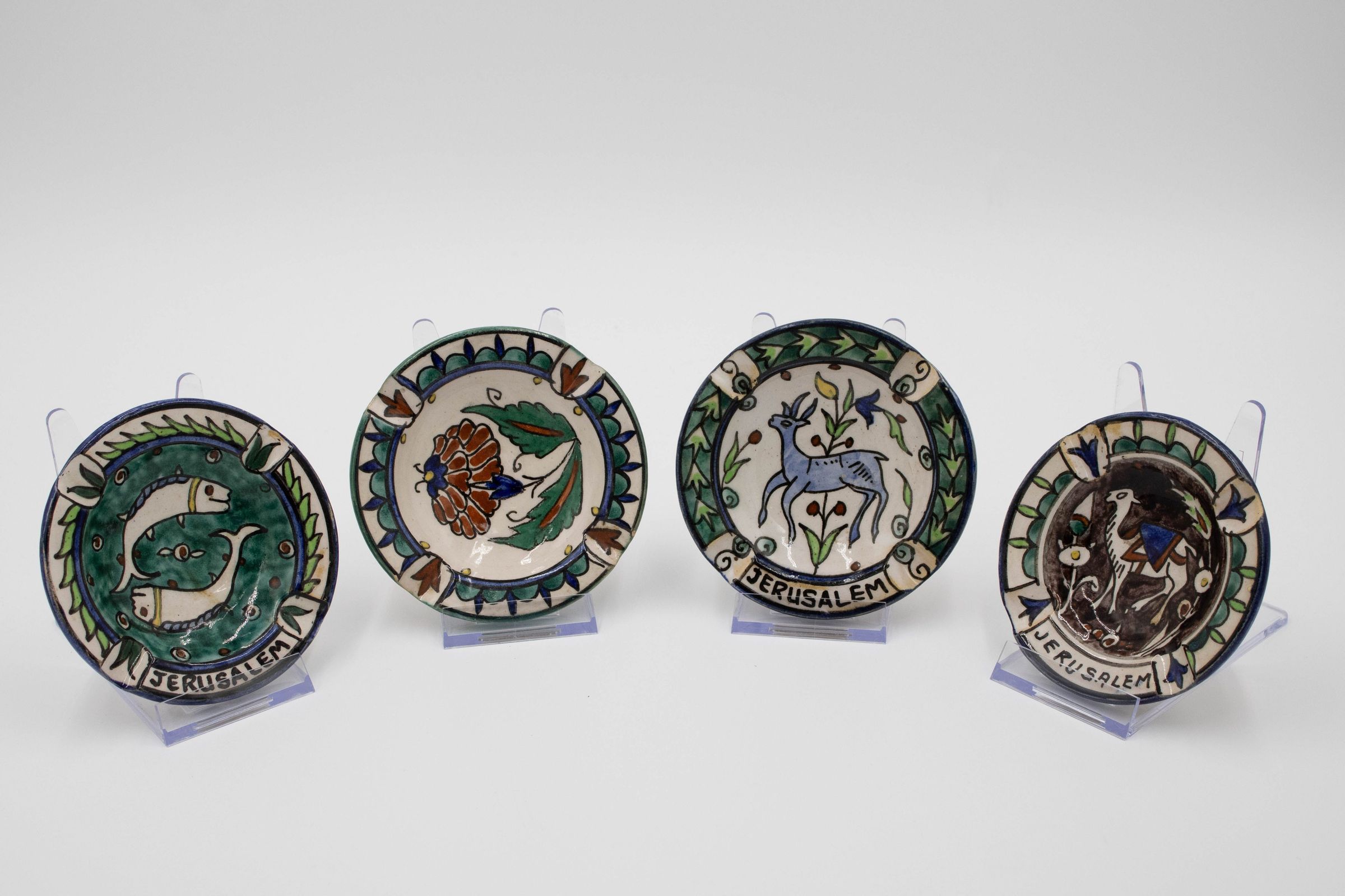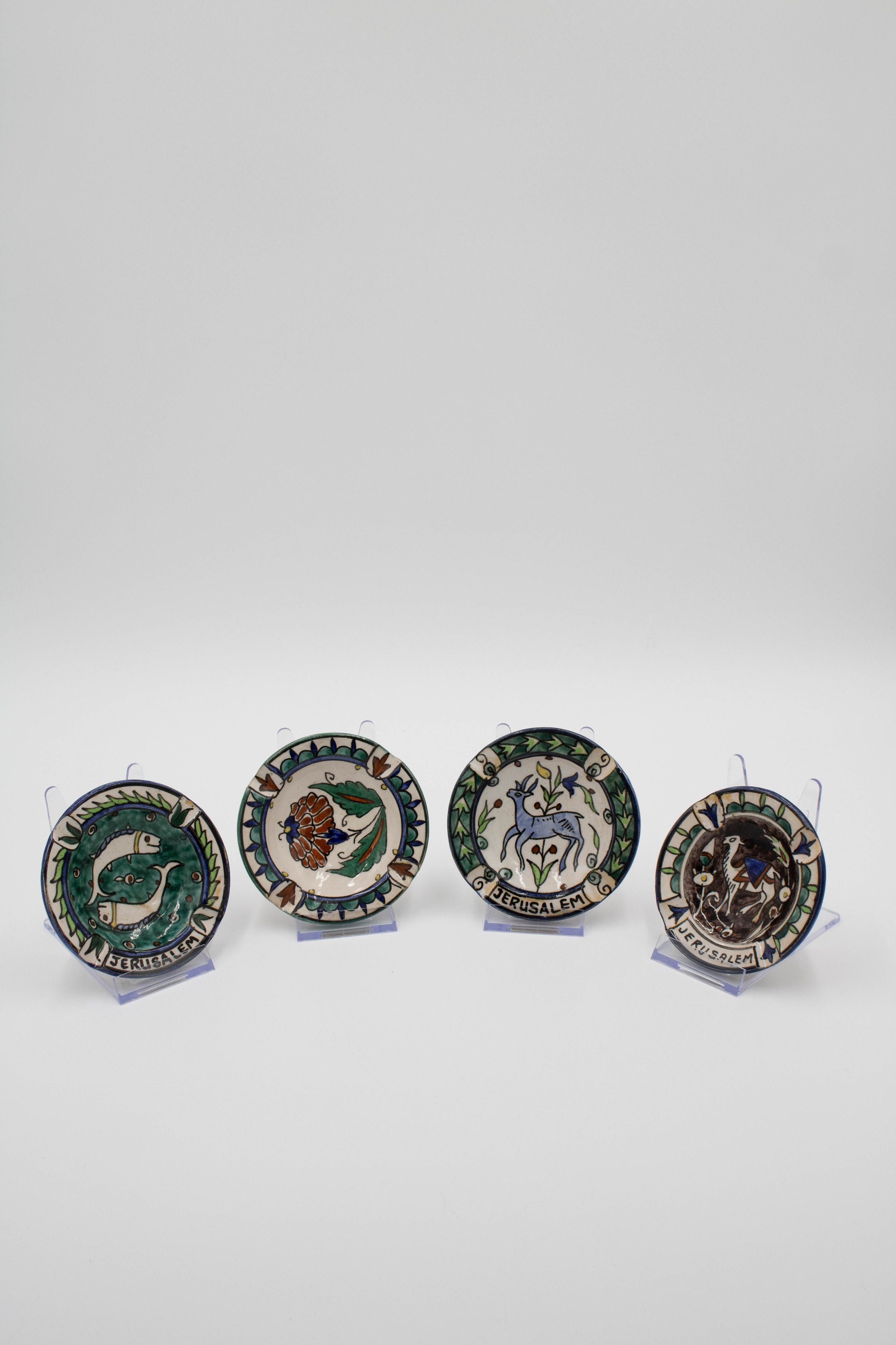Set of four ceramic ashtrays painted with traditional Israeli colors and patterns. Three of them are inscribed with "JERUSALEM" and were likely made/purchased there. The motifs painted on the ashtrays are consistent with other folk art from the Middle East made during the mid-20th century.Context