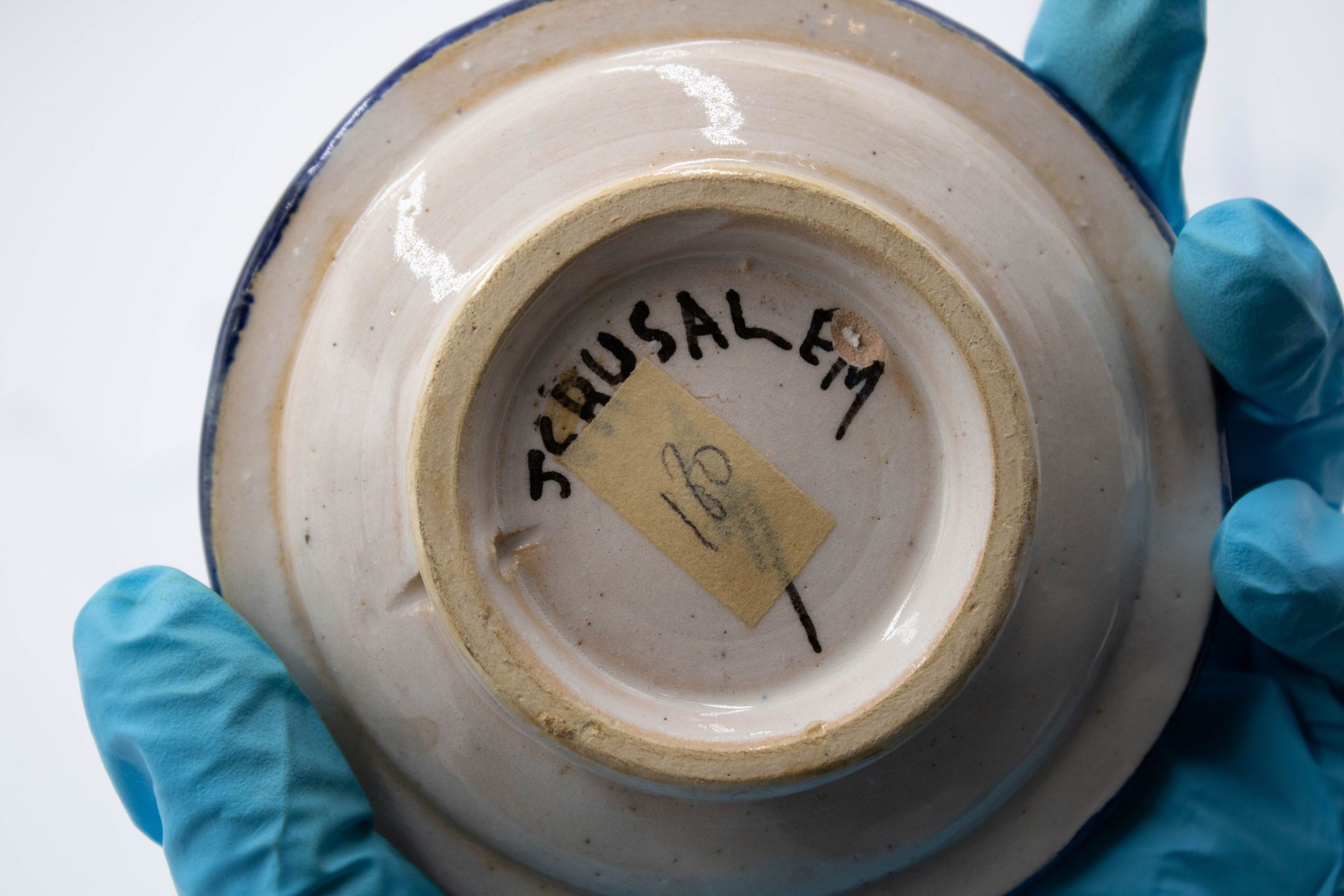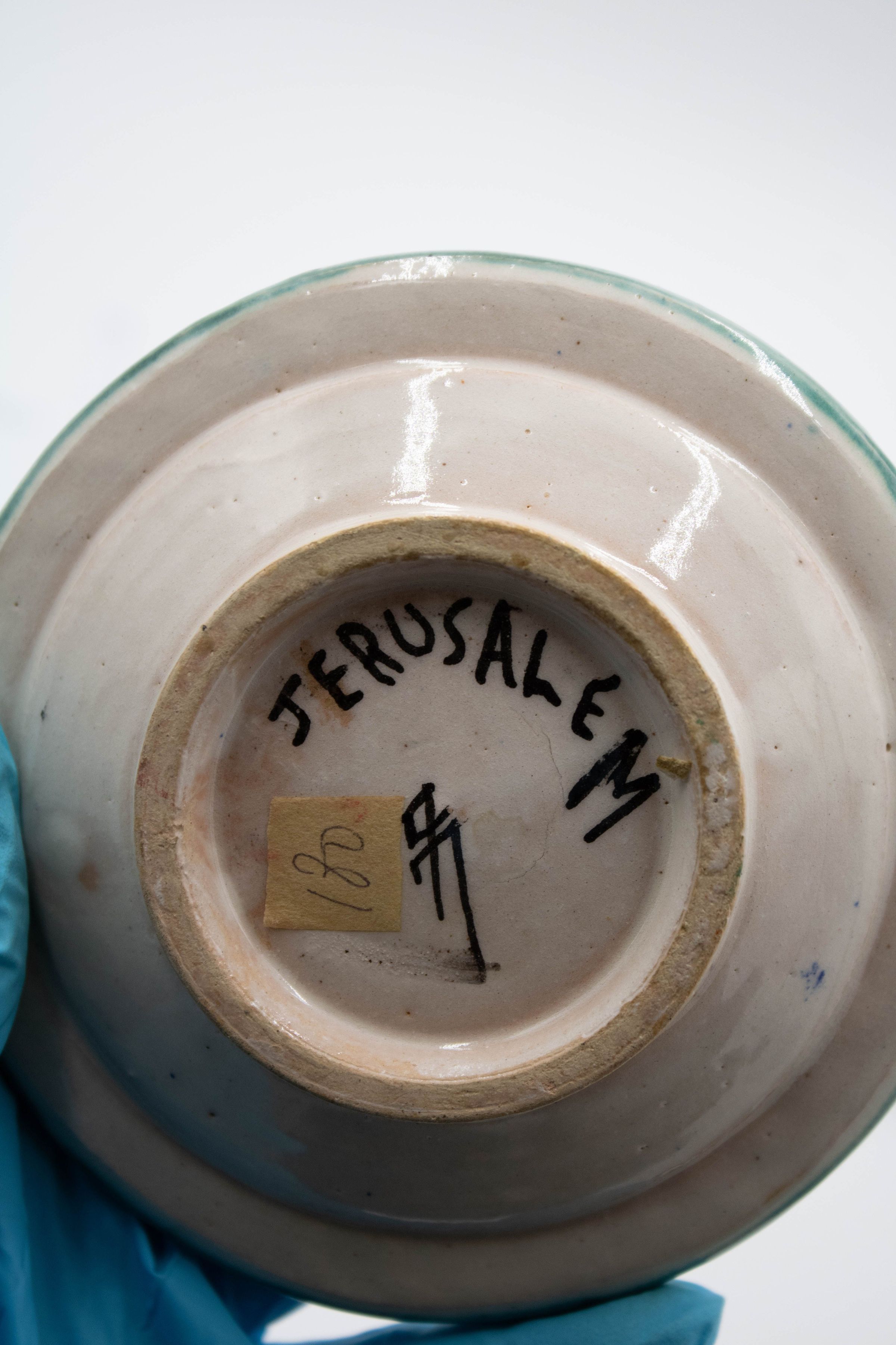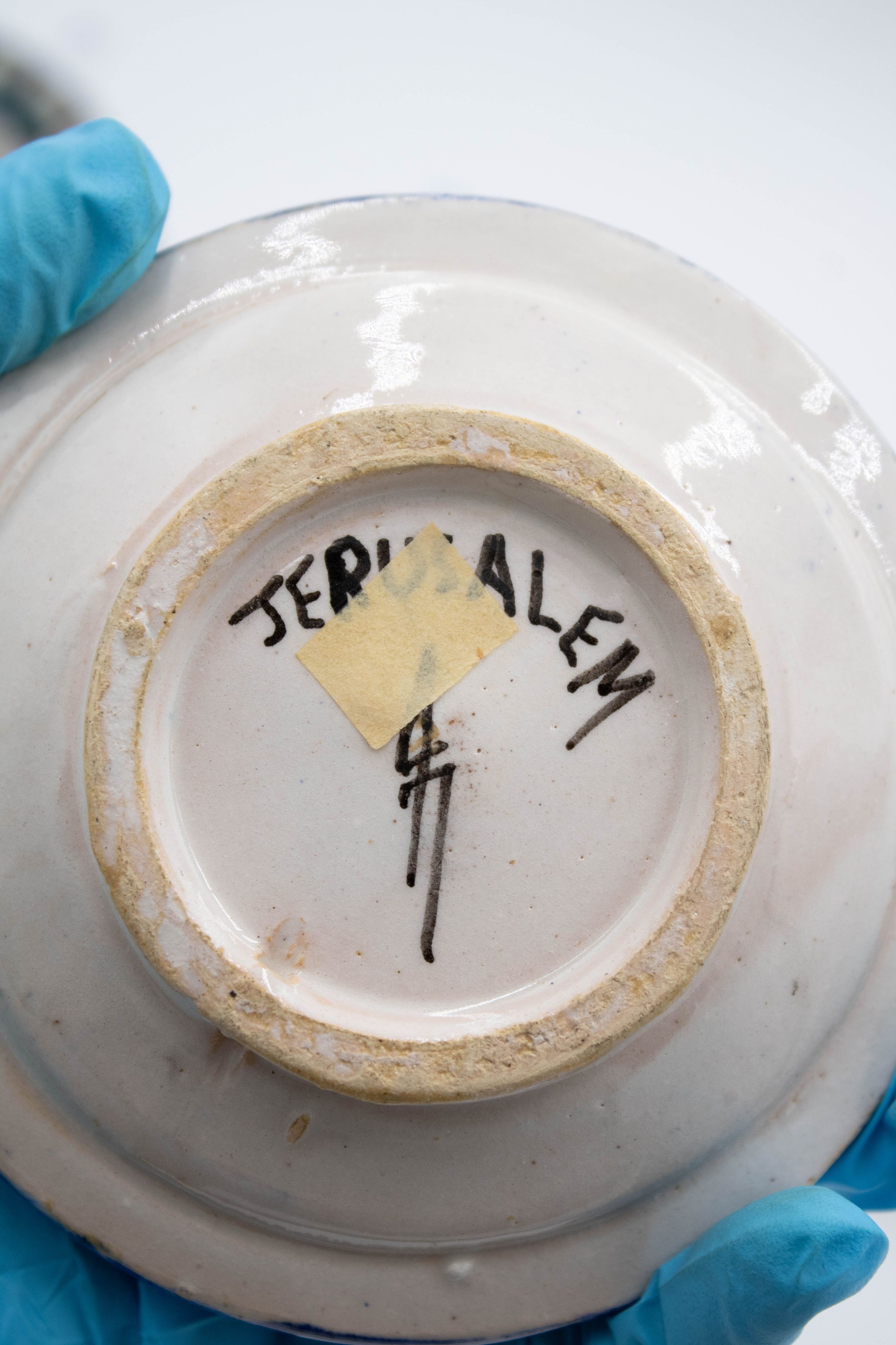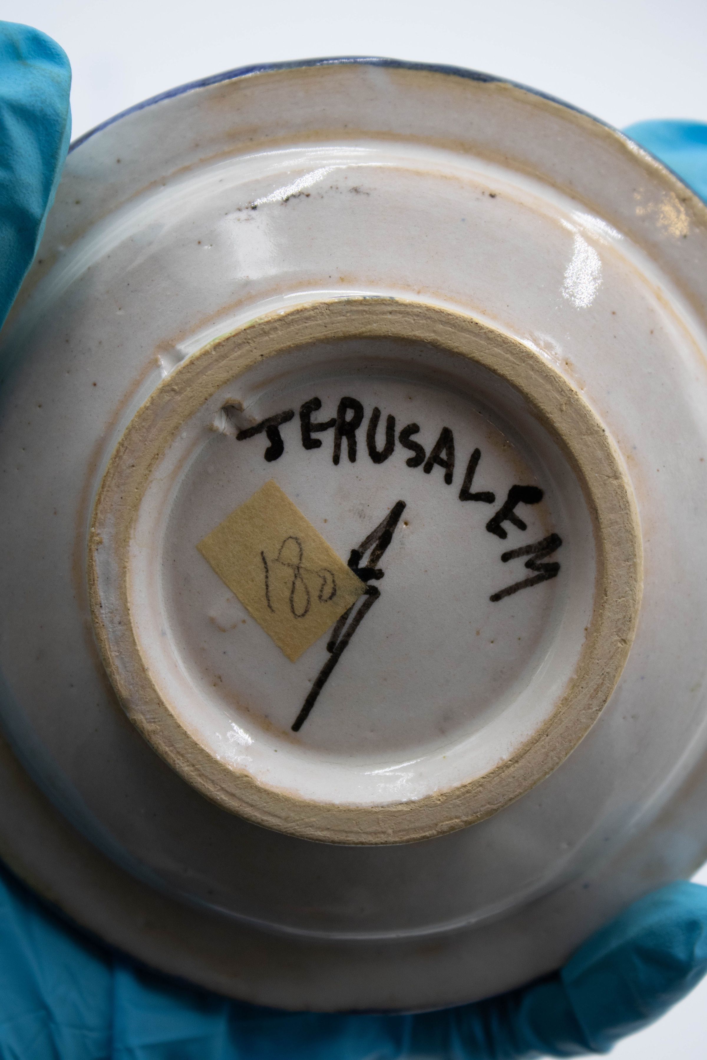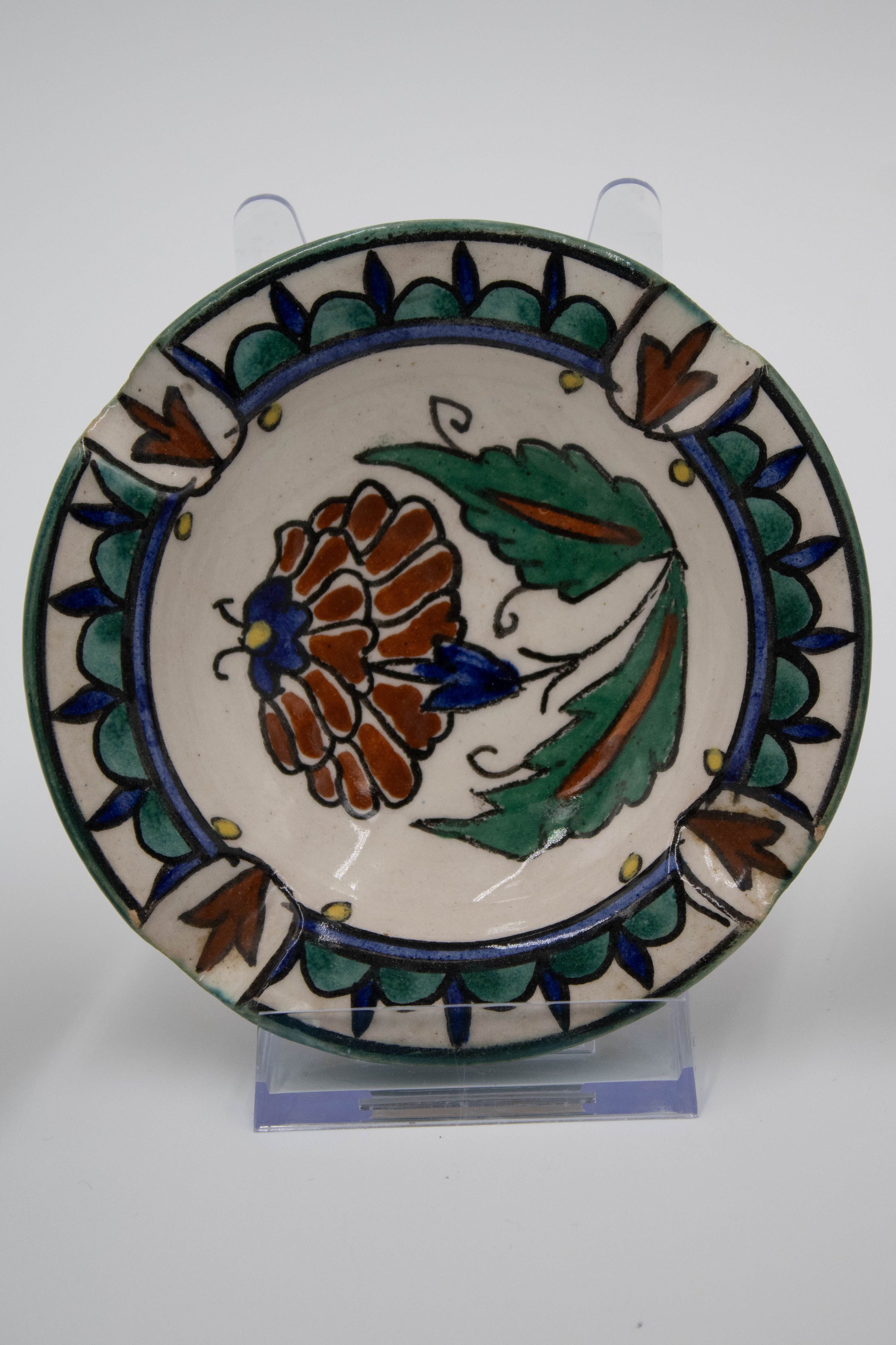 Set of four ceramic ashtrays painted with traditional Israeli colors and patterns. Three of them are inscribed with "JERUSALEM" and were likely made/purchased there. The motifs painted on the ashtrays are consistent with other folk art from the Middle East made during the mid-20th century.Context