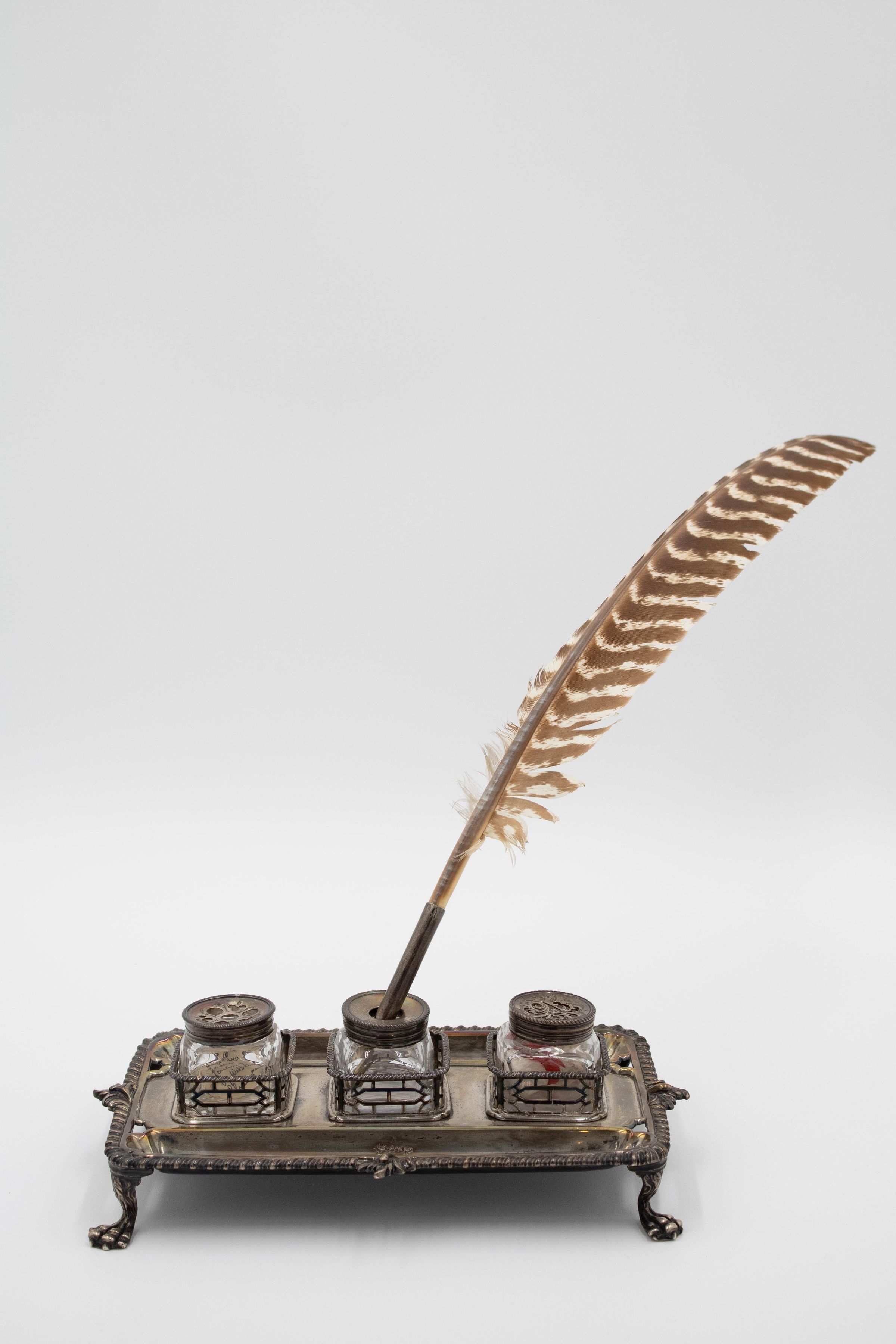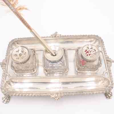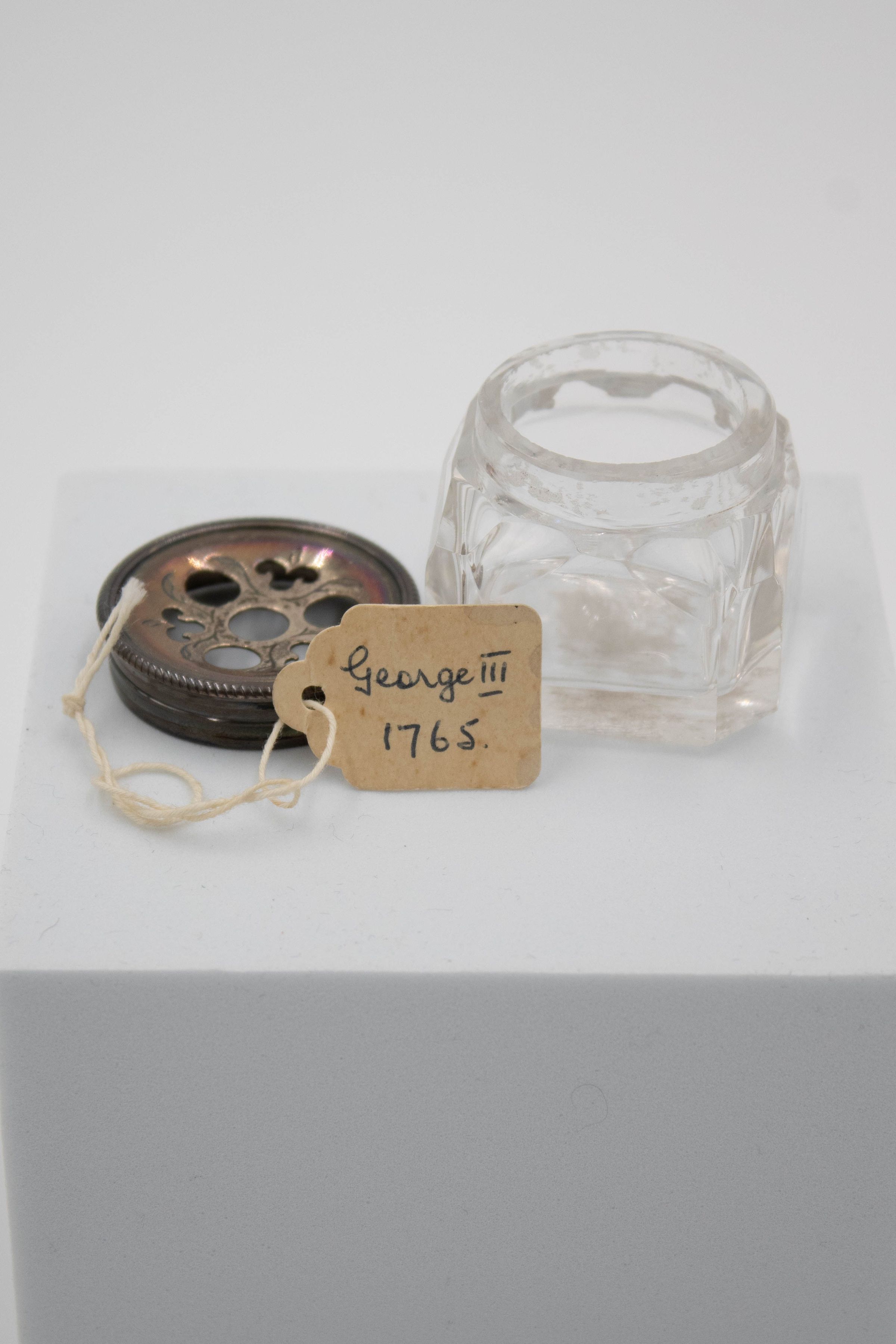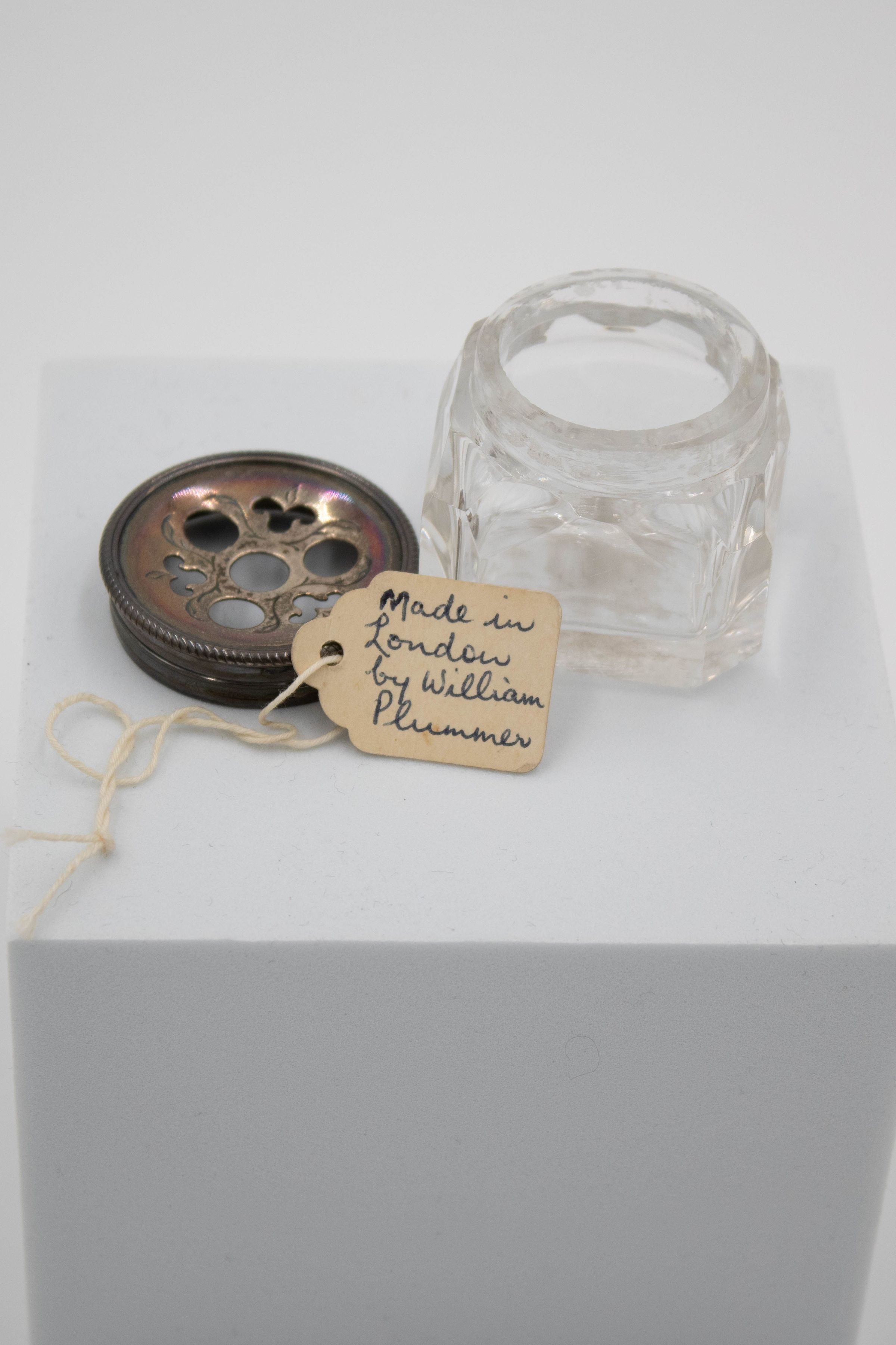 3 Crystal ink bottles; 1 empty, 1 containing a note reading "Made in London by William Plummer, George III 1765," 1 containing an extra quill tip.Context