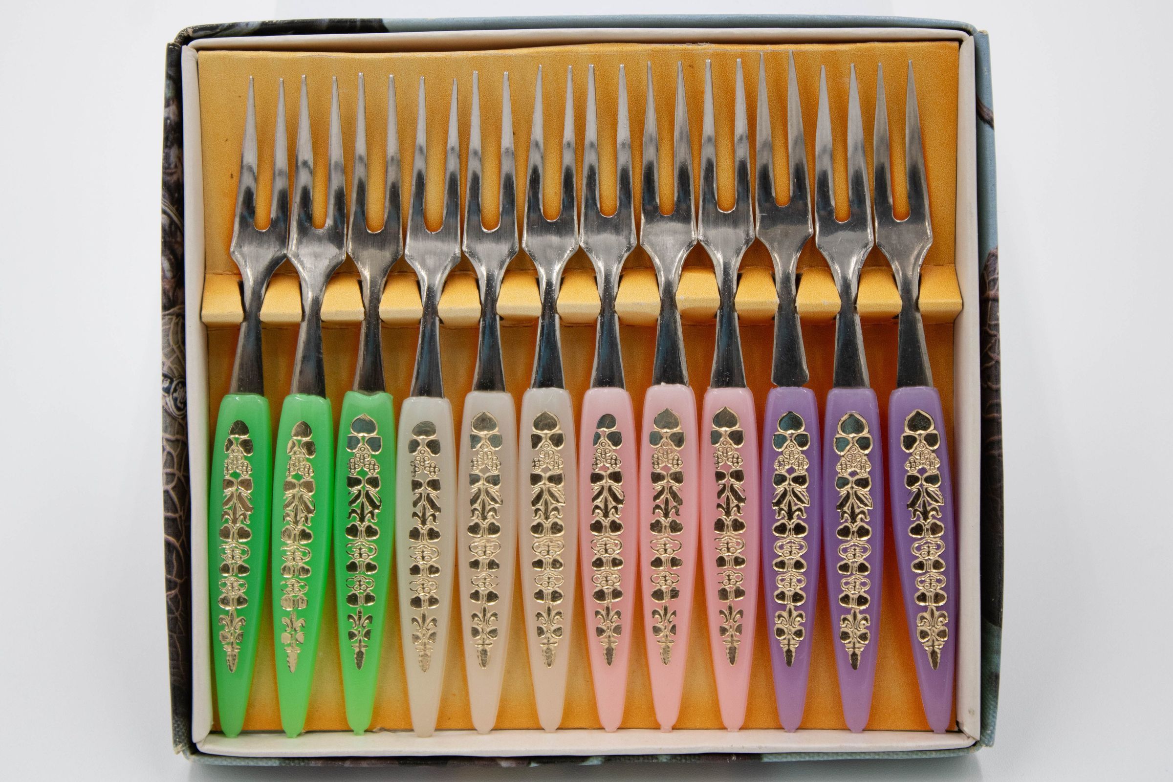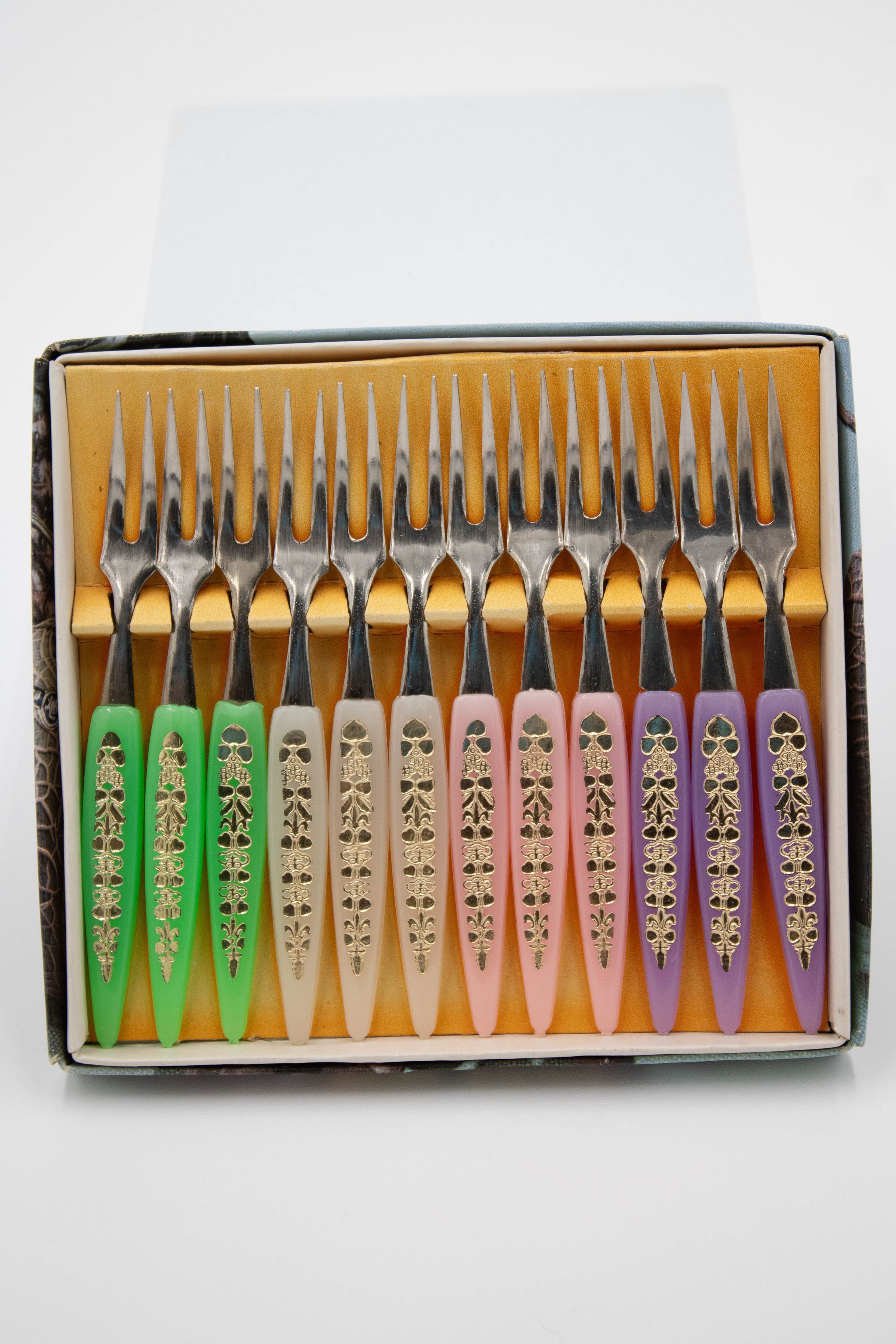 Set of twelve little forks were made in Japan and come in purple, pink, white, and green handles. They were produced during the mid-20th century.Context