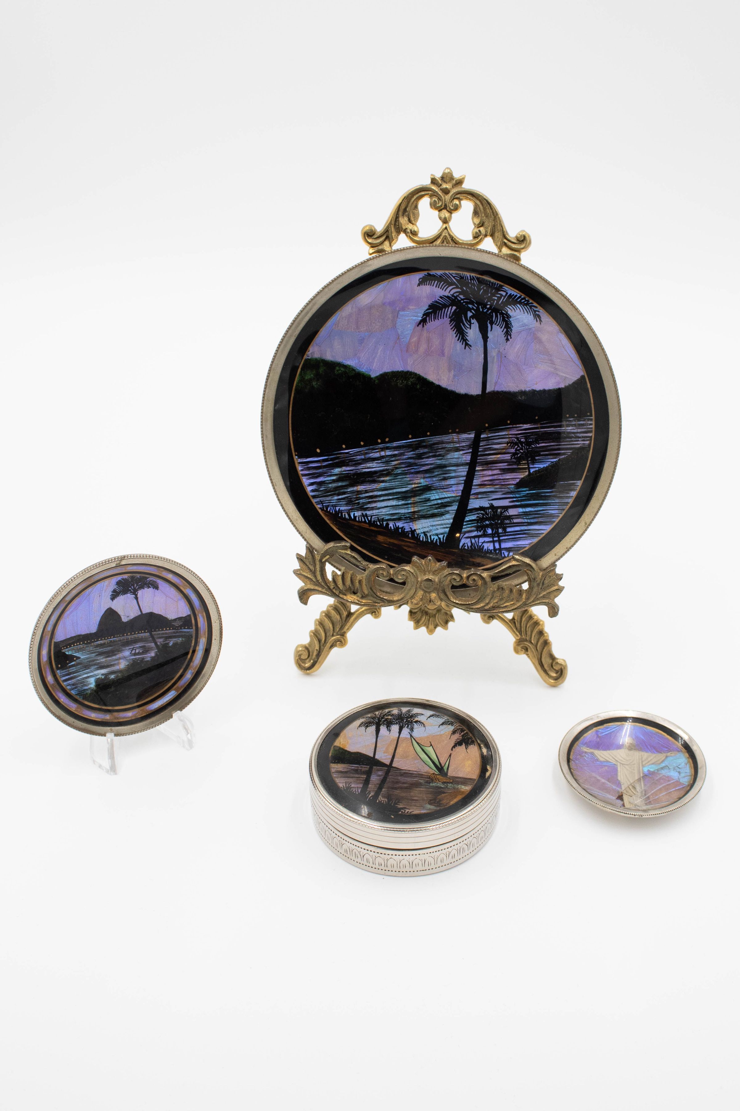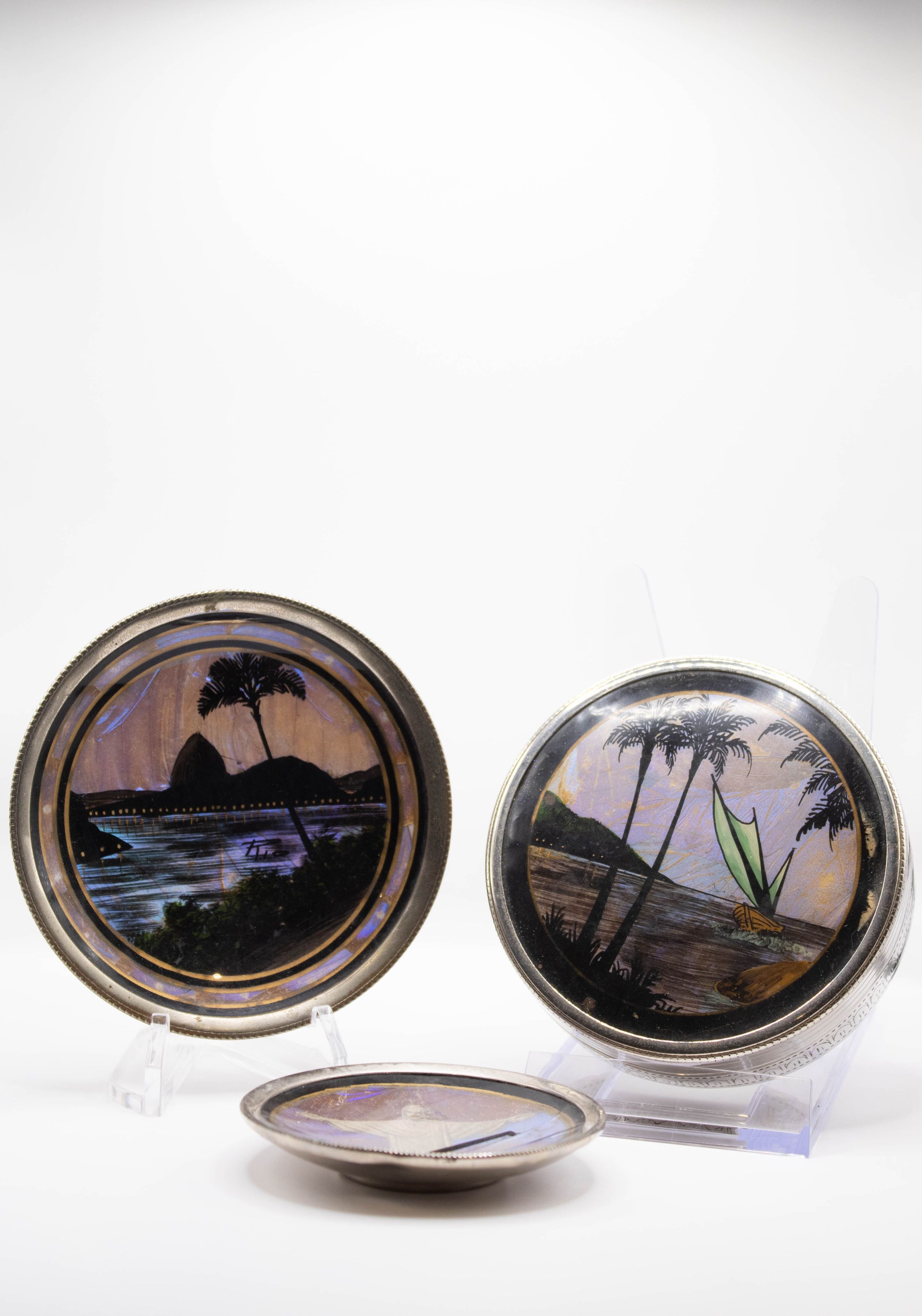 Image of all three coasters. The left coaster is on a plastic stand and depicts an oasis scene, with a palm tree and bushes in the foreground and a body of water, bridge, and mountains in the background. The right coaster is on a plastic stand and it depicts another oasis scene, this time with a ship in its background rather than a bridge.