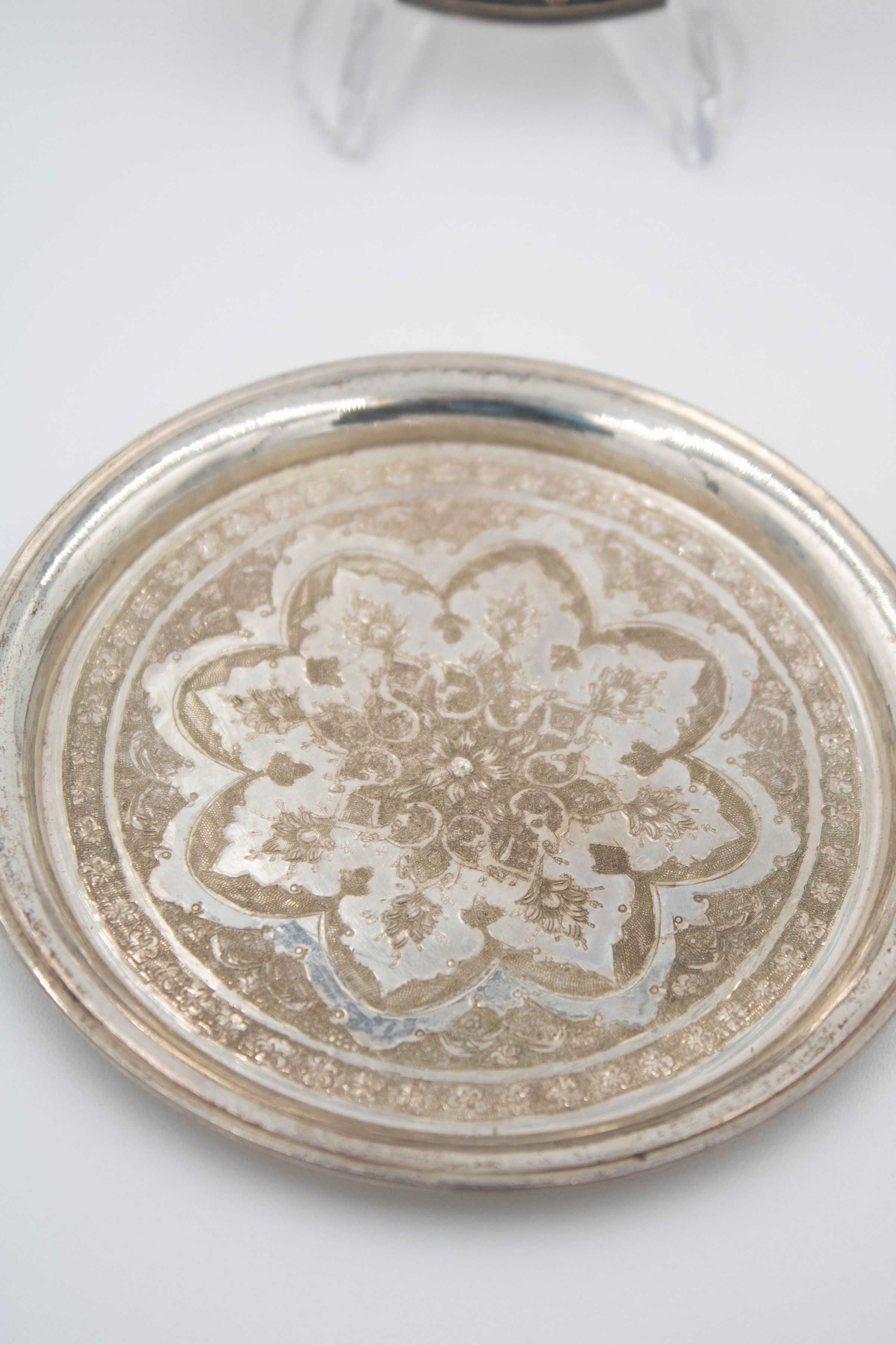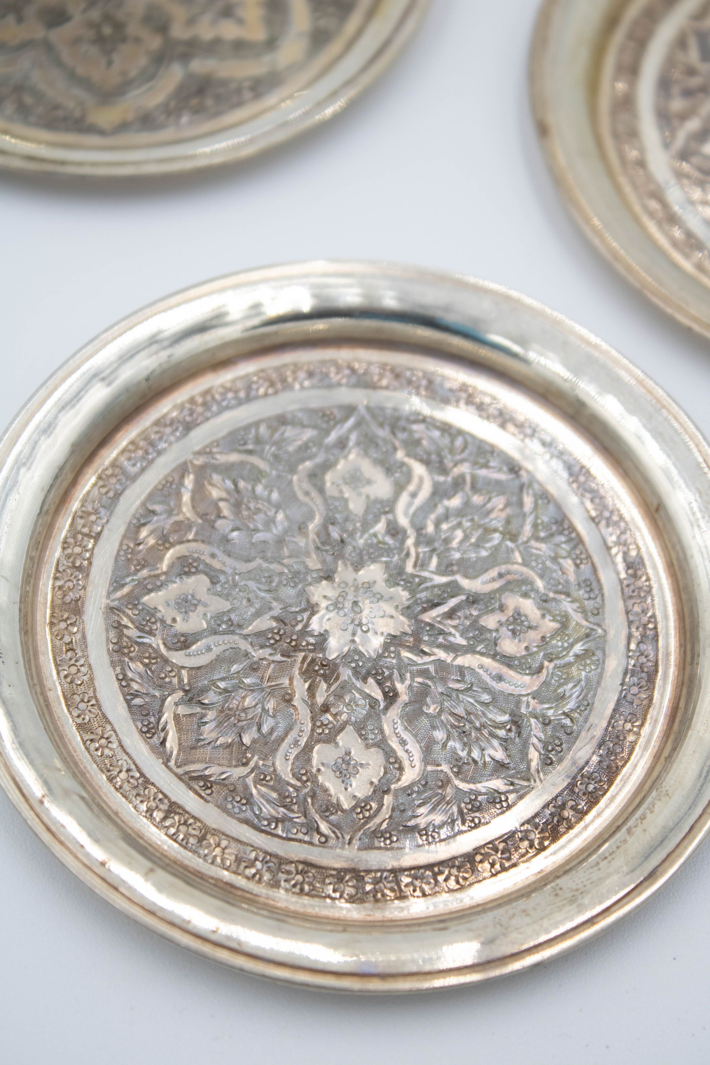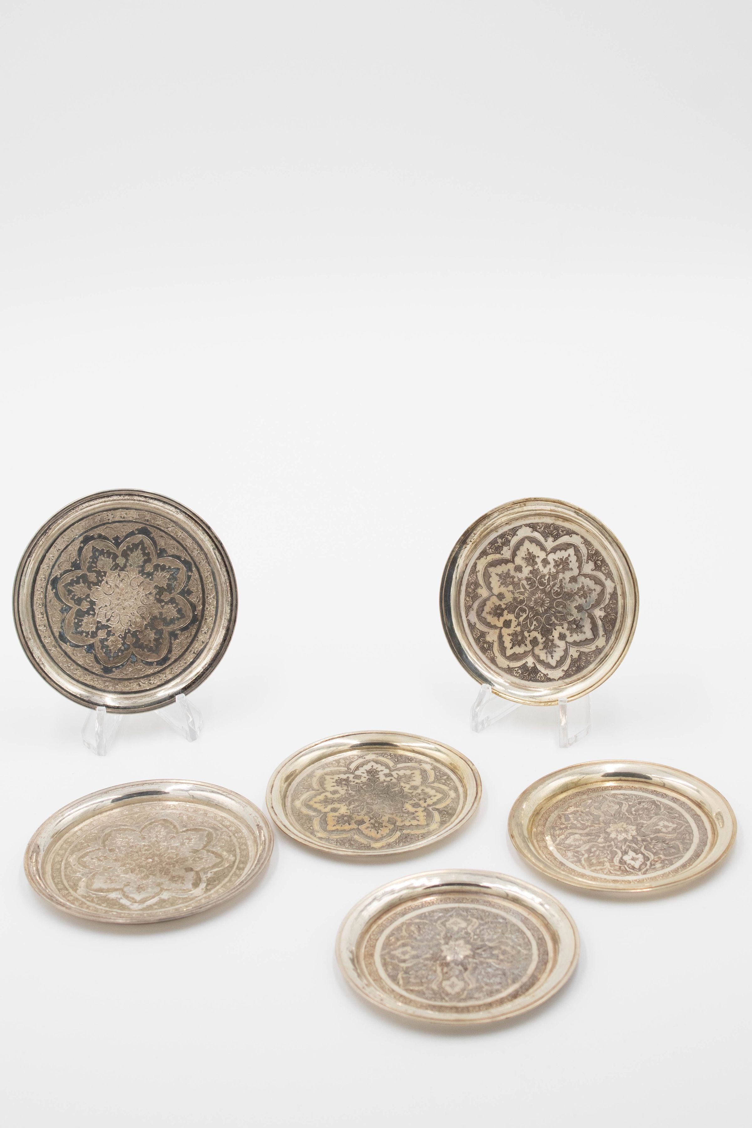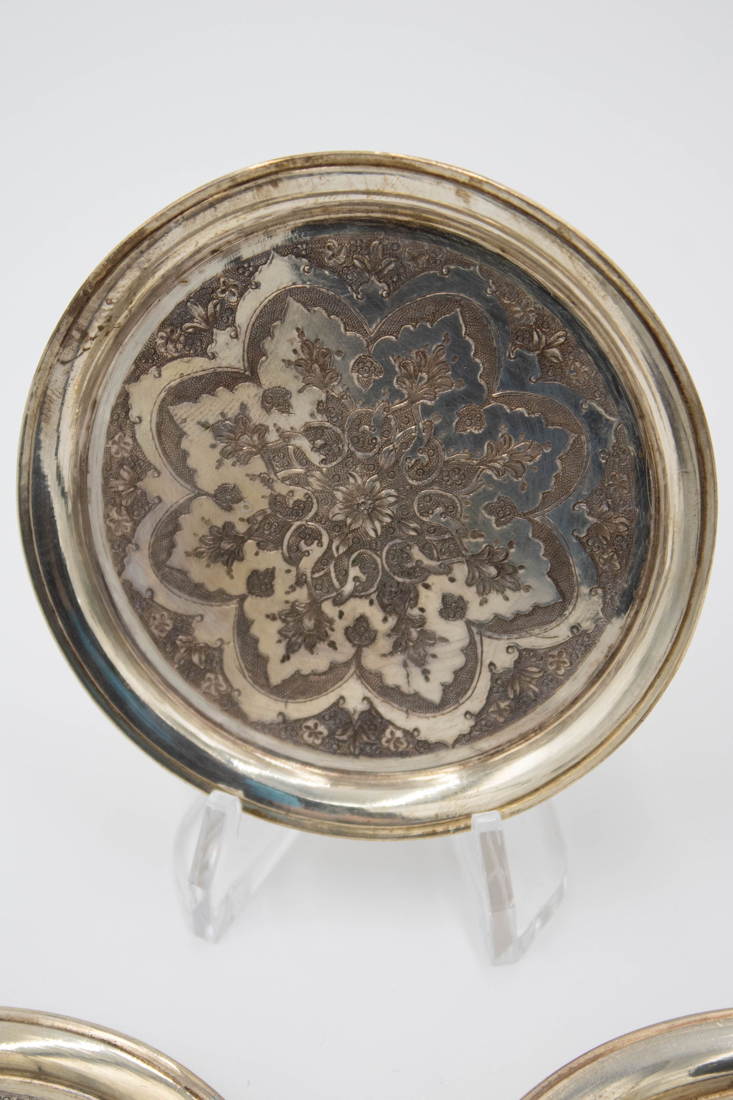 Set of 6 round Persian silver dishes engraved with floral mandala design. The dishes were made in Iran likely during the later 19th and early 20th century.Context