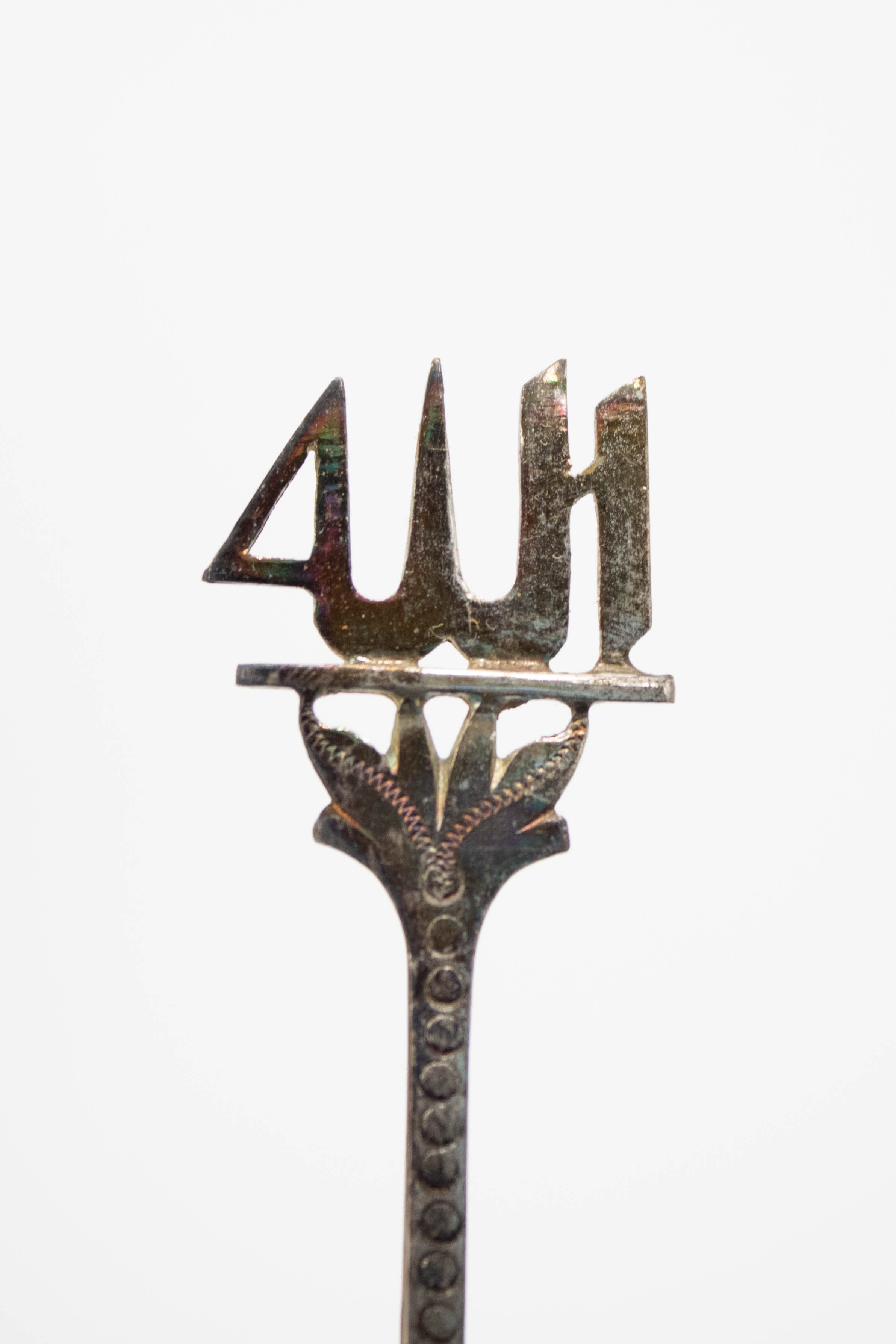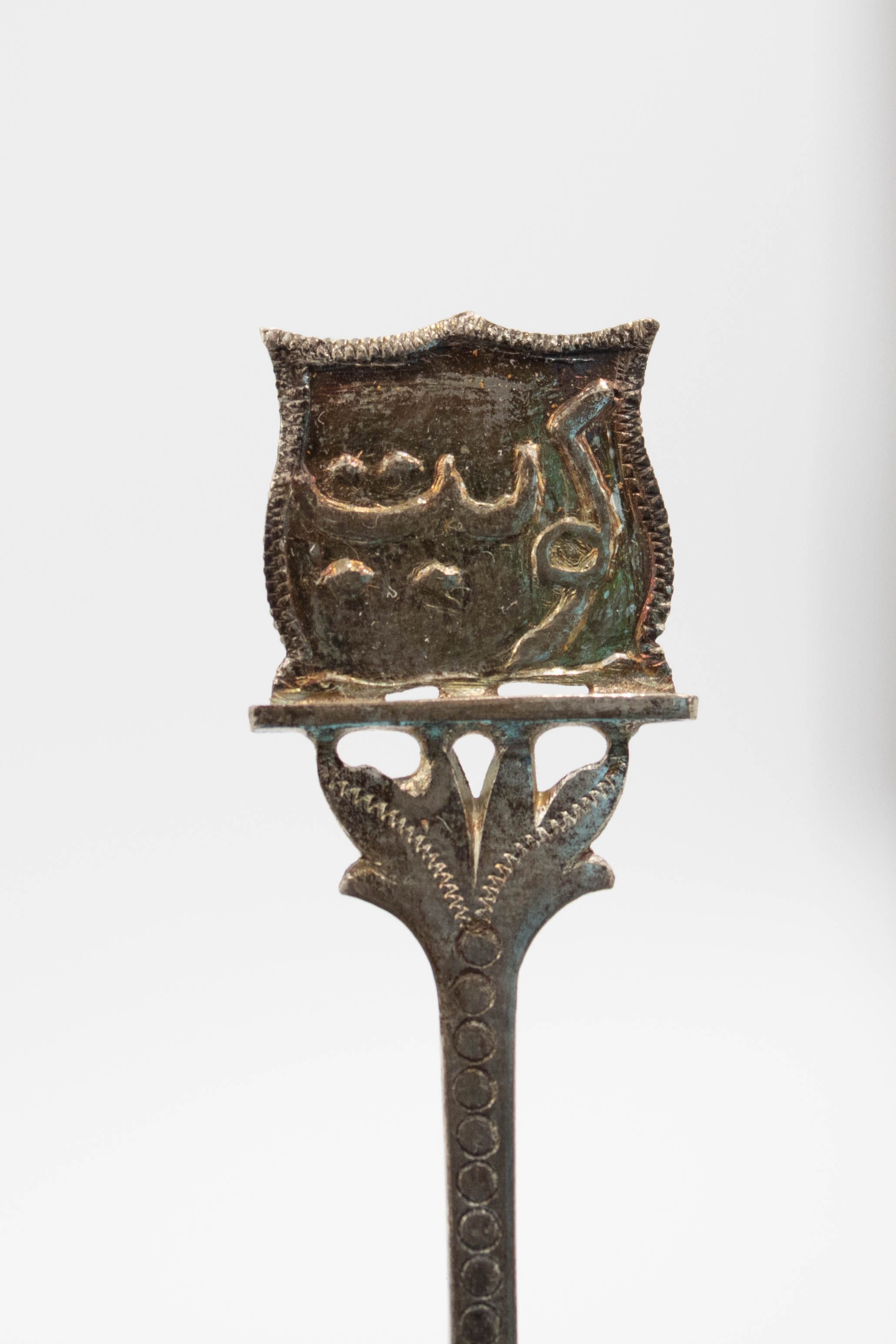 Set of six silver coffee spoons paired in sets of two with three designs. Two depict Arabian camels, two contain Arabic script, and the other two are abstract Kuwaiti dhows. A dhow is a small sailing ship with either one or two masts traditionally used in the Red Sea and Indian Ocean areas.Context