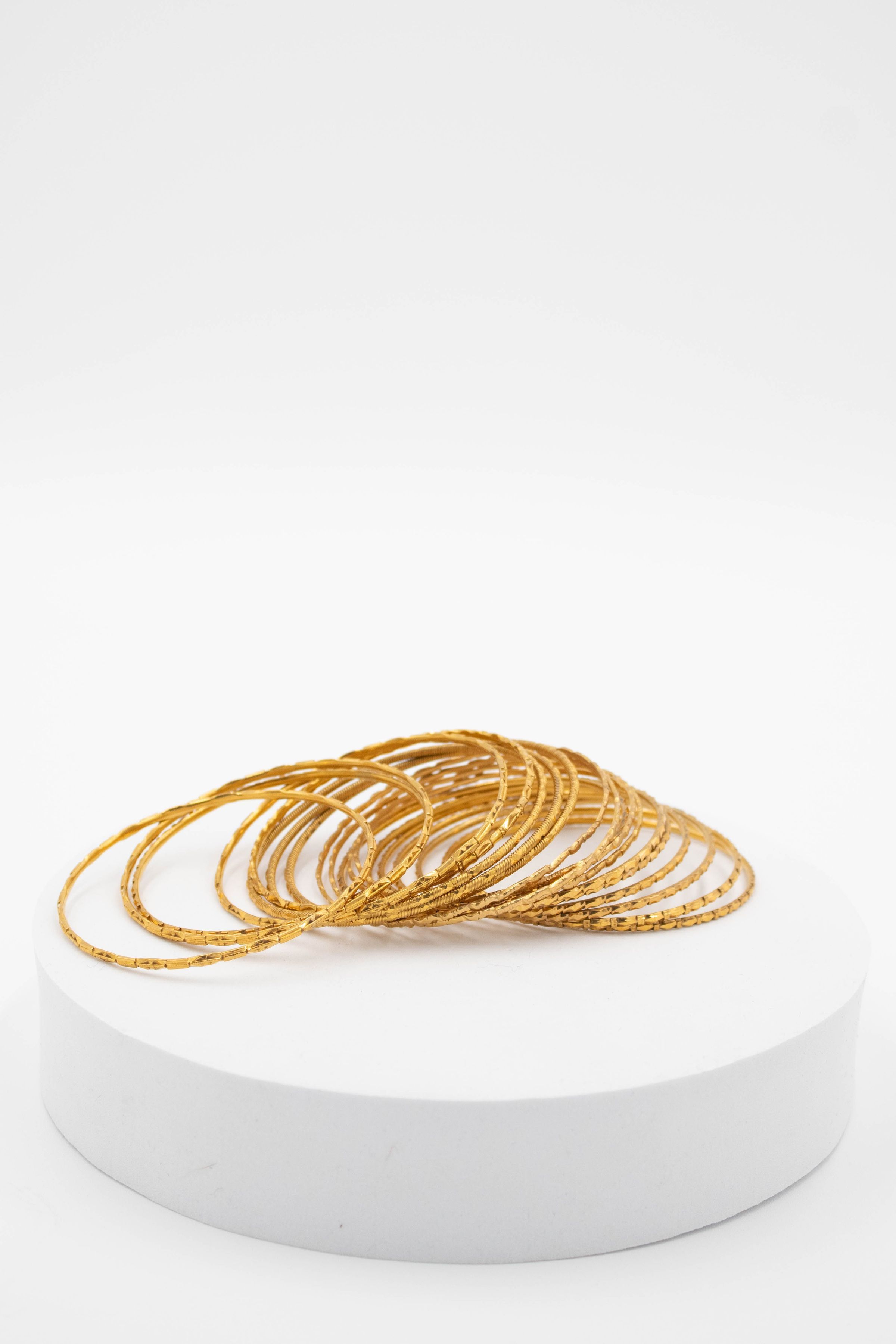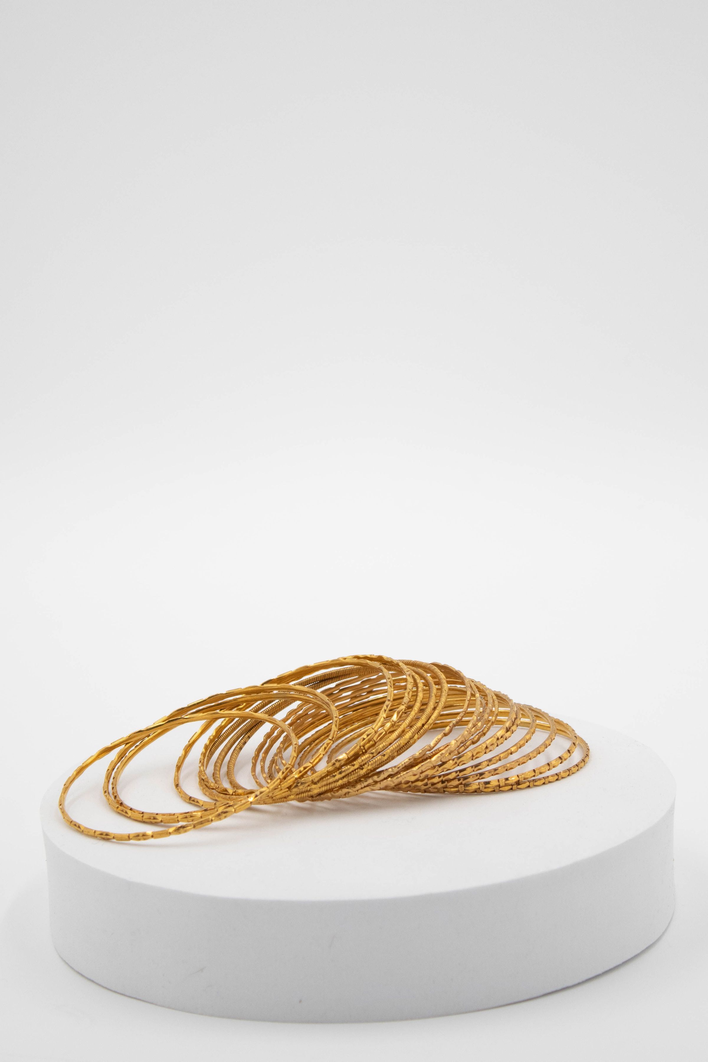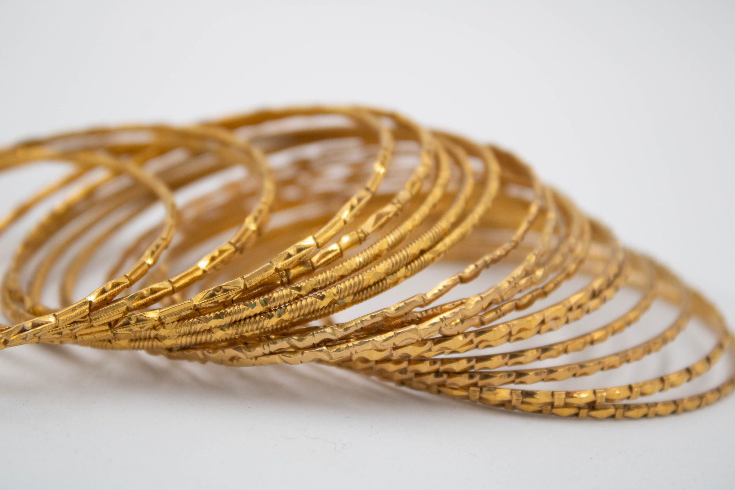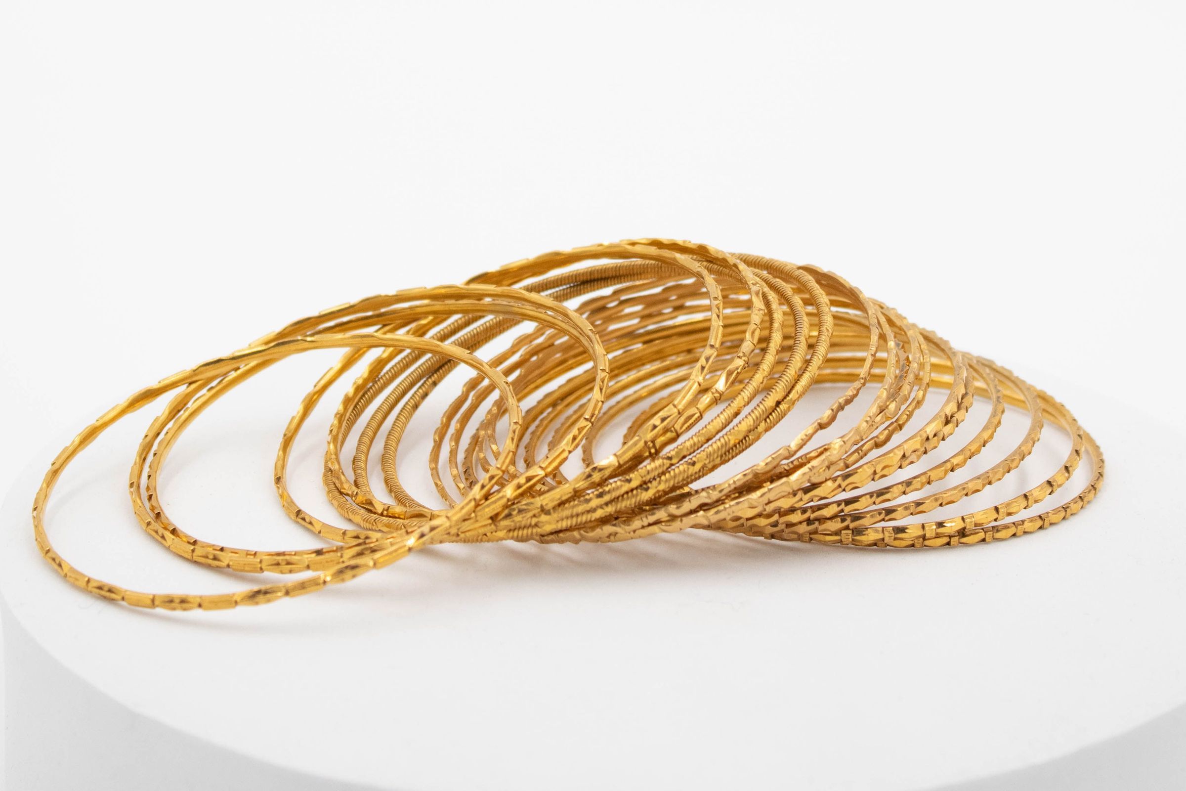 The set of 19 thin gold bangles are engraved with different geometric patterns. They were likely made in India.Context