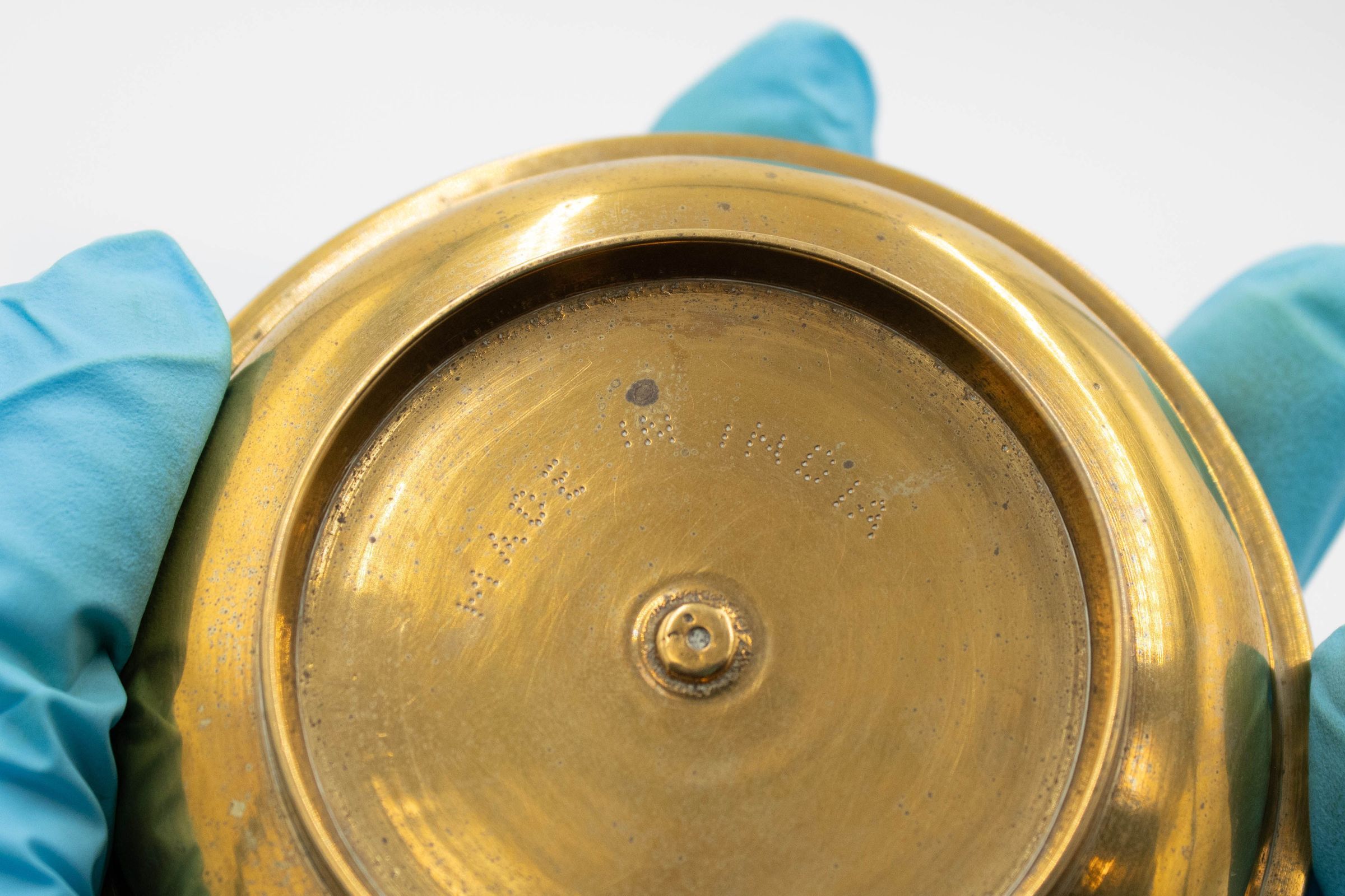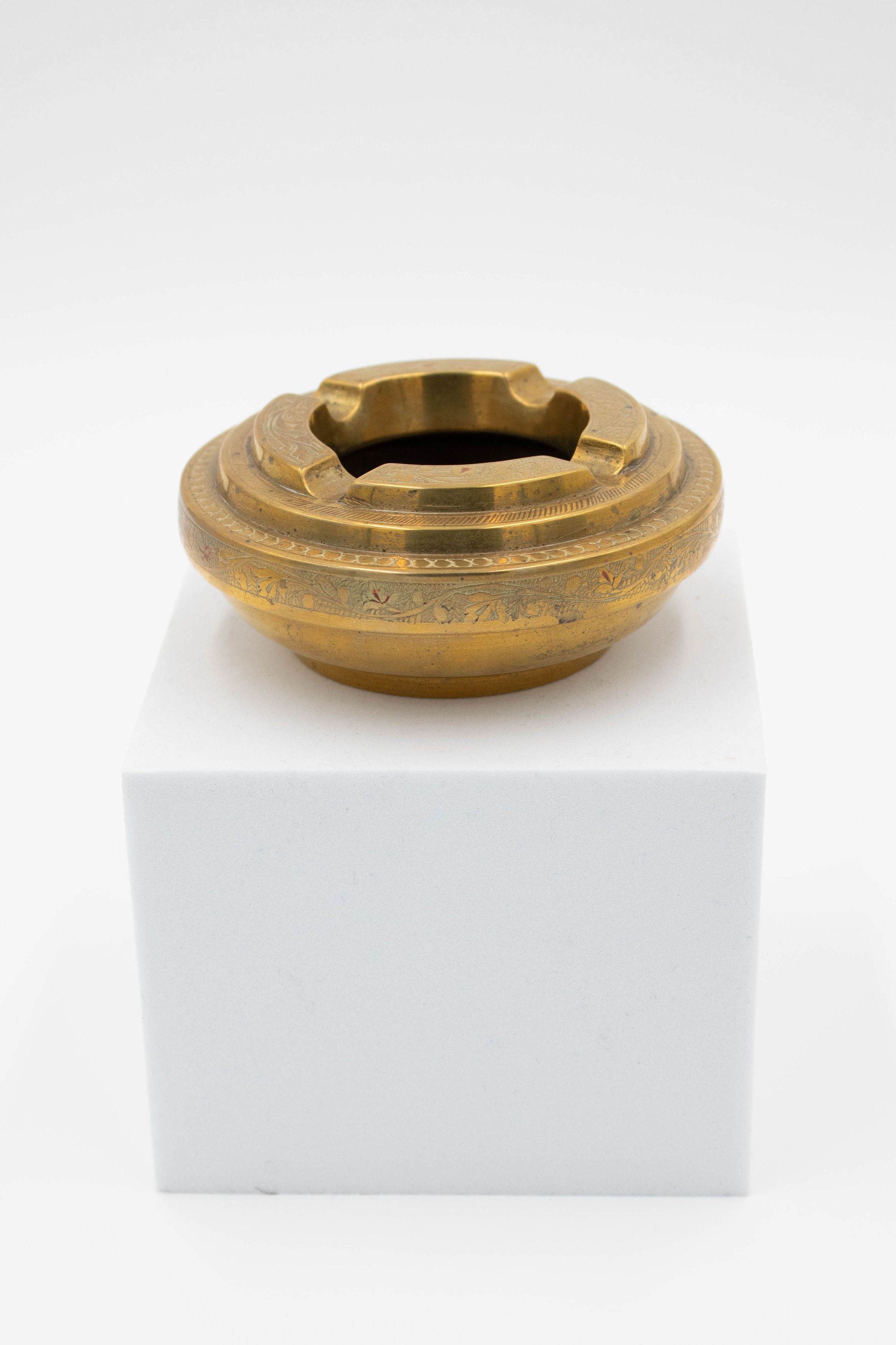 A small brass ashtray with engraved floral motifs. It is a two piece set with a screw off top.