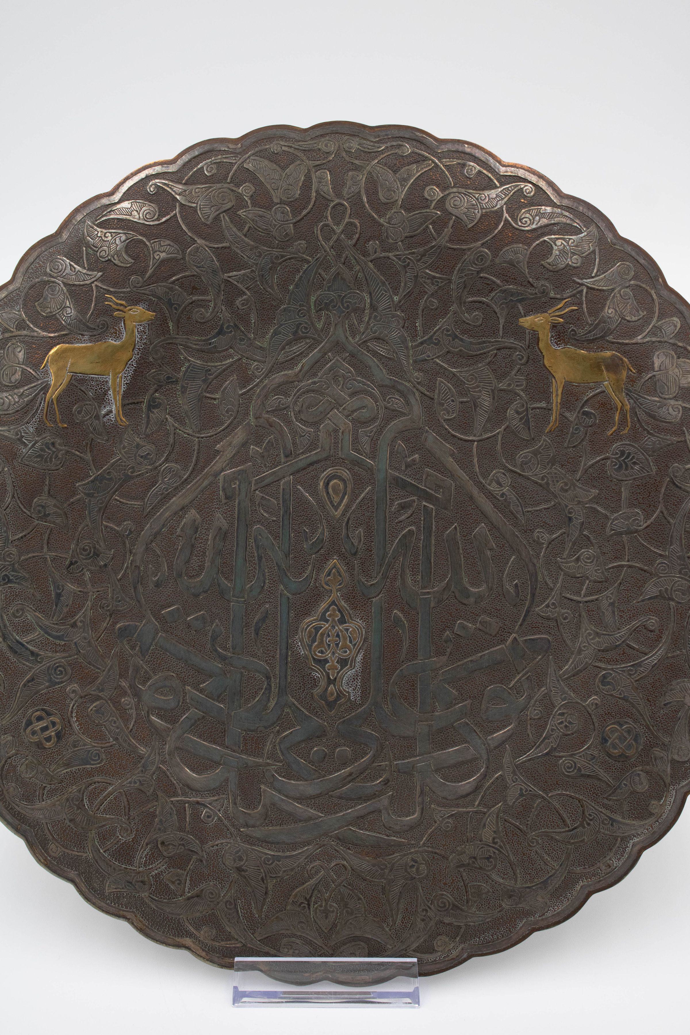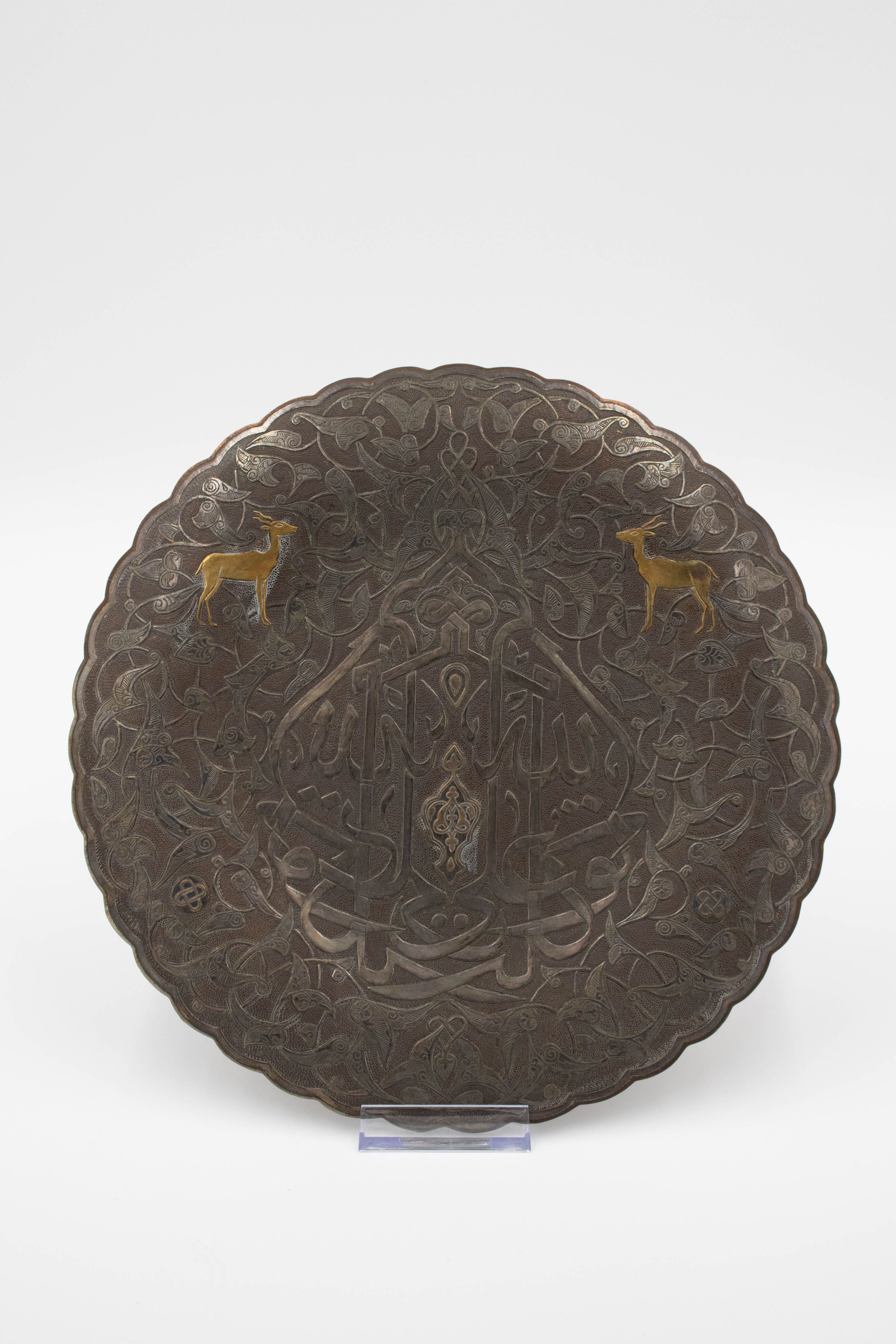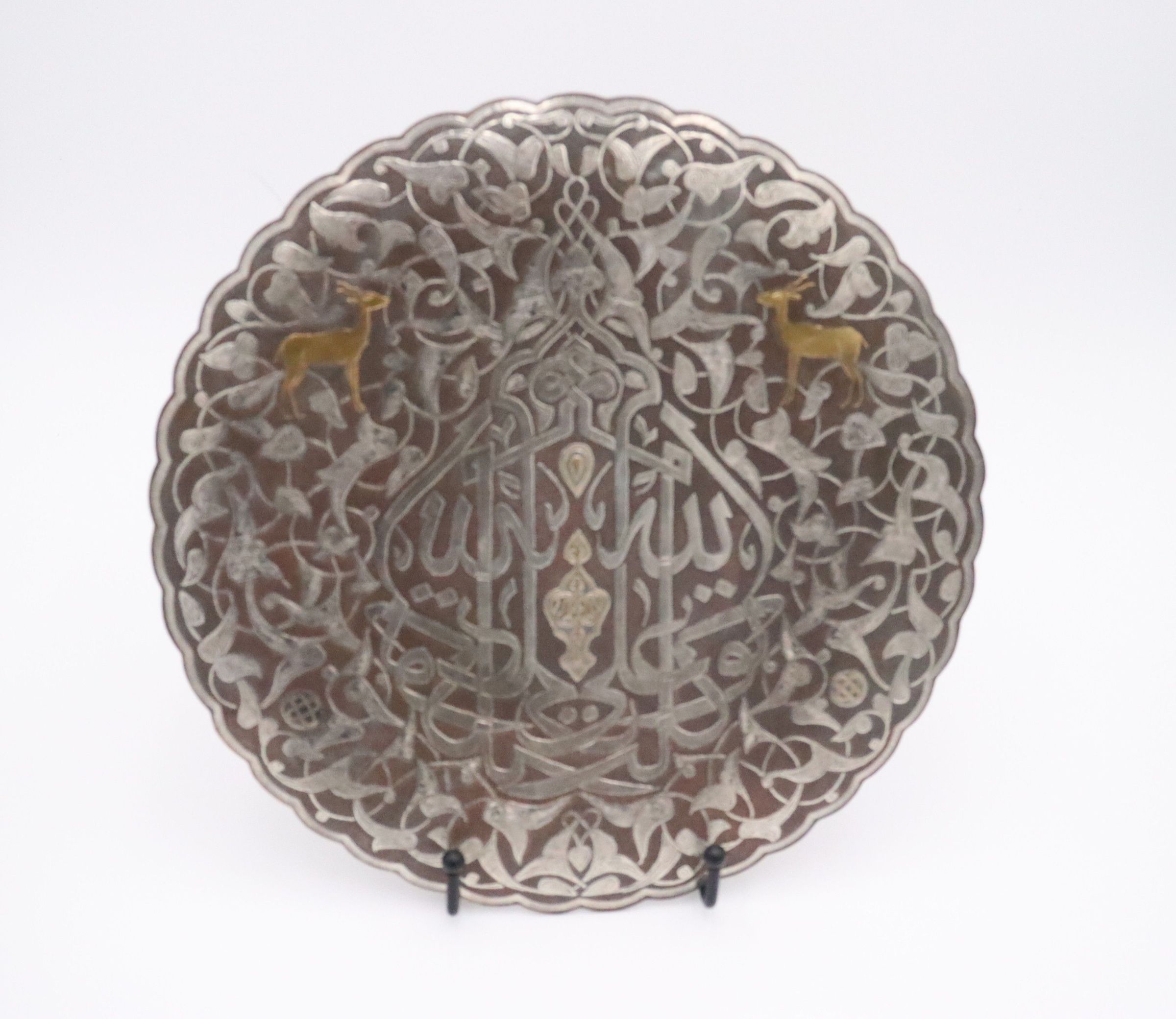 Image of propped up silver and brass plate. The center of the plate is inscribed with Arabic script reading "Bieznella." There are two small brass deer on the top right and left of the Arabic lettering.