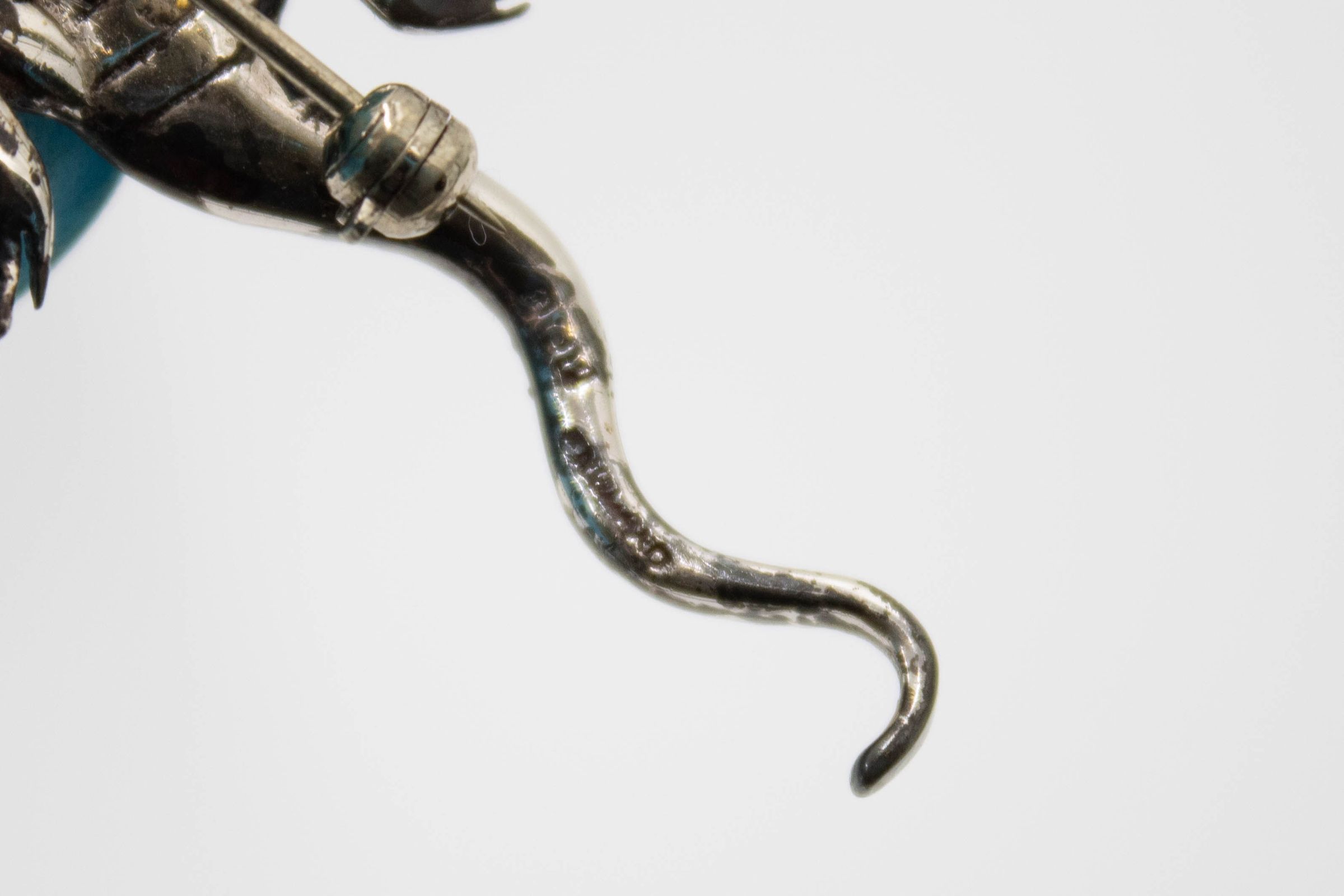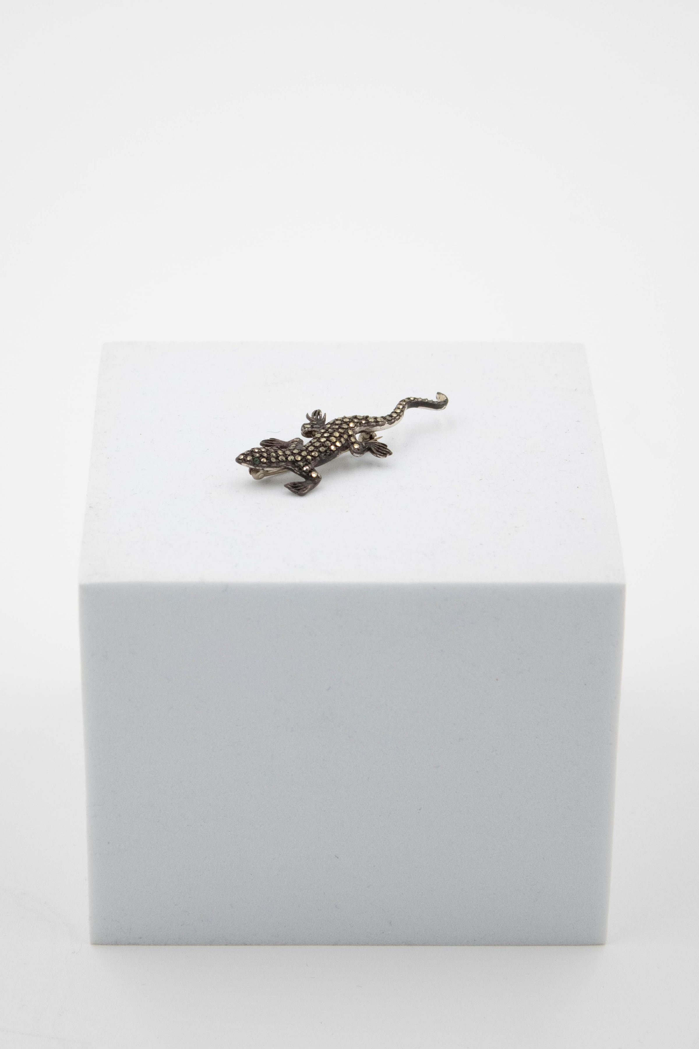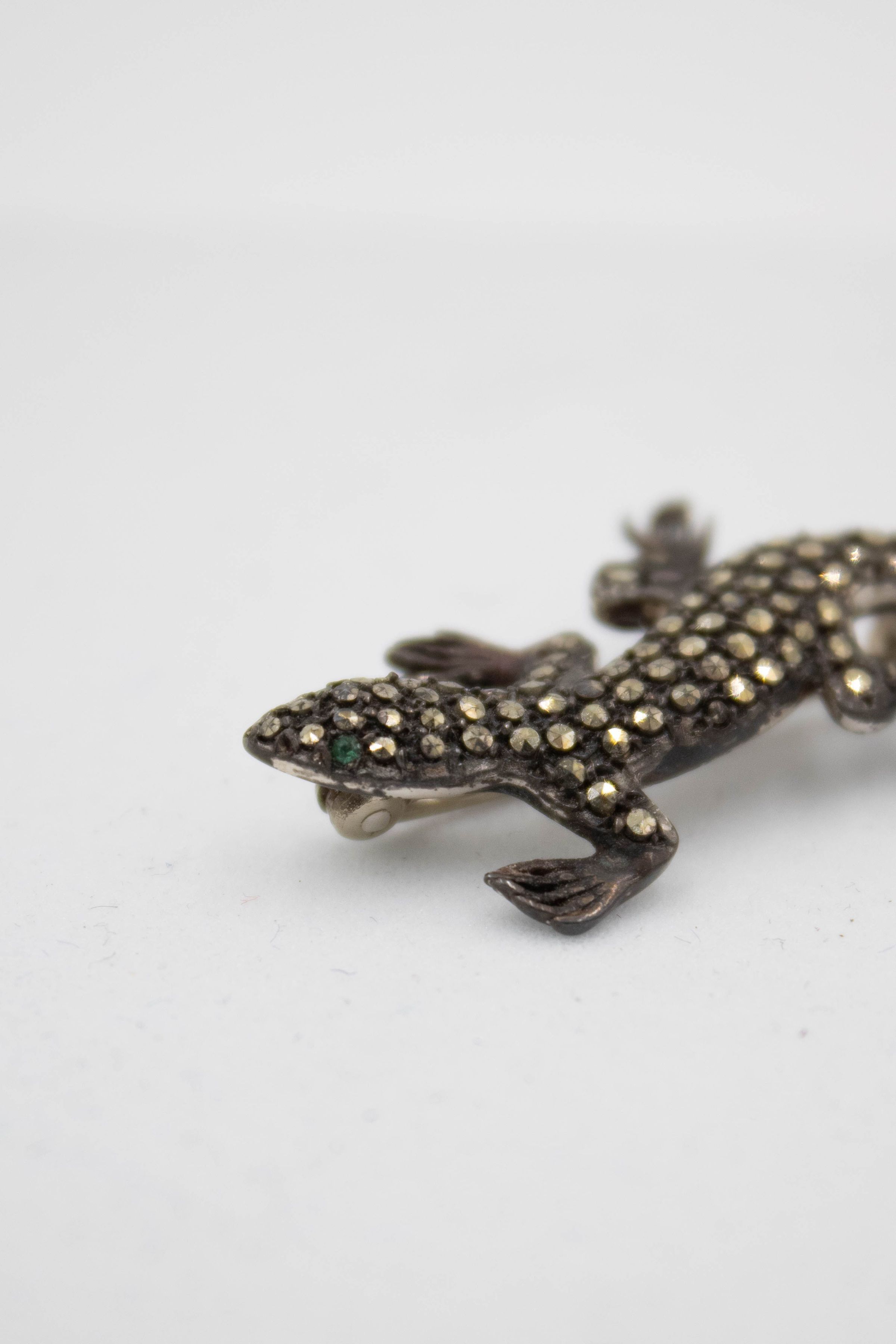 The small lizard-shaped brooch is made of silver embedded with diamonds and two emerald eyes.Context