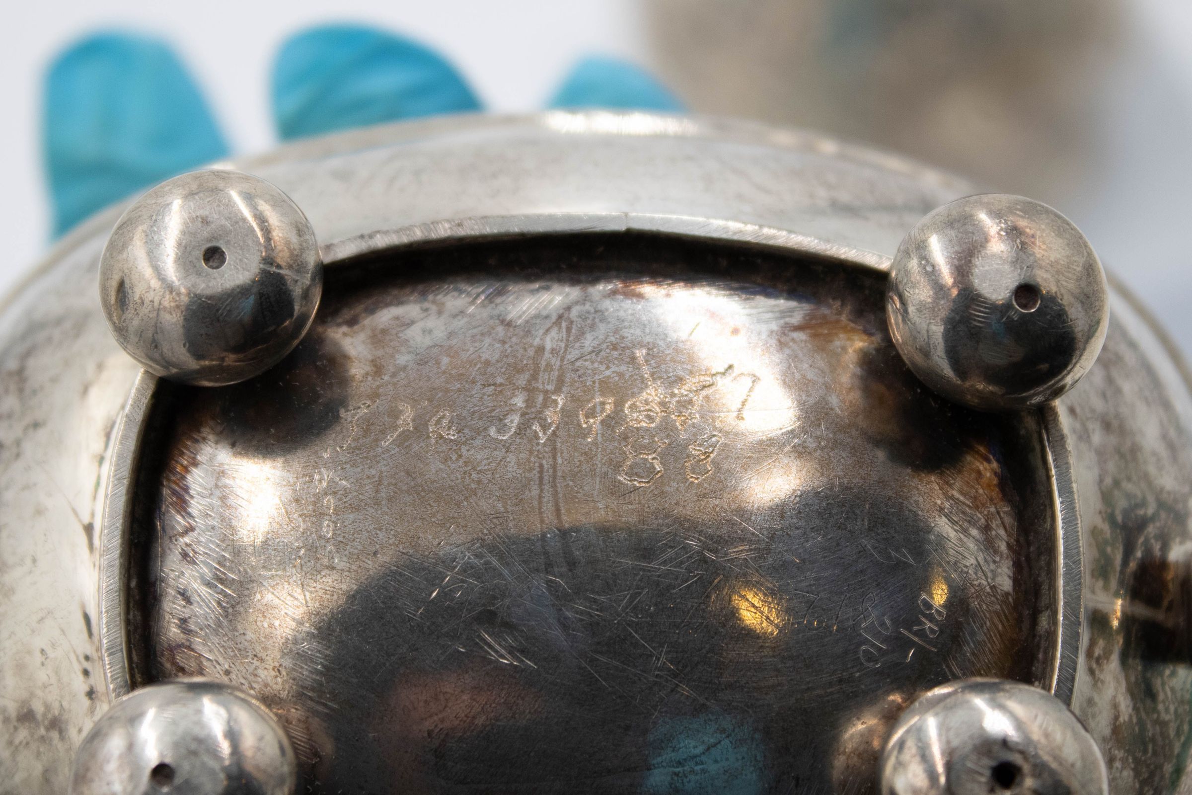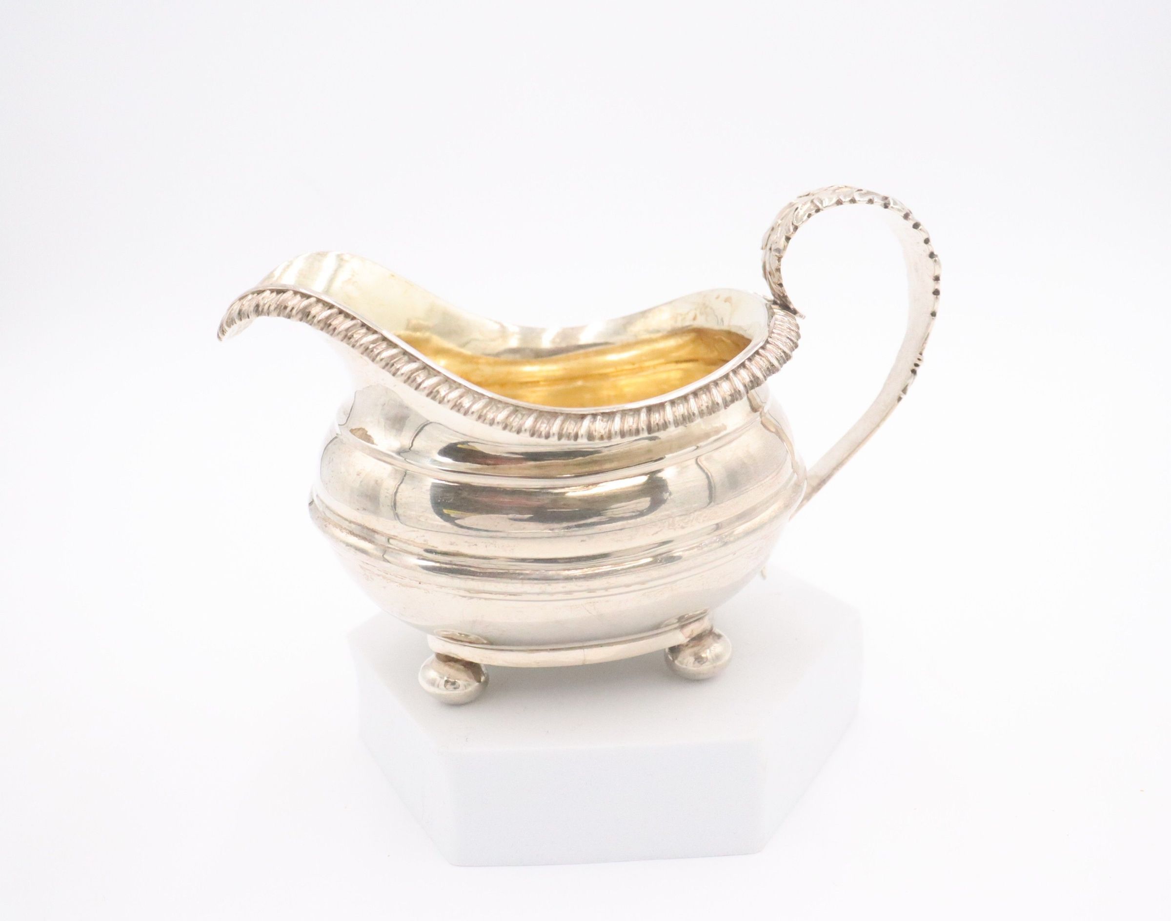 The image showcases a silver, gravy-boat shaped creamer with an elegant roped edge, resting on round feet.
