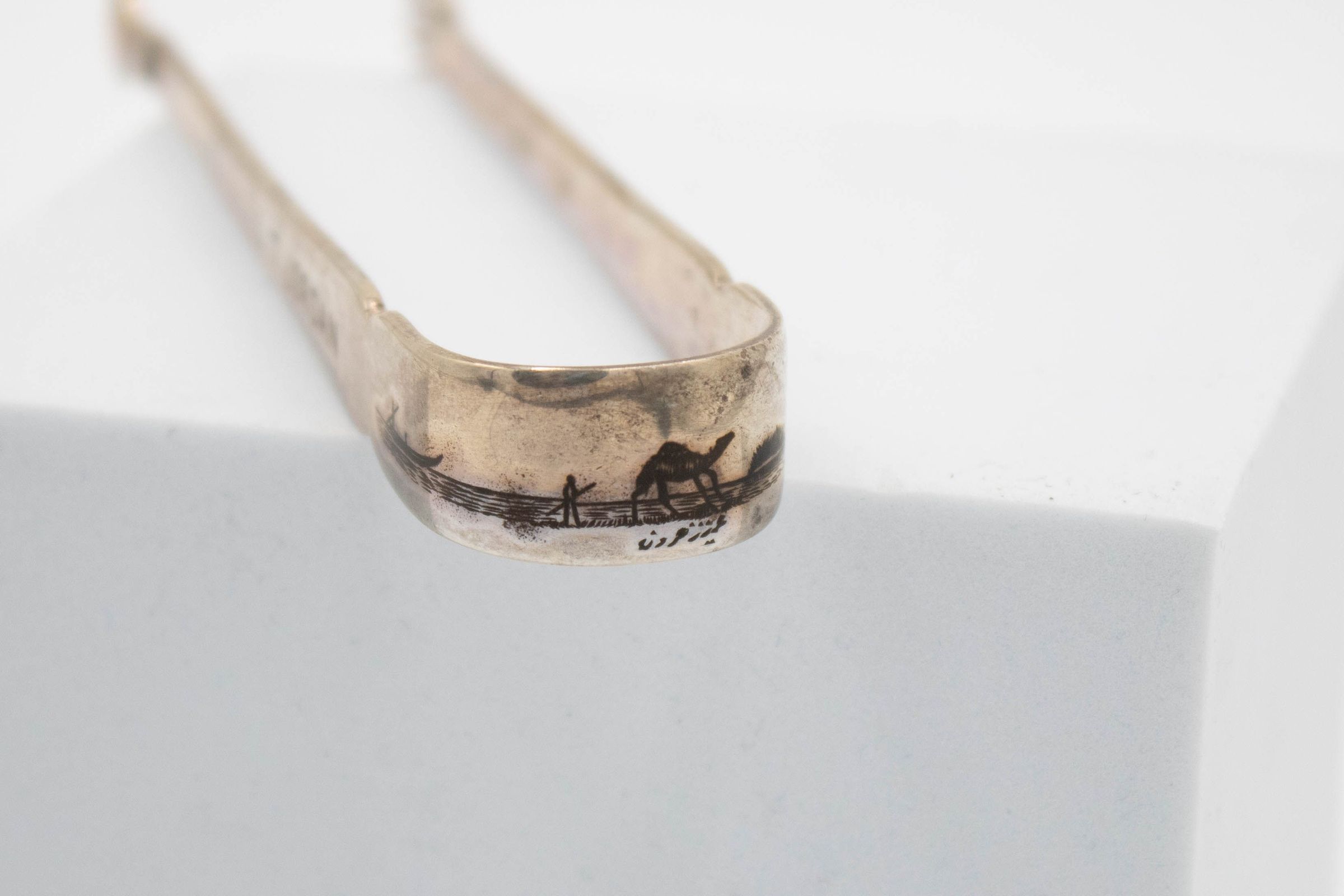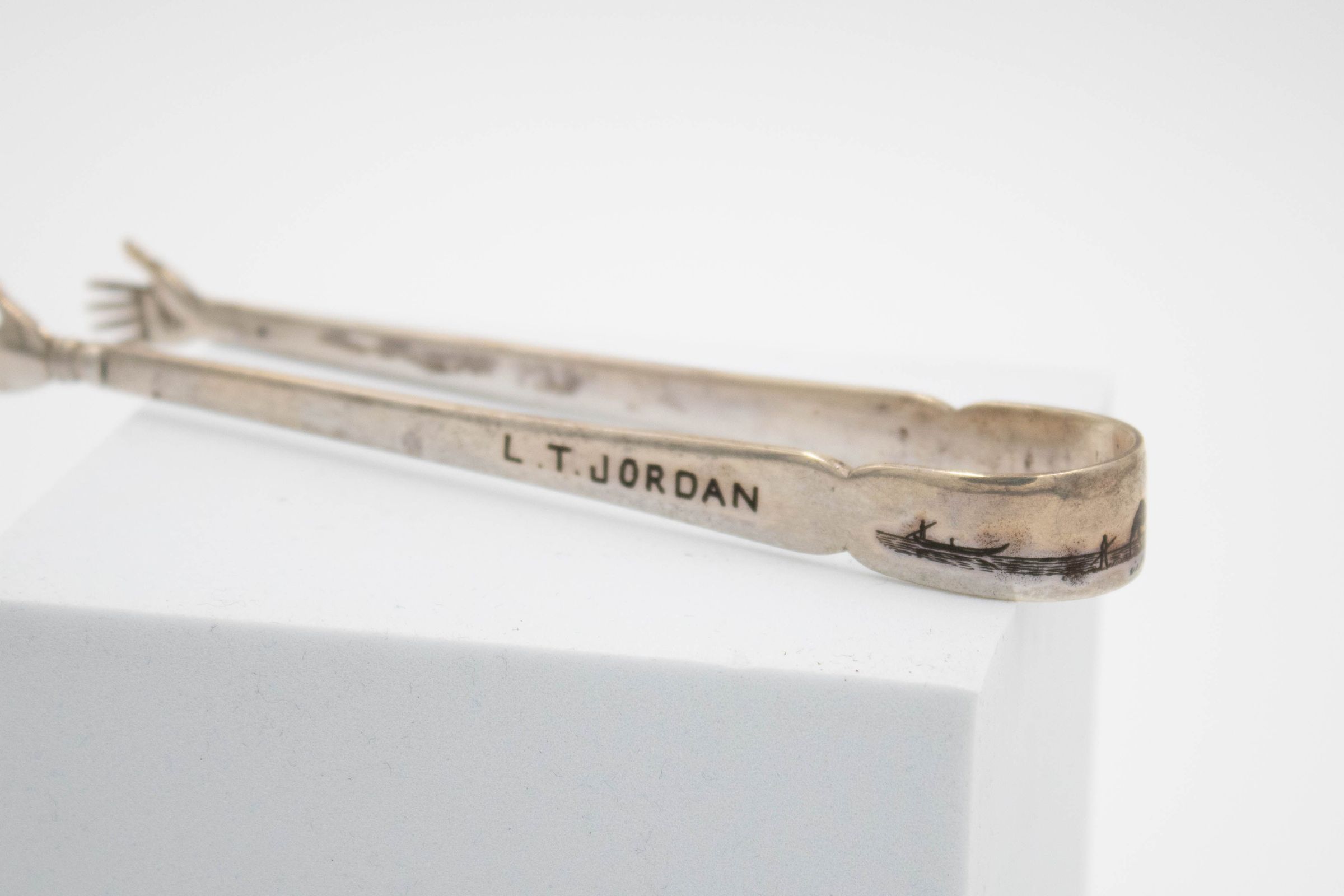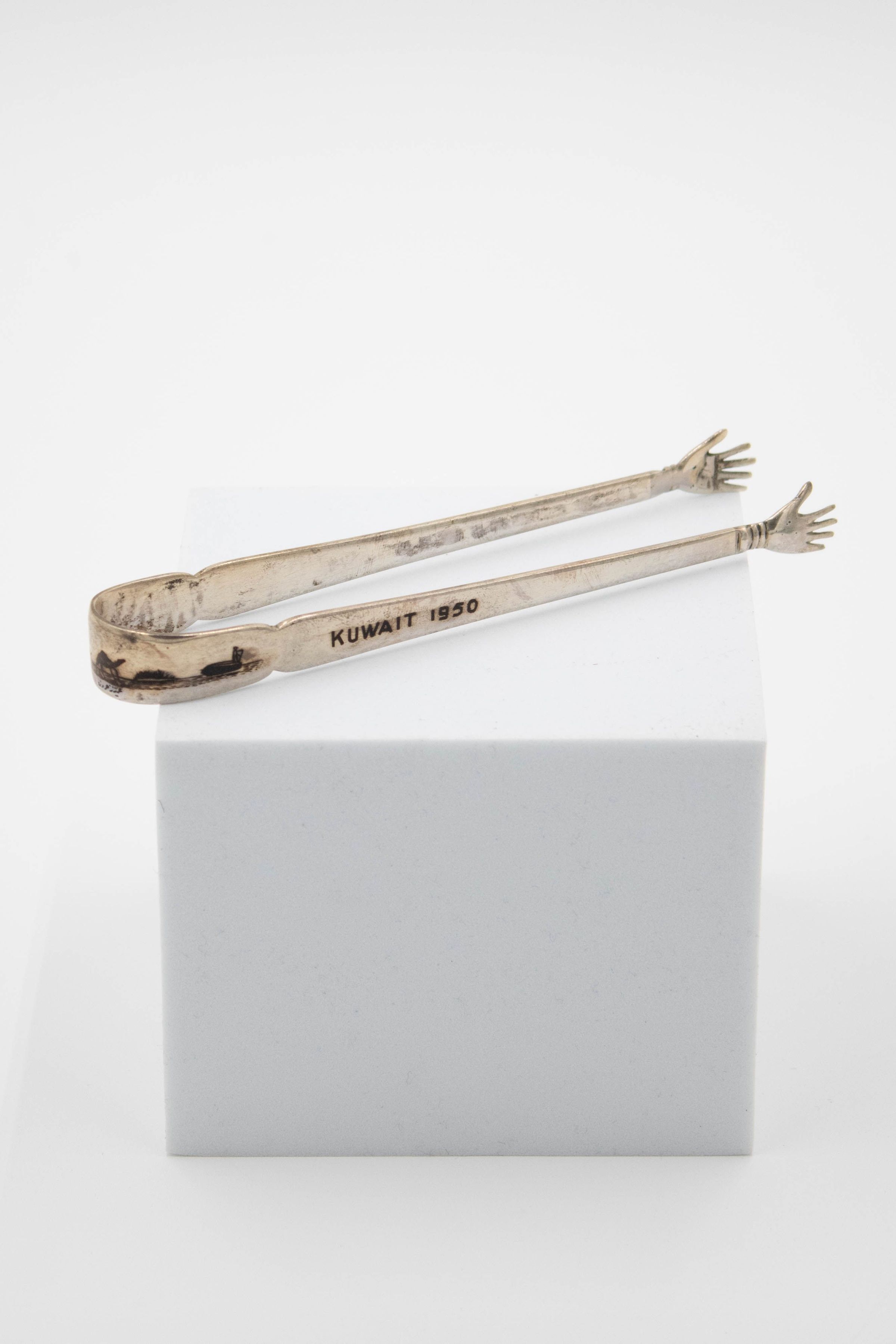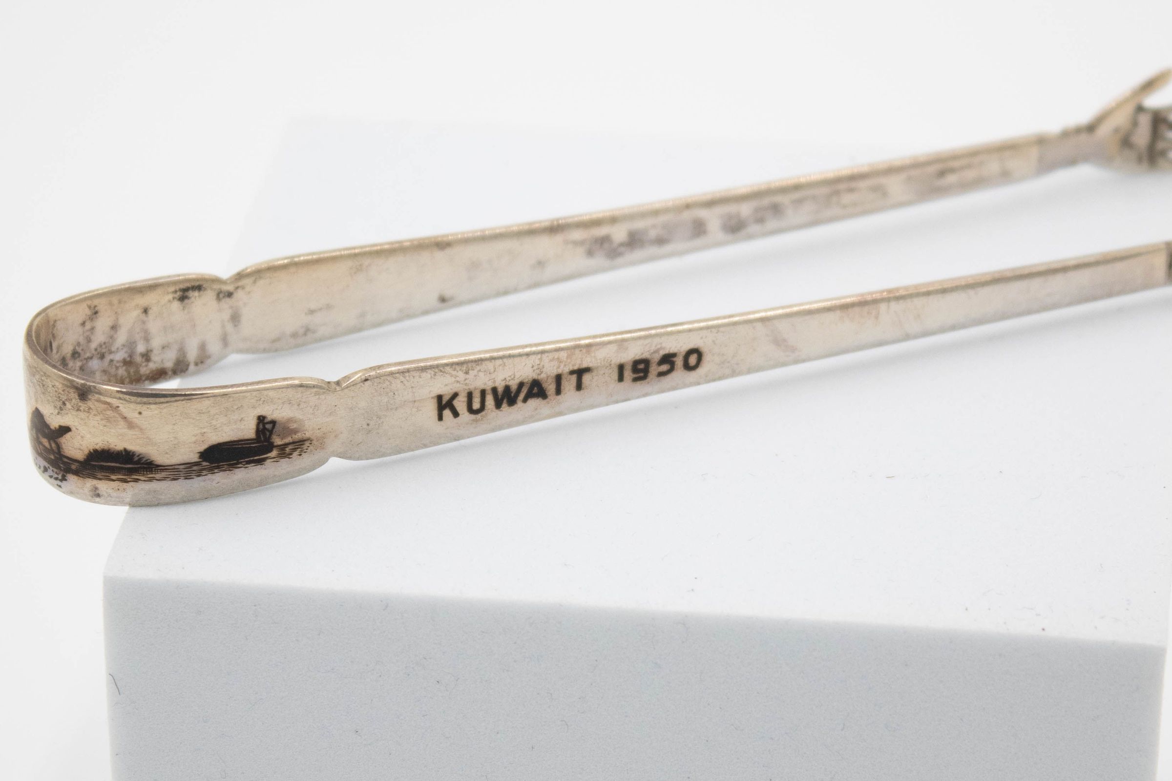 A thin pair of tongs with small hands at the ends. It has a camel and oasis scene around the center, "Kuwait 1950," and "L.T. Jordan" engraved.