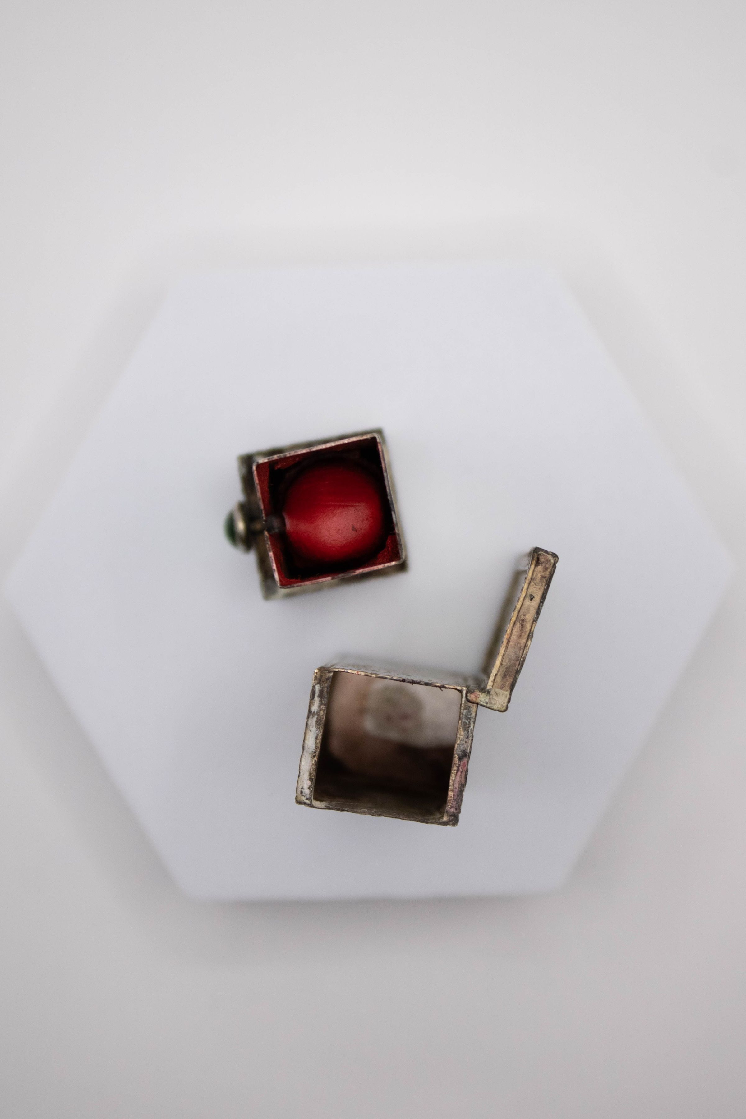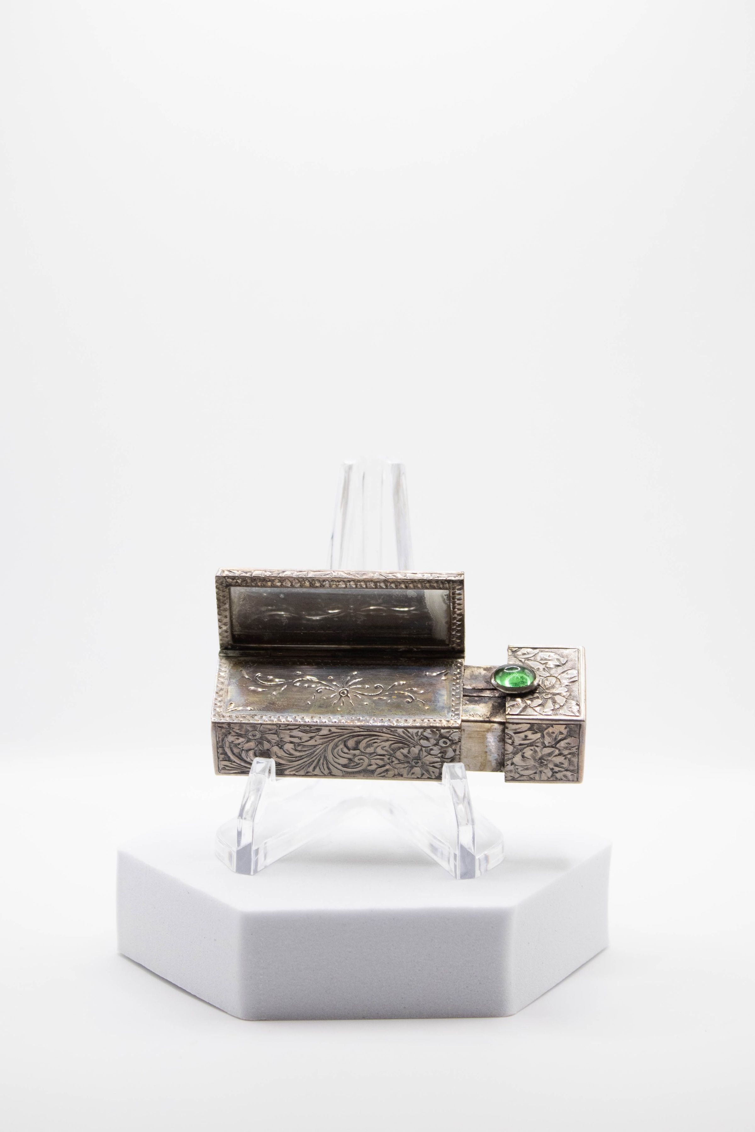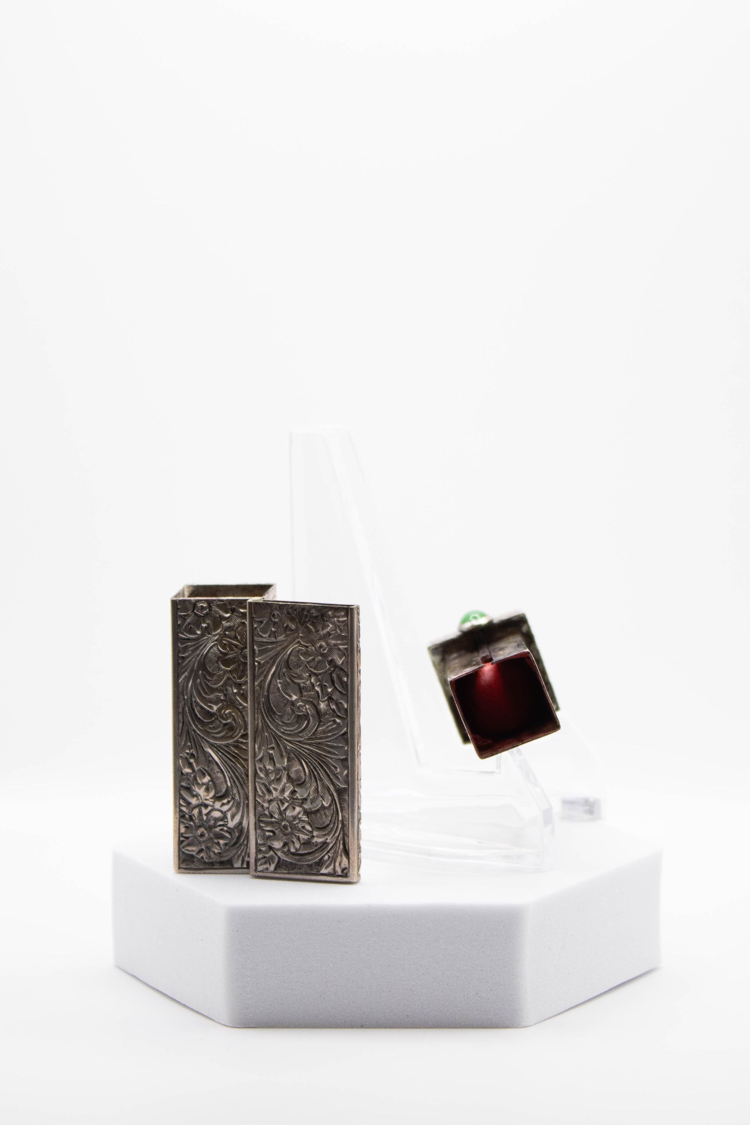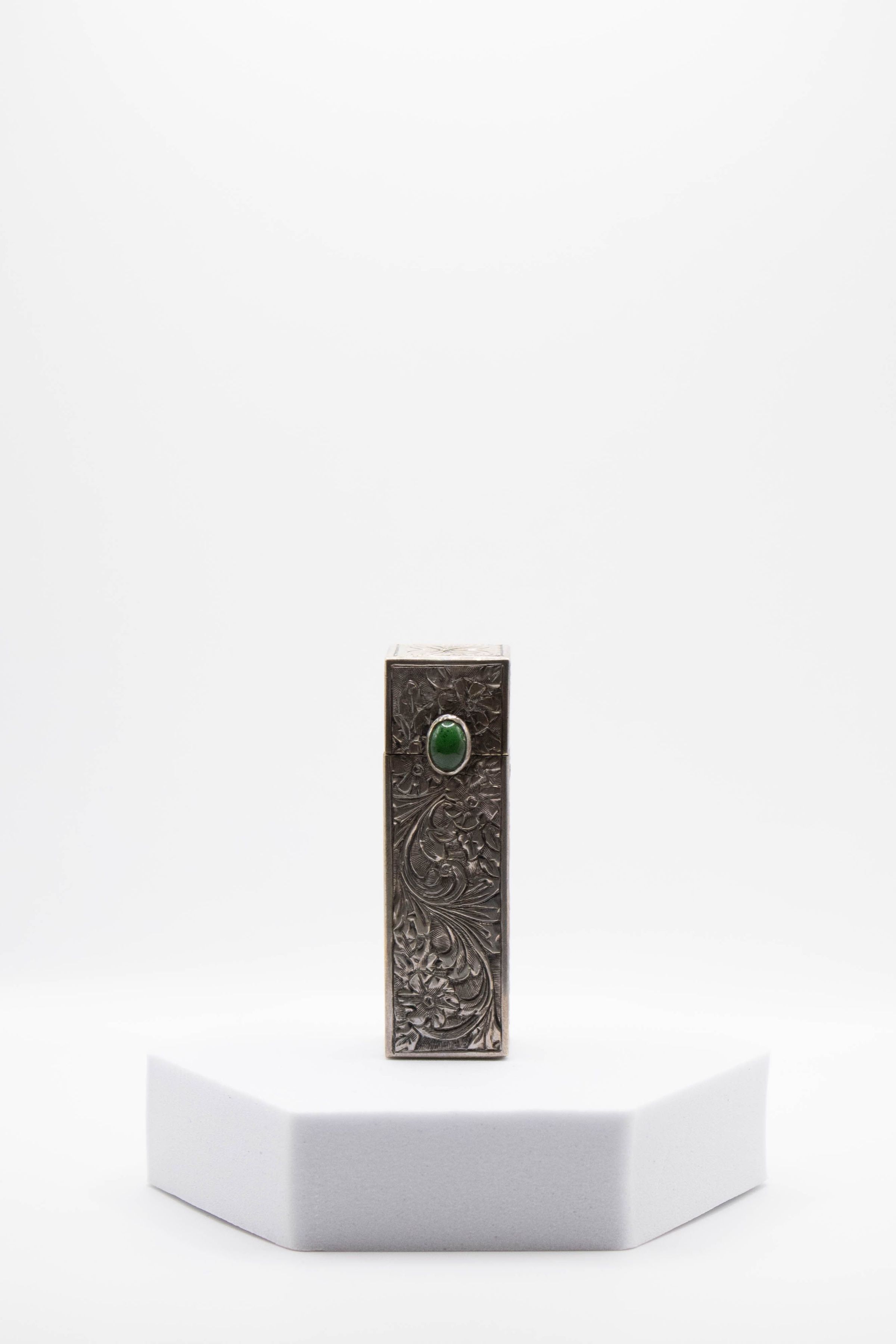 Small silver rectangular lipstick box decorated with a green stone and floral/vine designs. There is a mirror on the inside. The lipstick is likely Italian and made during the 1920-1940s. It is hand-etched and has an authentic jade stone.Context