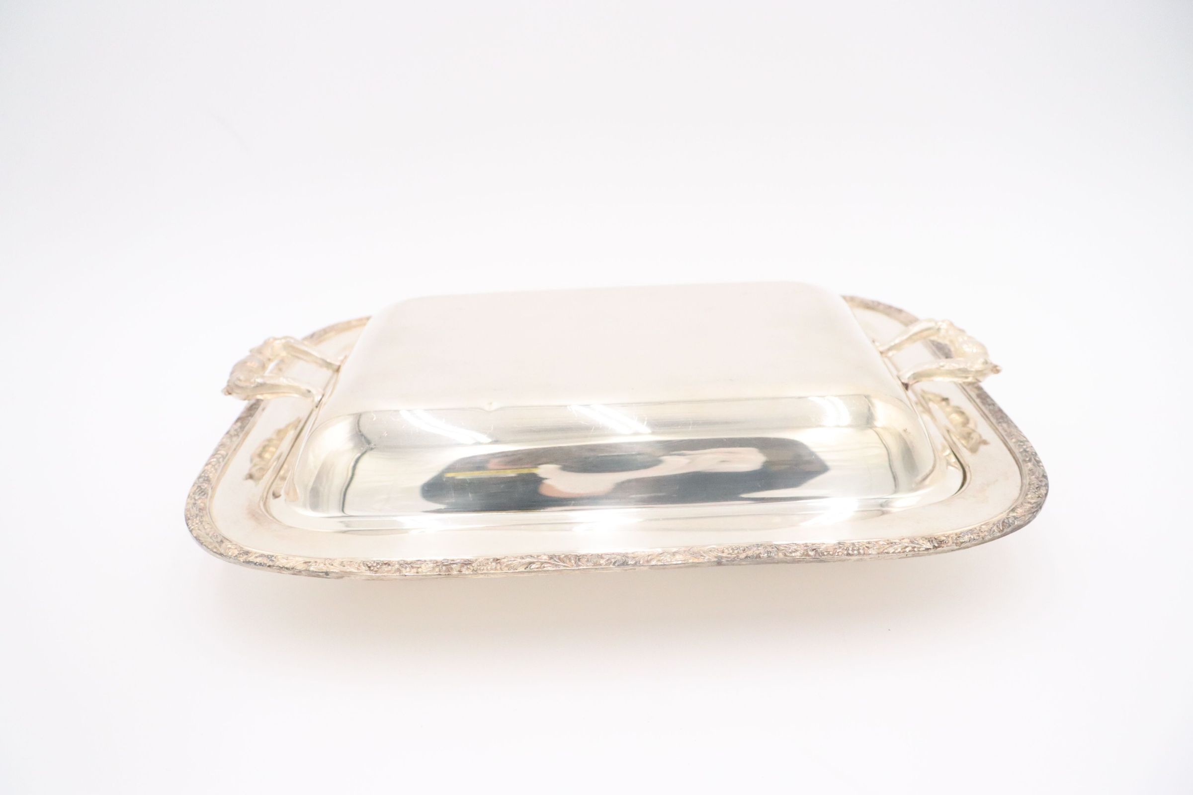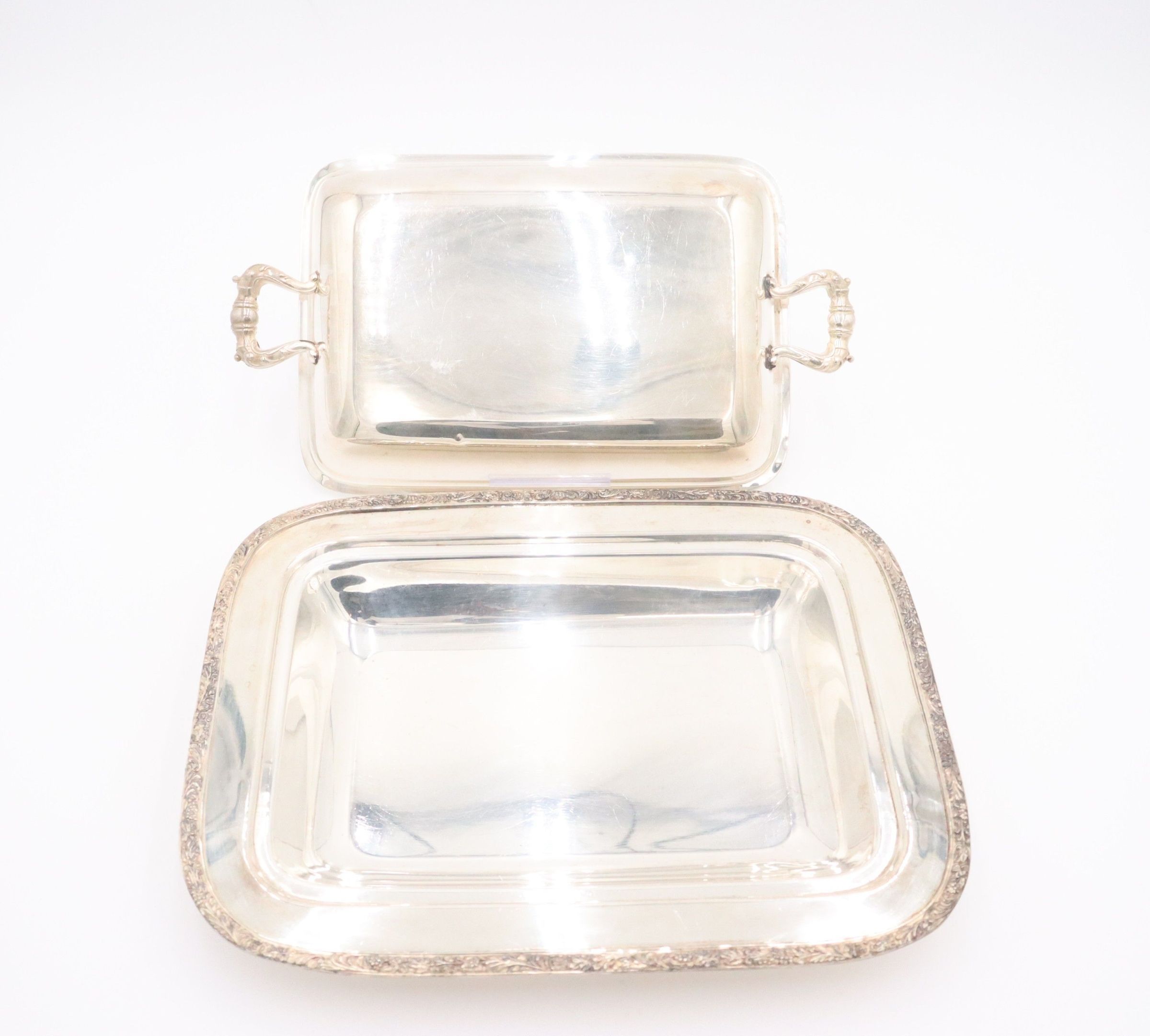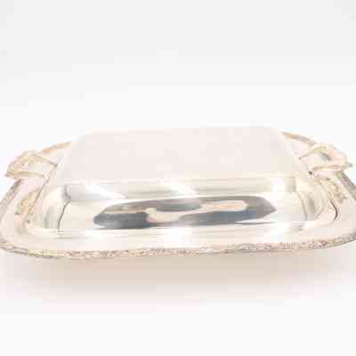 Rectangular silver vegetable server with cover.Context