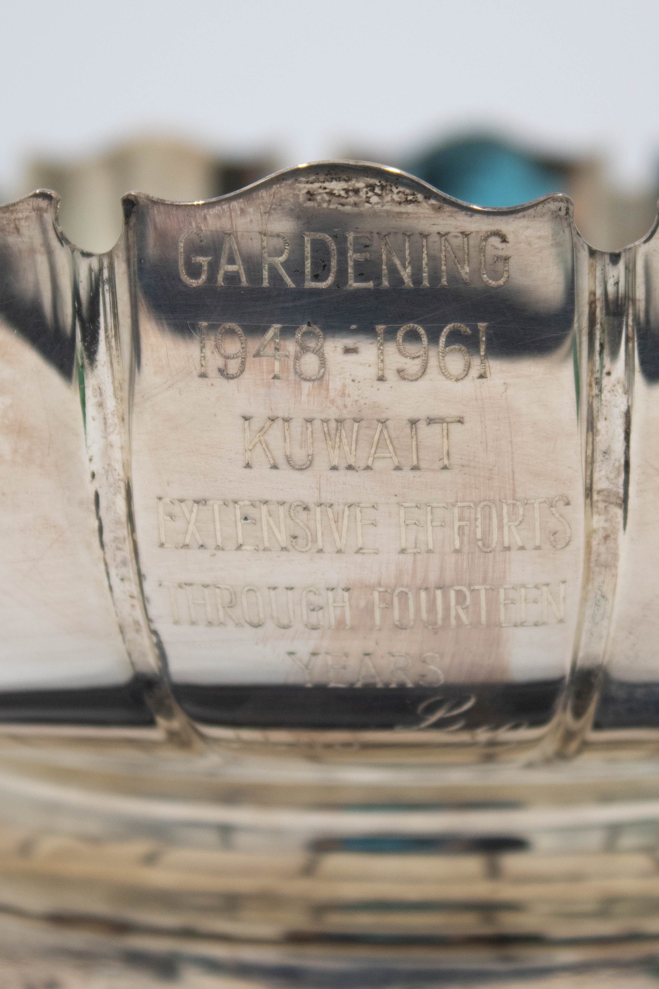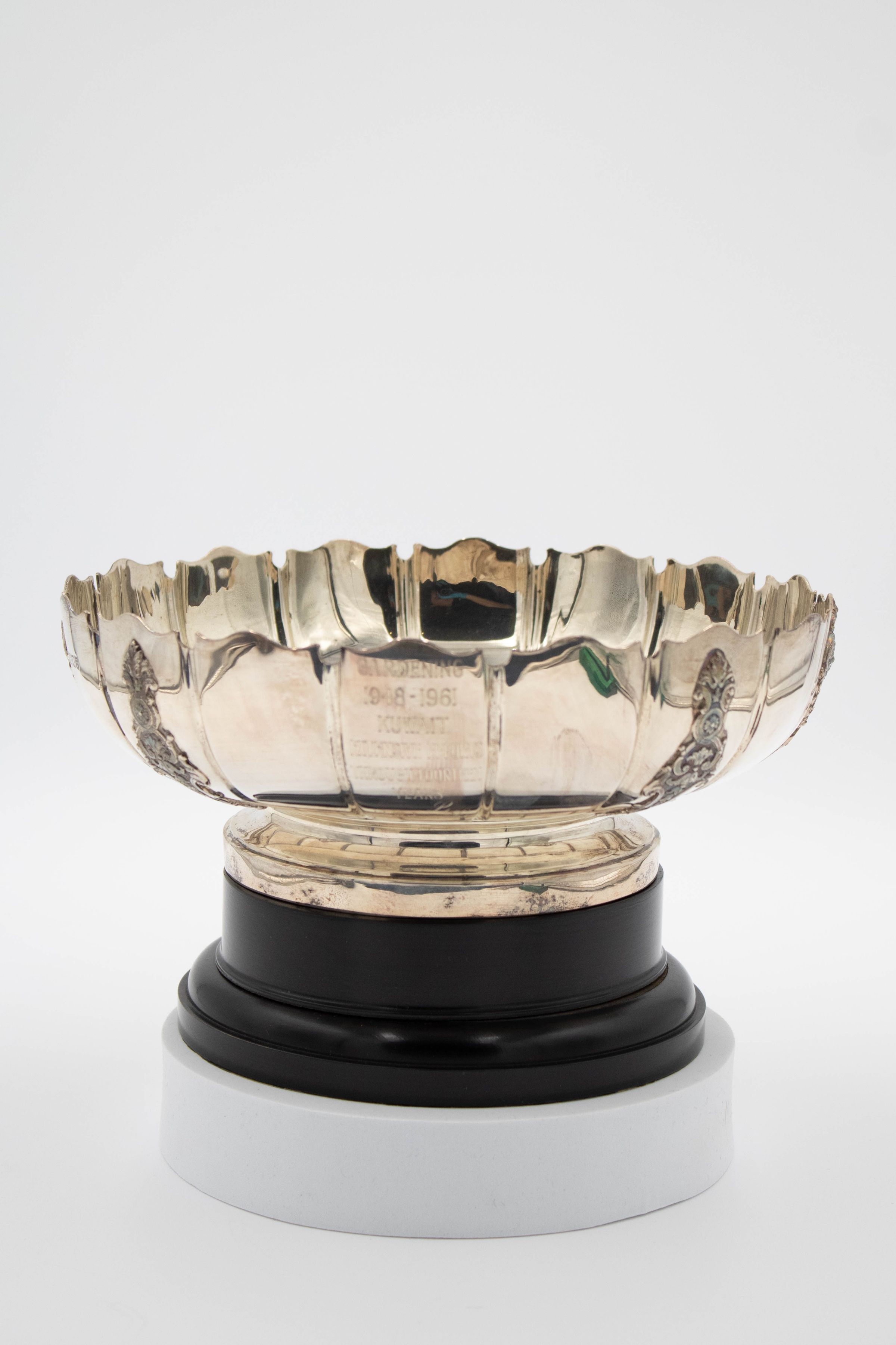 Silver trophy cup bowl. The silver cup was made by Garrard & Co, Ltd. in London and is engraved with the "GARDENING 1948-1961 KUWAIT EXTENSIVE EFFORTS THROUGHOUT FOURTEEN YEARS,” indicating Mrs. Jordan’s commitment to the organization. Garrard & Co, Ltd. has been manufacturing luxury jewelry and silver since 1735 in London, England, and was the first official crown jeweler for the British royal family.Context