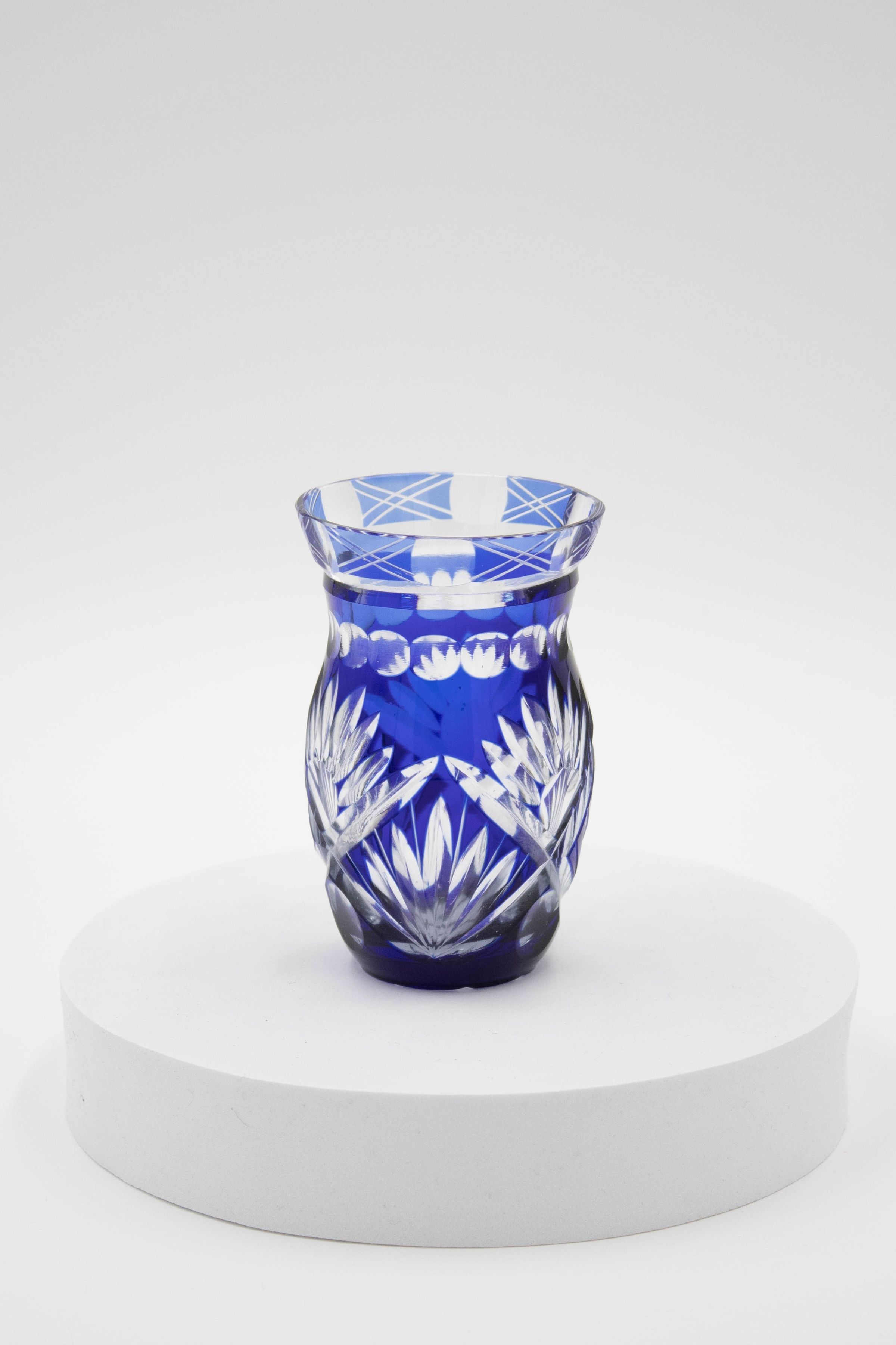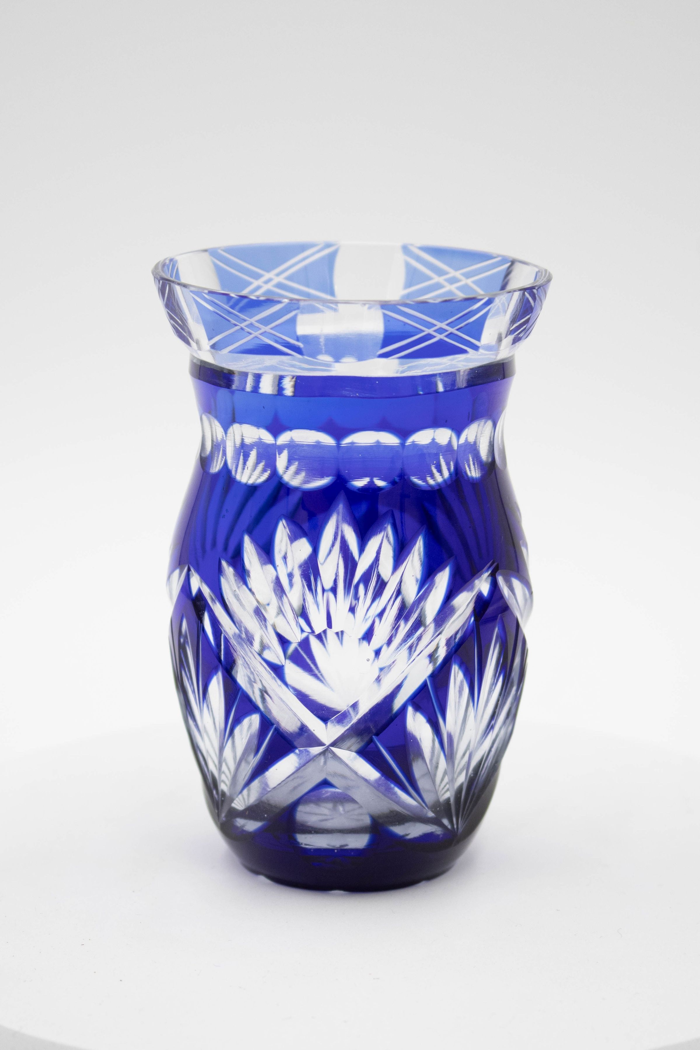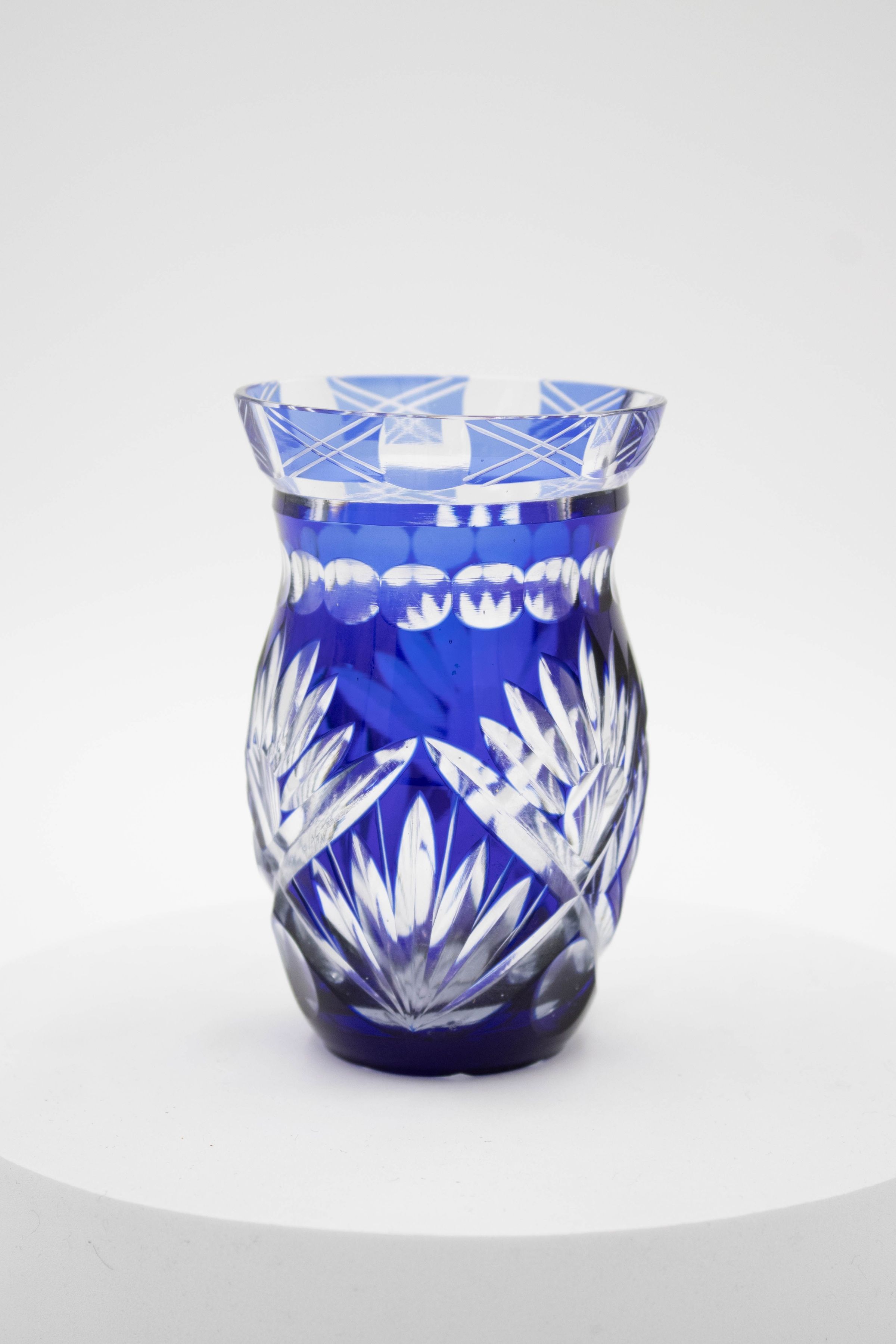 Small blue and clear cut crystal vase. It is decorated in a geometric Bohemian Czech-style with cobalt detail.Context