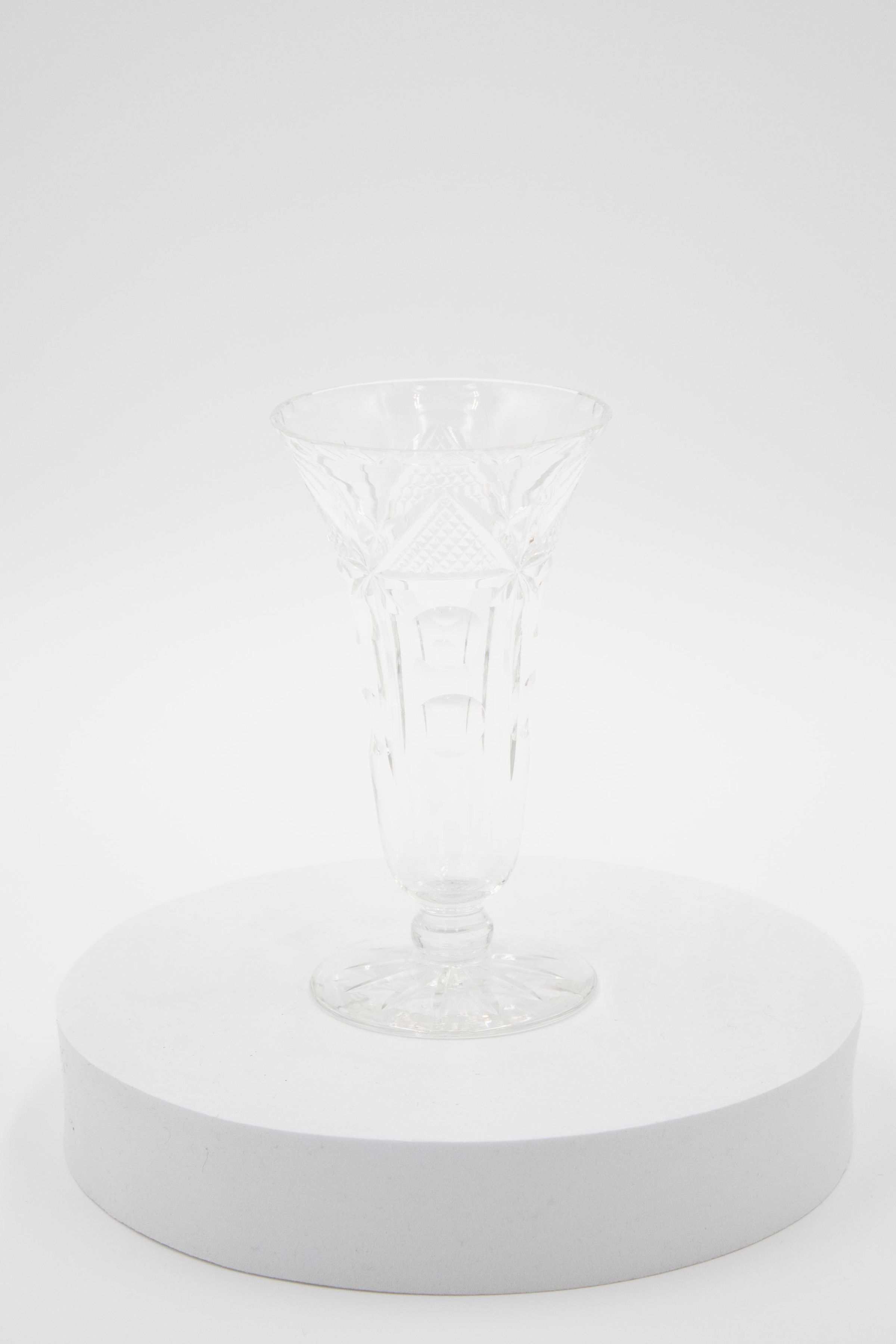 The small vase is made of cut crystal and decorated with geometric designs.Context